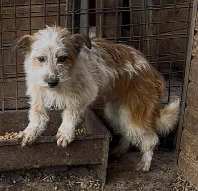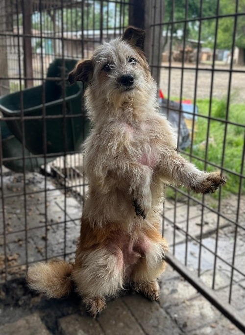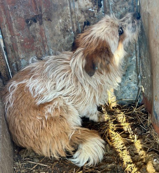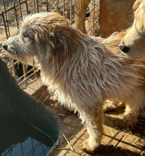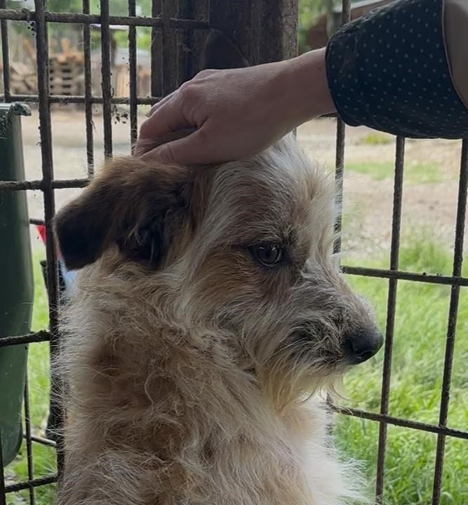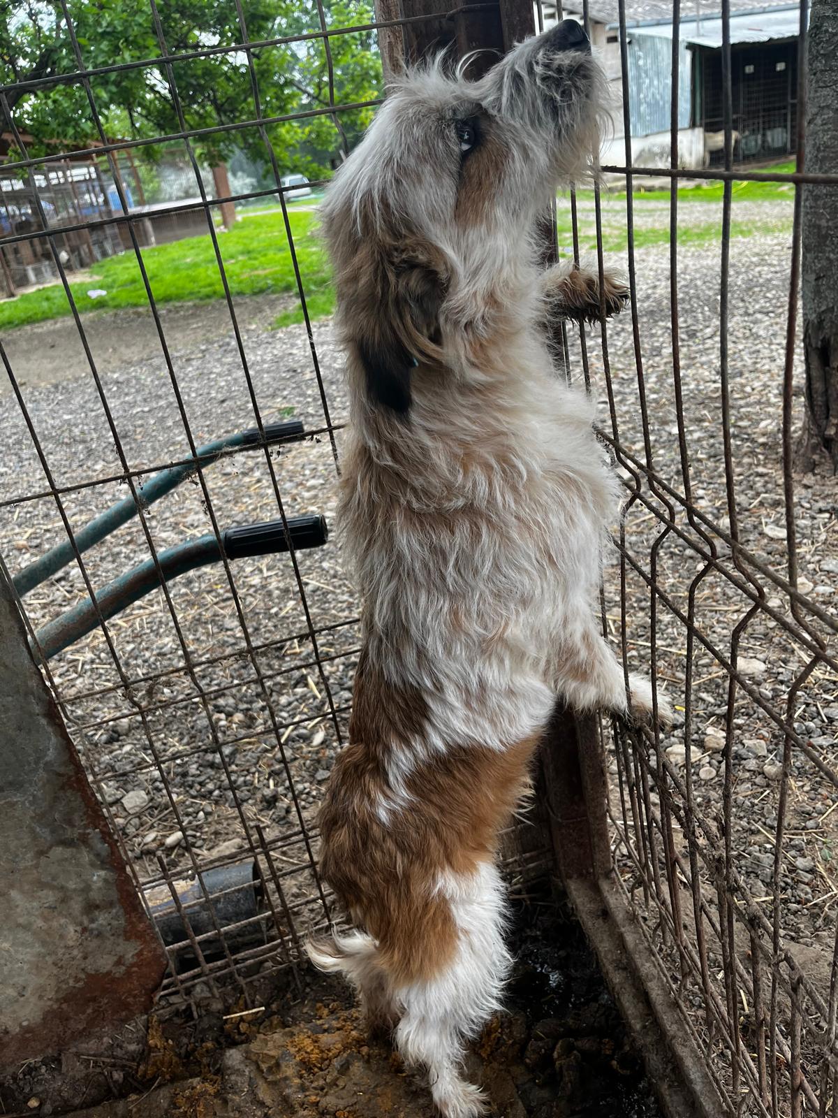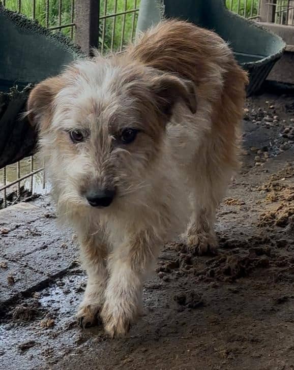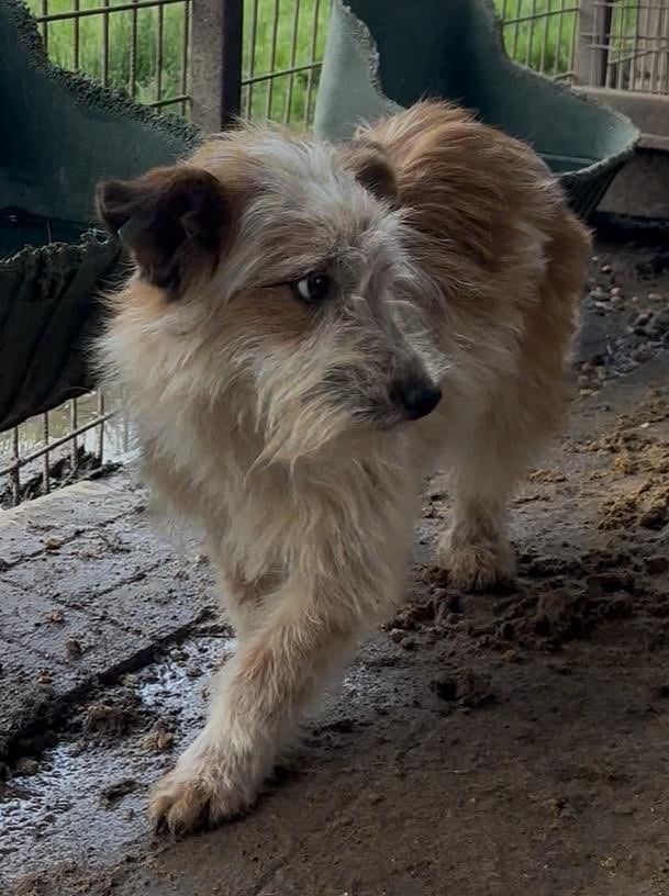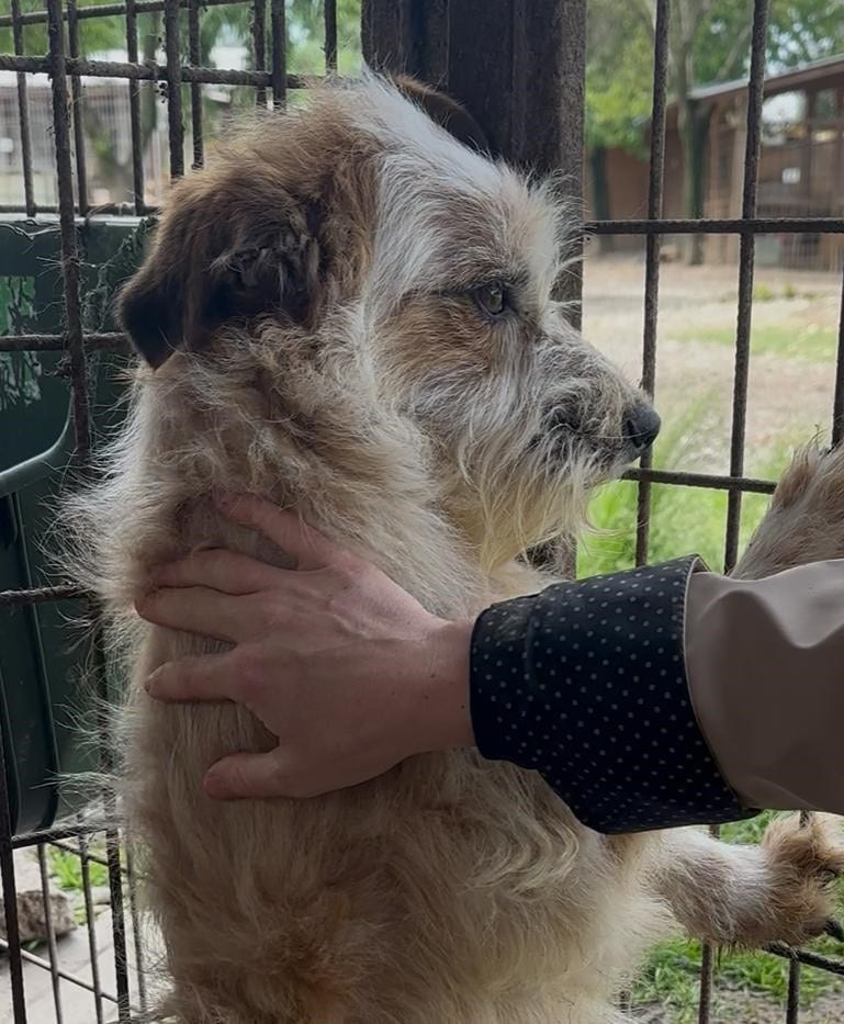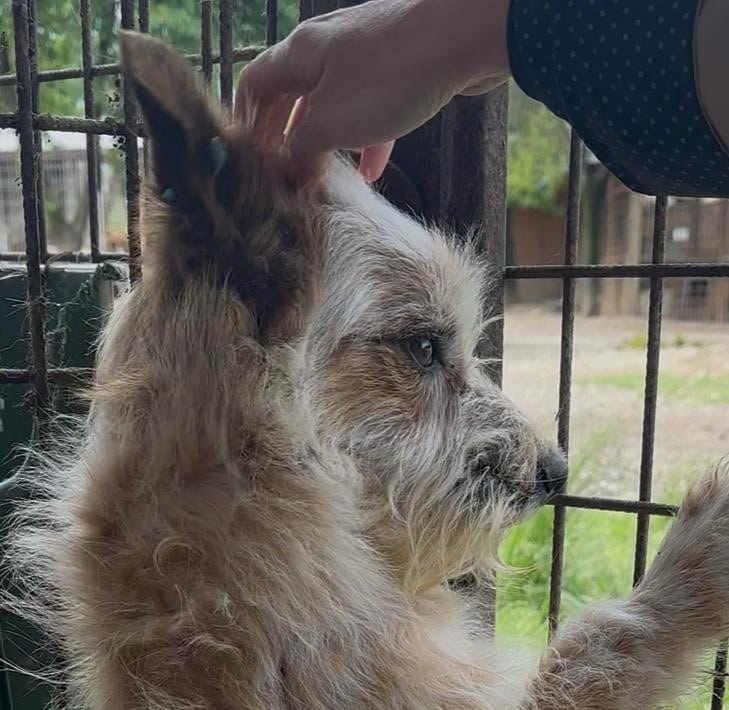 Als wir uns ihm vorsichtig näherten, ließ er sich in einer Ecke streicheln – es war deutlich spürbar, dass ihm diese Nähe noch sehr ungewohnt ist. Kiro ist der Kleinste in seinem Kennel, kommt dort aber gut zurecht und ist verträglich mit den anderen Hunden