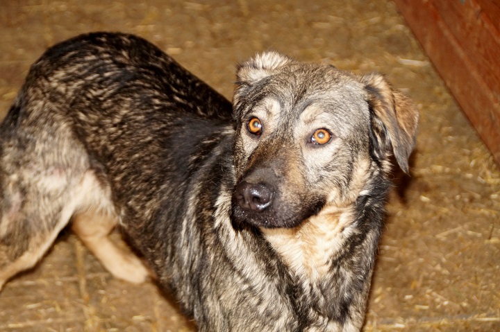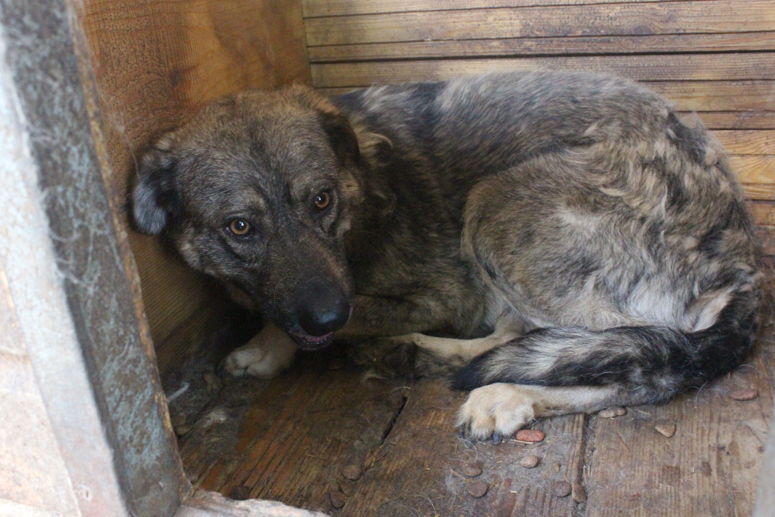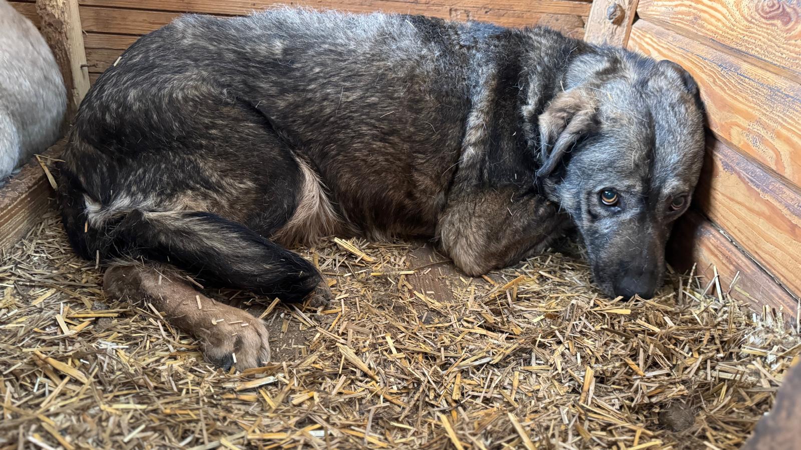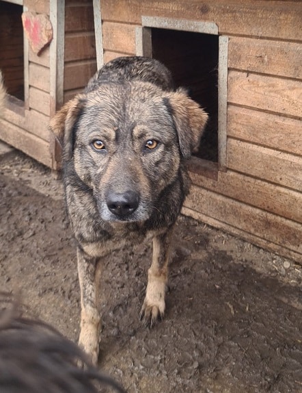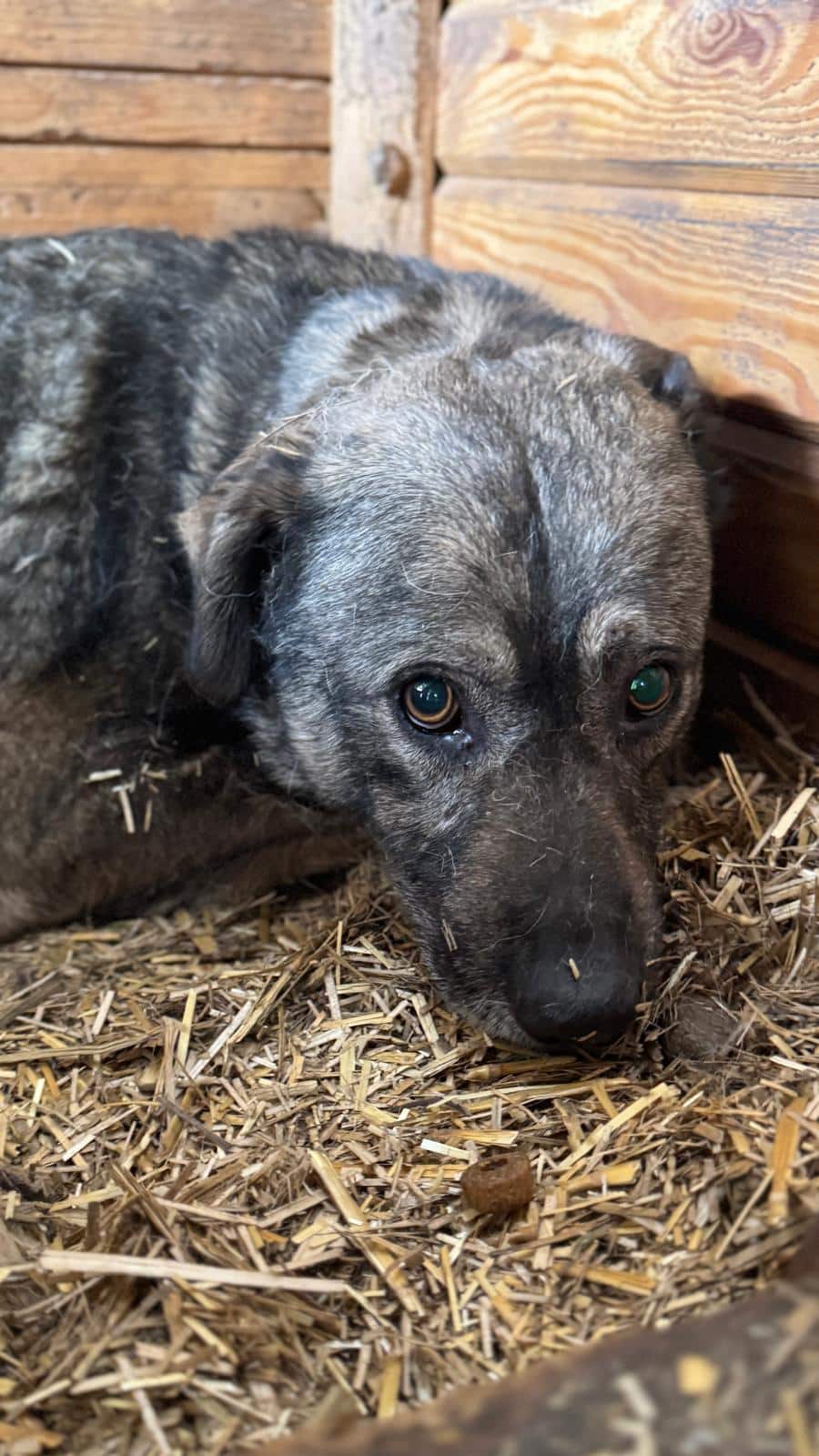 KLEIN VIOLA kam vorsichtig neugierig aus der Hütte, um zu schauen, wer wir sind und was wir in ihrem Kennel vorhaben. Wir konnten sie uns schnappen und festhalten, dabei blieb sie immer freundlich. Von allein kommt sie aber nicht zum Menschen.