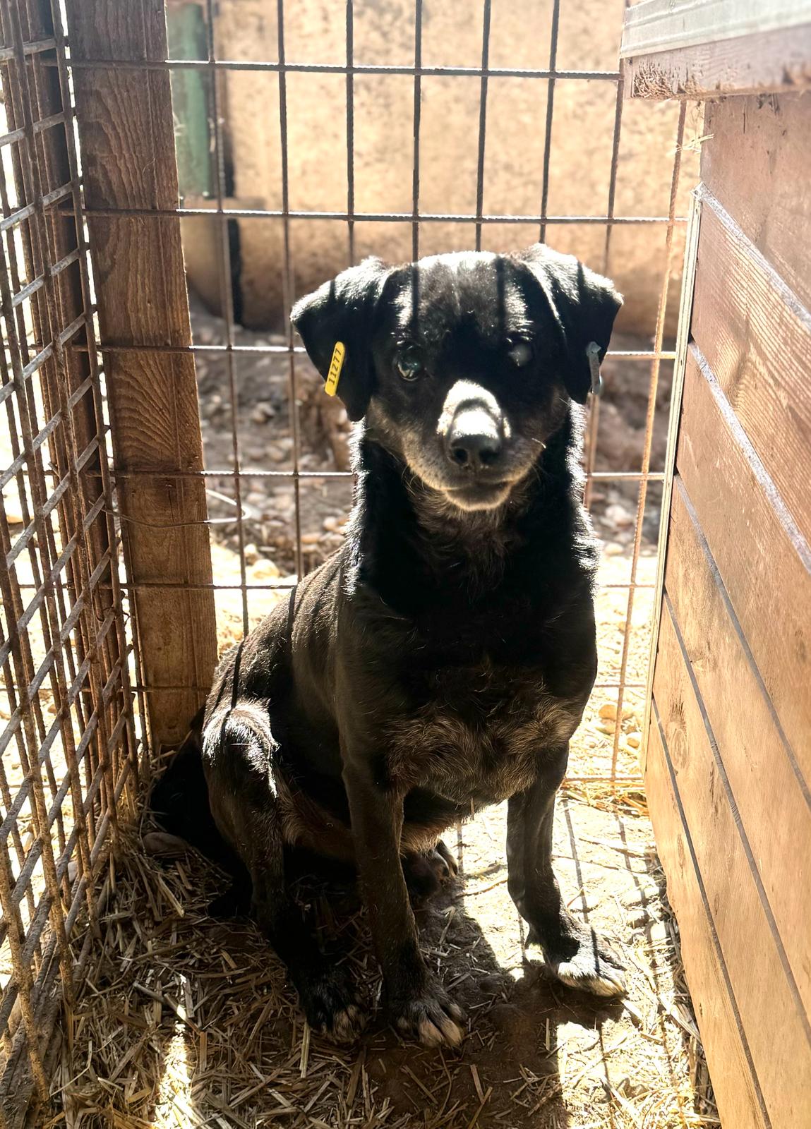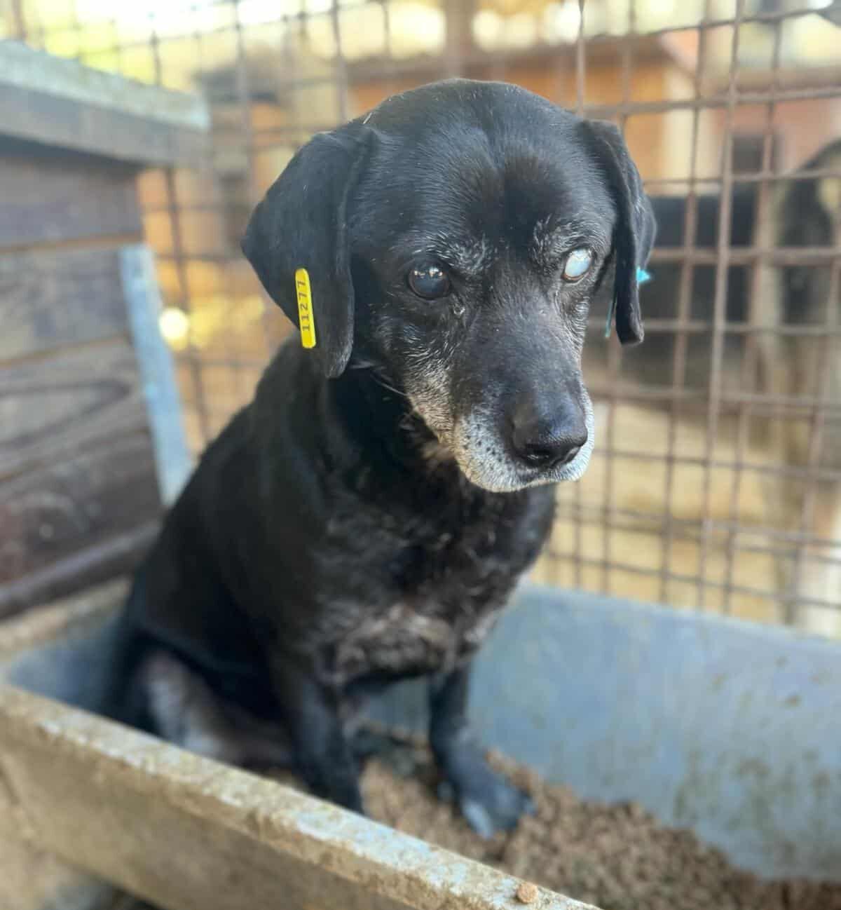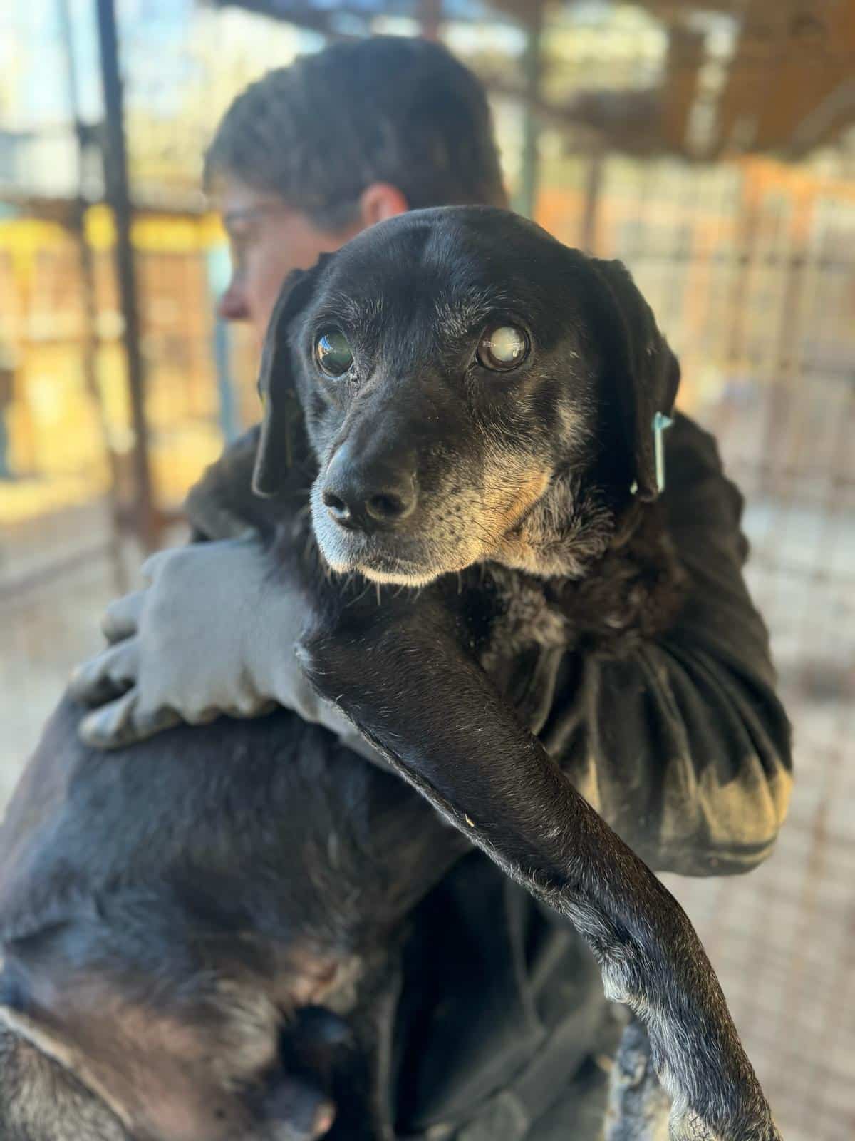 Diesen kleinen Rüden fanden wir am letzten Tag unseres Bucov-Aufenthaltes in einem der letzten Kennel. Er saß zusammengekauert in der hintersten Ecke und bei näherem Hinsehen stellten wir fest, dass er vermutlich blind ist. Aufgrund seiner Sehschwäche wirkt KNÖPFCHEN verunsichert und desorientiert. Trotzdem ließ er sich problemlos anfassen und streicheln. Auch unsere Leckerchen nahm er aus der Hand. Wir konnten ihn sogar auf den Arm nehmen. Er blieb in jeder Situation vollkommen defensiv.