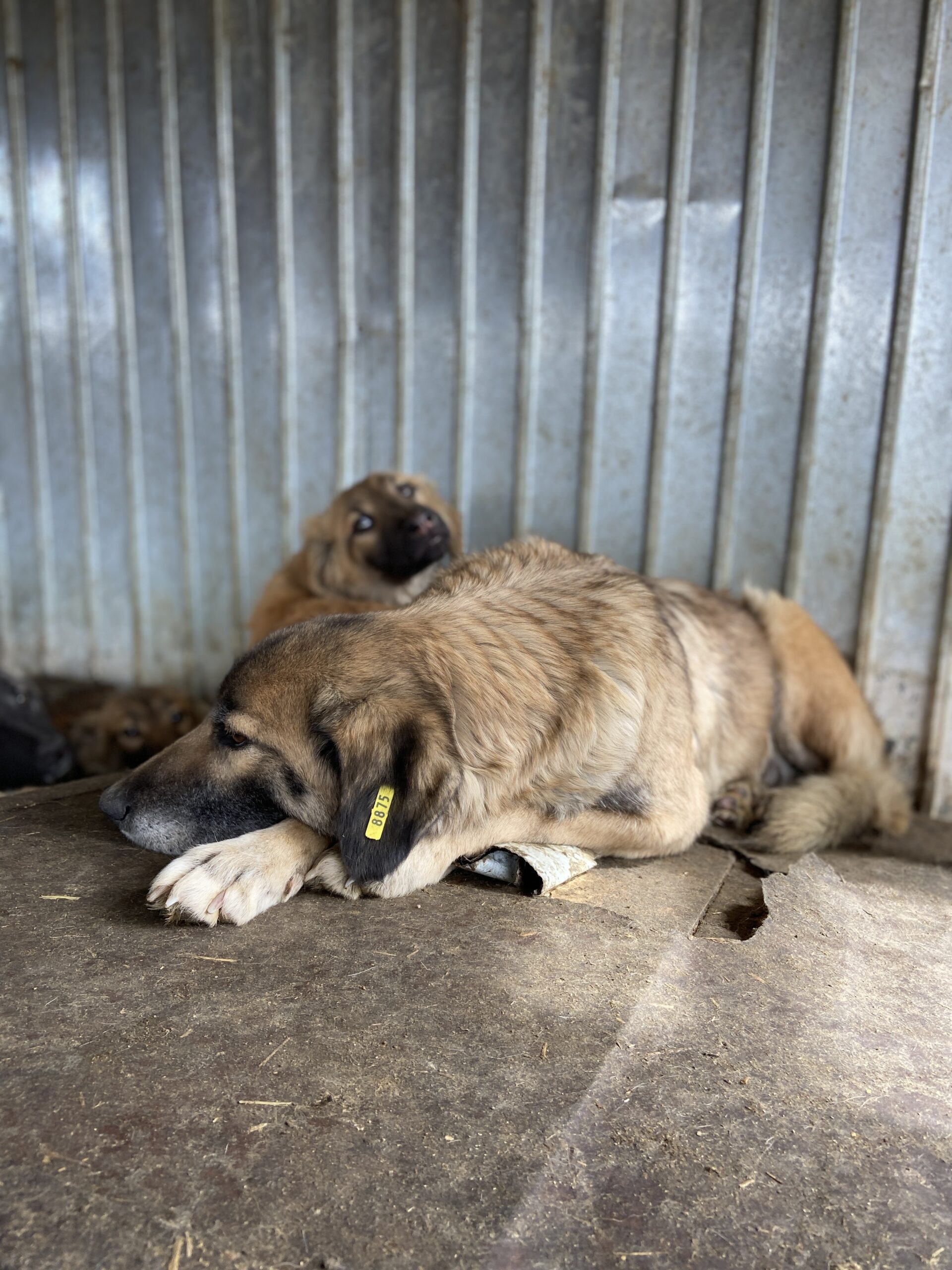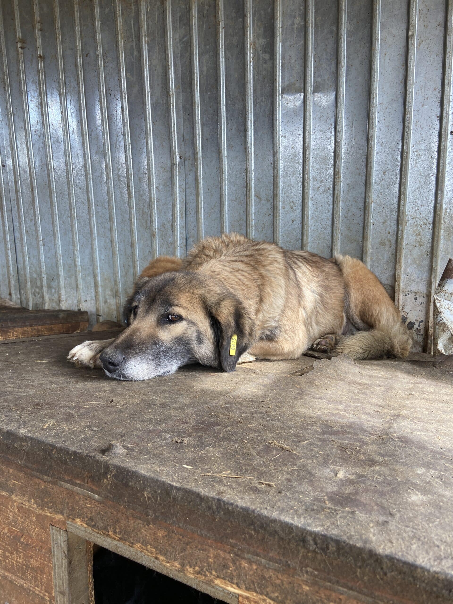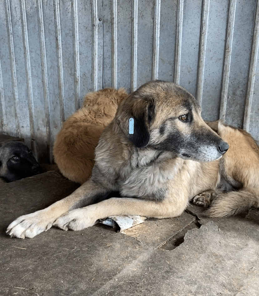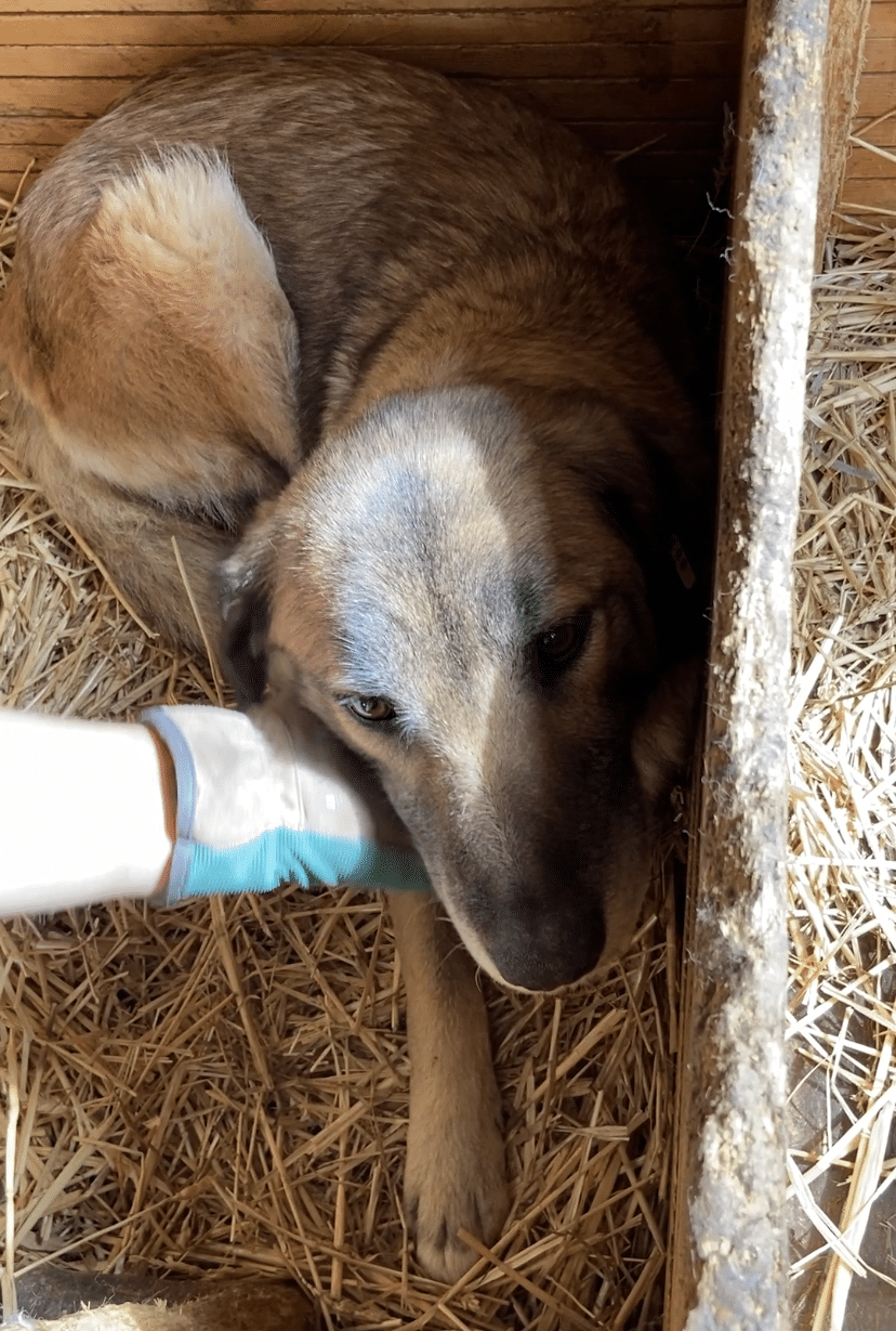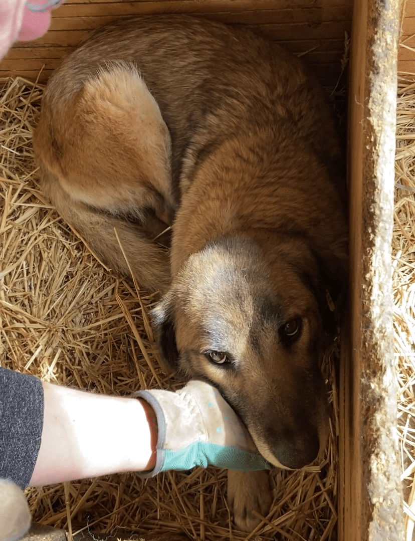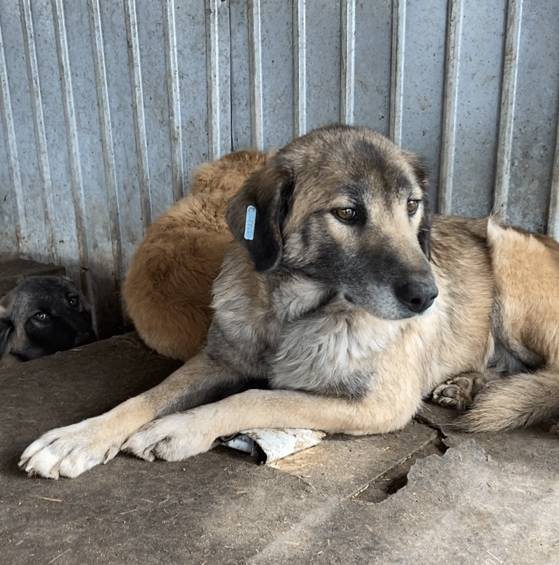 Diese liebe Hundemama ist noch ganz neu im Shelter und teilt sich einen Kennel mit ihren Welpen und vermutlich auch noch „fremden“ Hundekindern – insgesamt 12! Als wir ihn betraten, lag sie entspannt auf dem Hüttendach und hob nichtmal den Kopf. Unsere Nähe verunsicherte sie erst, als wir sie streicheln wollten. Dann stand sie auf und legte sich in eine Hütte. Dort konnten wir sie problemlos überall anfassen, wir merkten jedoch auch, dass sie es überhaupt nicht genießen kann. In einem ruhigen Zuhause mit viel Geduld und vielleicht sogar einem souveränen Ersthund kann diese liebe Hündin sicher schnell auftauen und Vertrauen fassen.