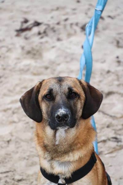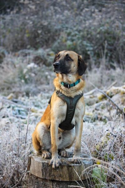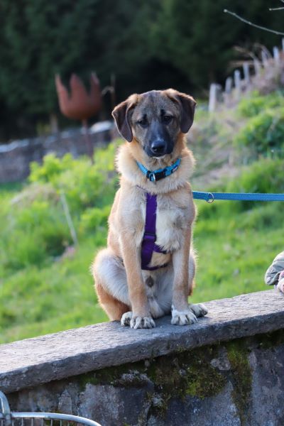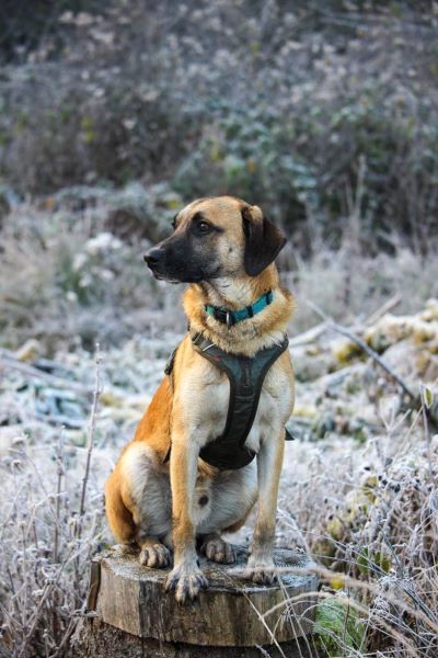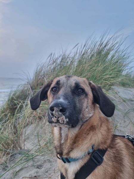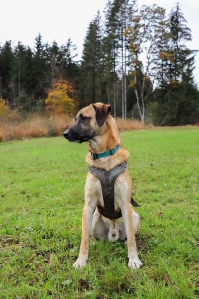 Kyson reagiert bei Hundebegegnungen noch etwas unsicher, deswegen wäre ein Besuch in der Hundeschule sinnvoll.