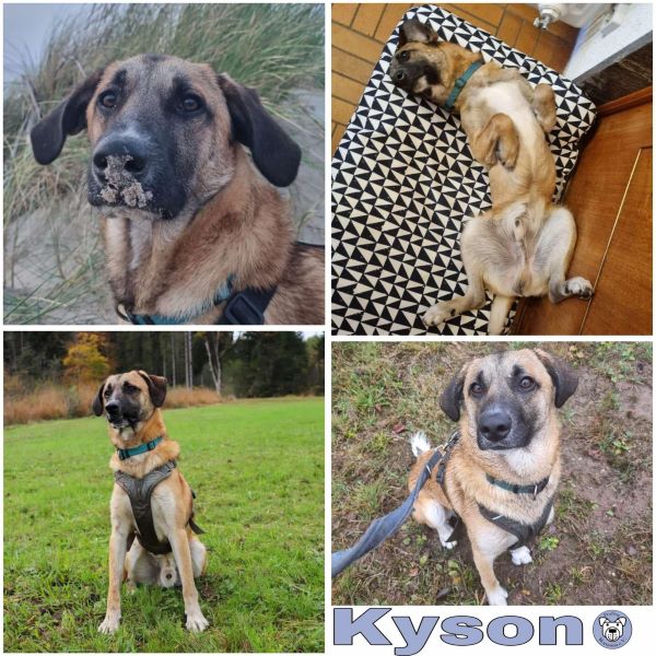 Kyson ist ein liebevoller, aufgeweckter und verspielter Junghund, der nur gefallen möchte. Er liebt Kinder und verträgt sich gut mit anderen Artgenossen. Kyson ist sehr lernwillig und beherrscht die Grundkommandos Sitz, Platz und Bleib. Außerdem ist er bereits stubenrein.