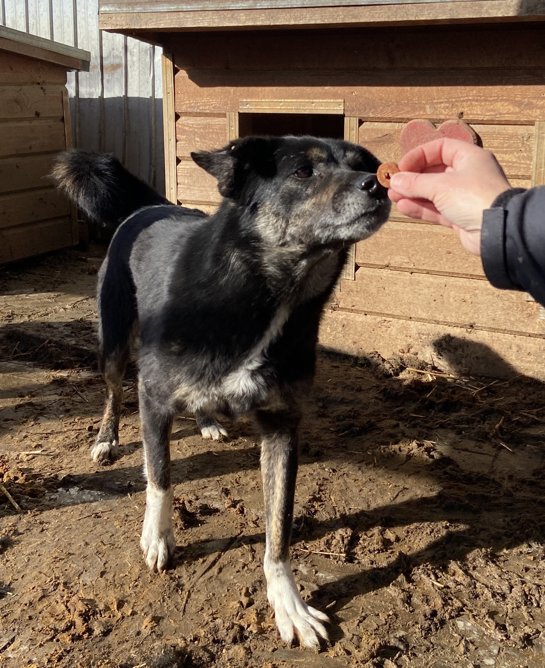 LAKOTA fand unseren Besuch ganz angenehm. Alt sieht sie mittlerweile aus. Das Shelterleben zeichnet sie sehr. Neugierig nahm sie unsere Leckerchen aus der Hand und war immer in unserer Nähe