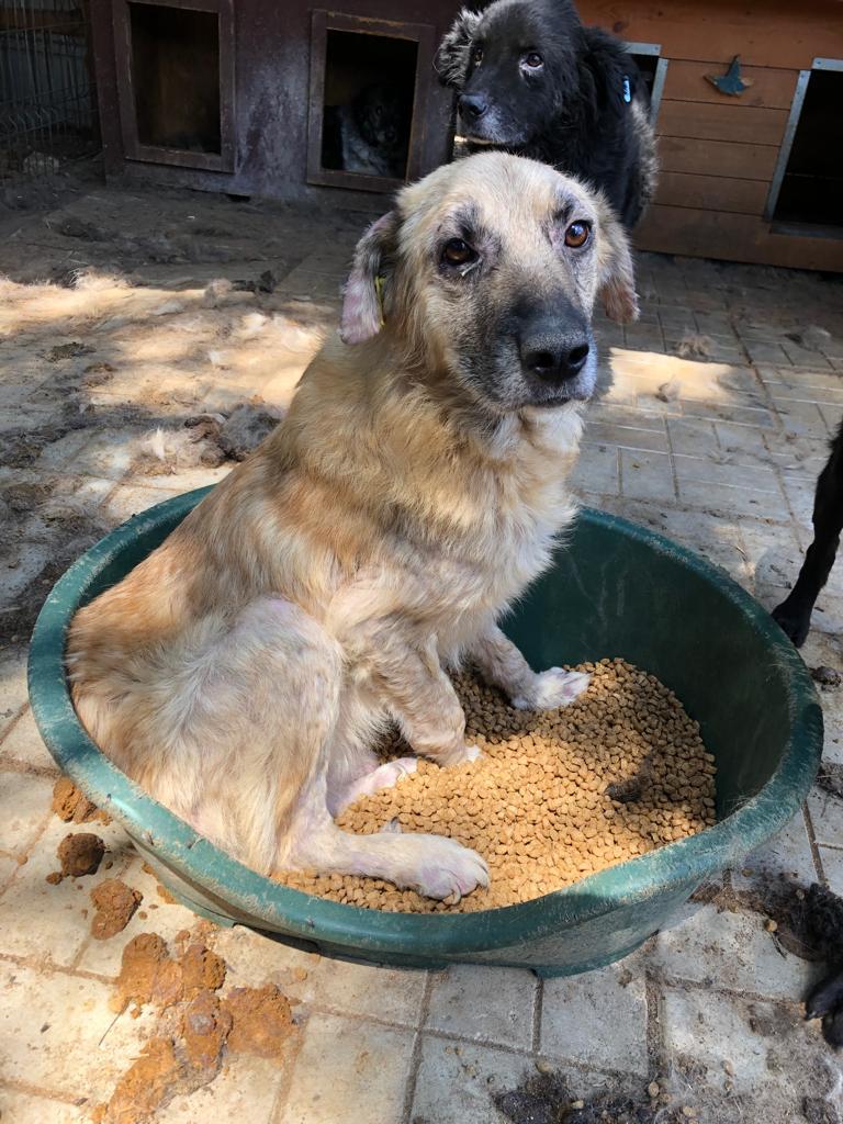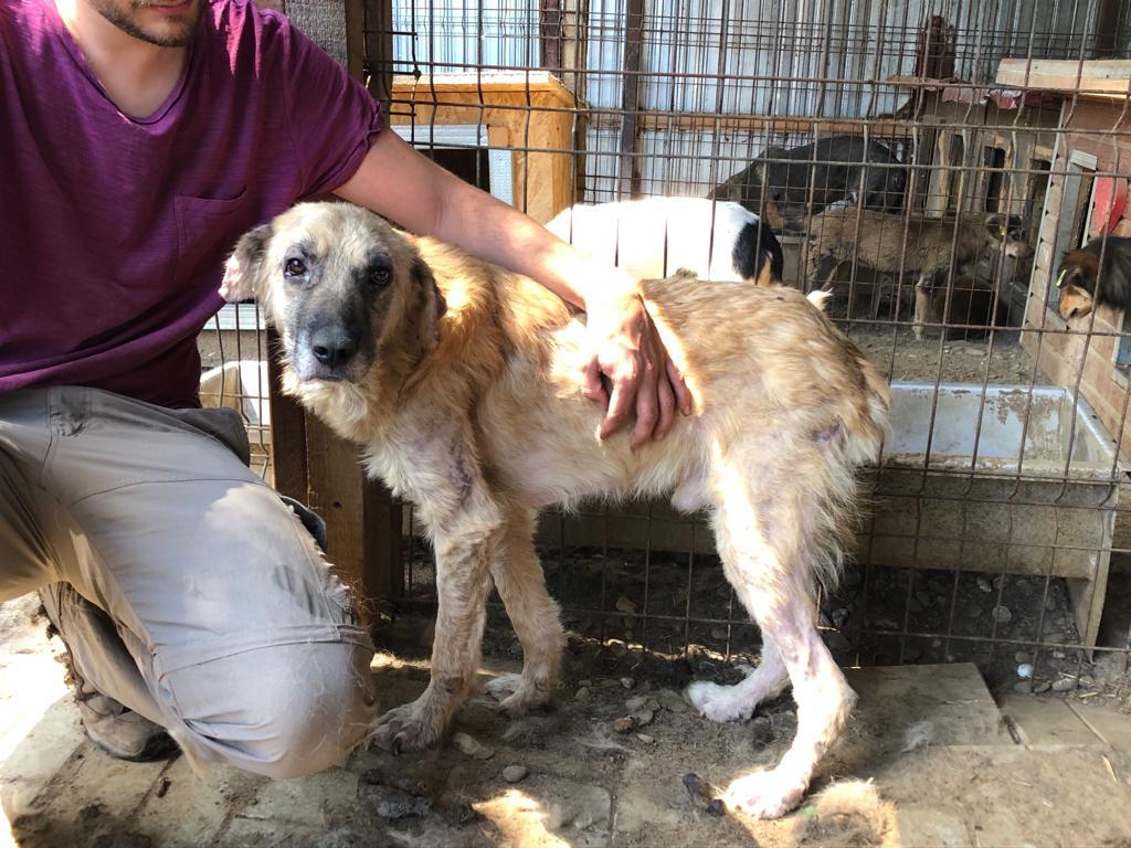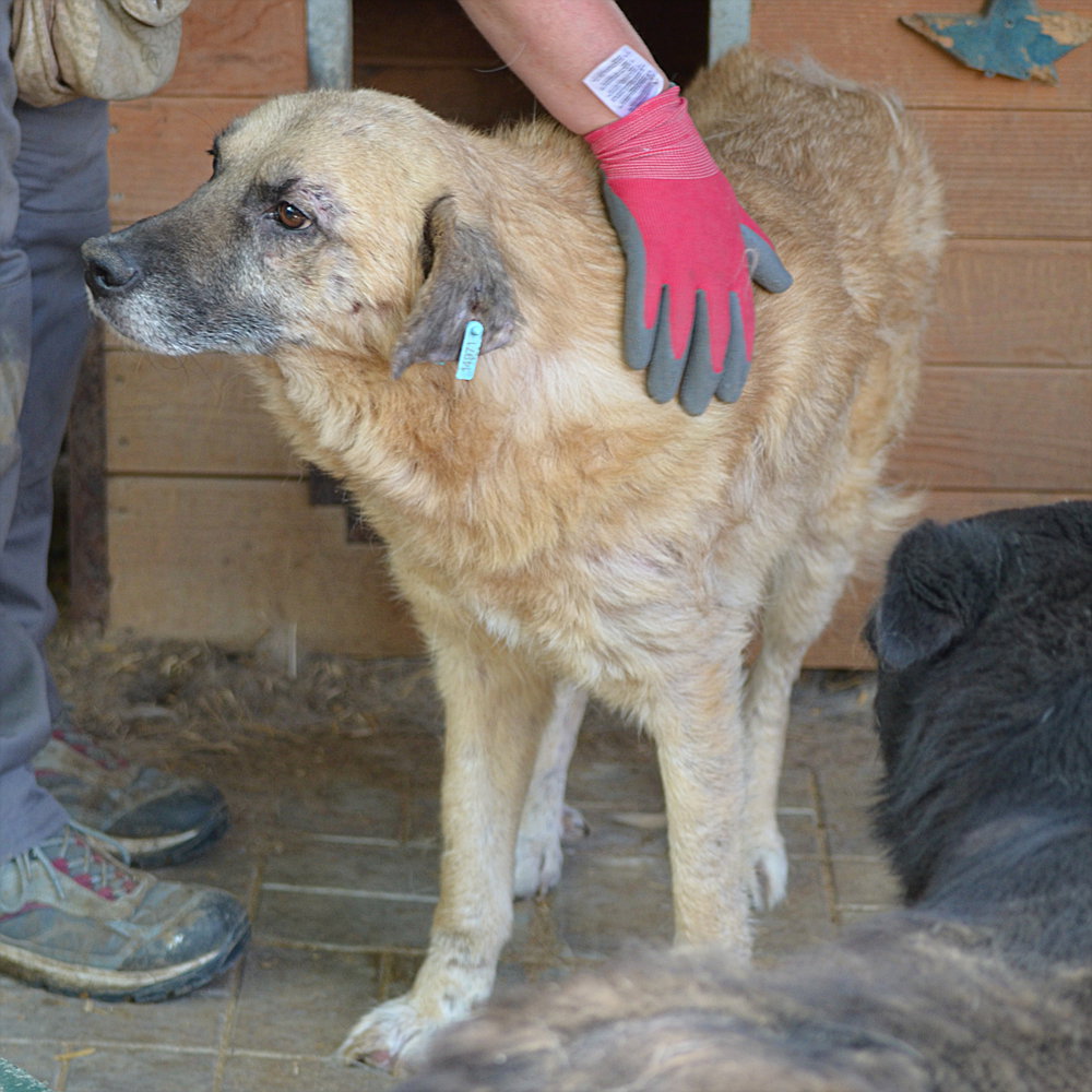 LASLO hat stark abgebaut und ist zum Notfall geworden. Er war zunächst in seiner Hütte, kam dann aber sehr zutraulich auf uns zu. Ist aufgeschlossen und nahm unsere weichen Leckerlis in Massen. Er ist komplett abgemagert.