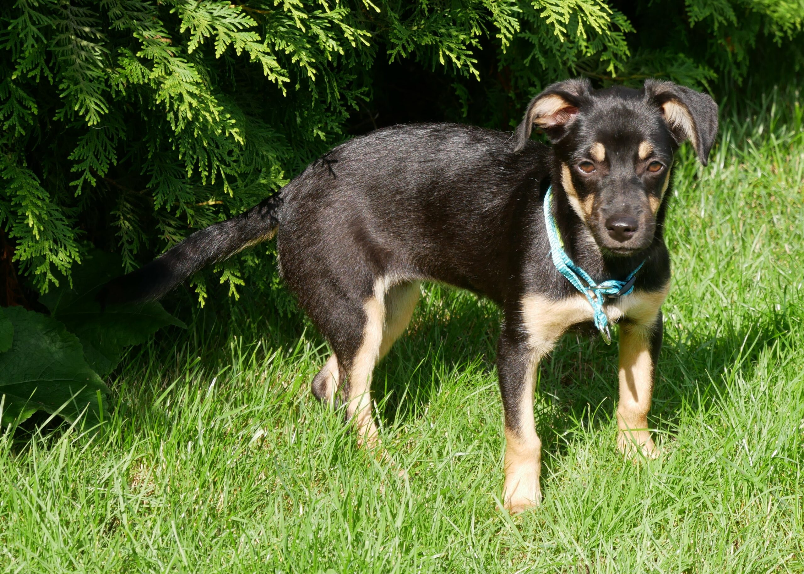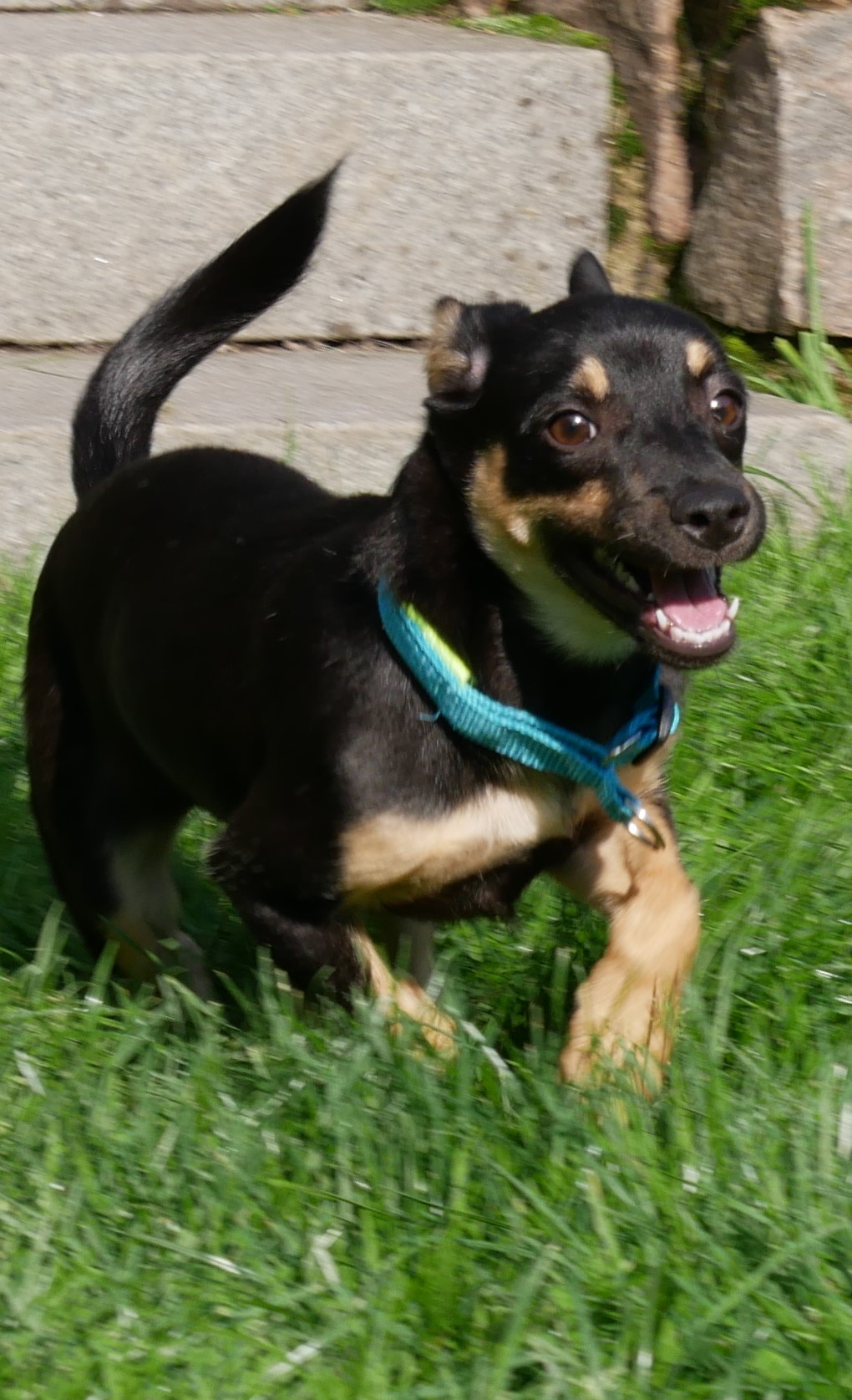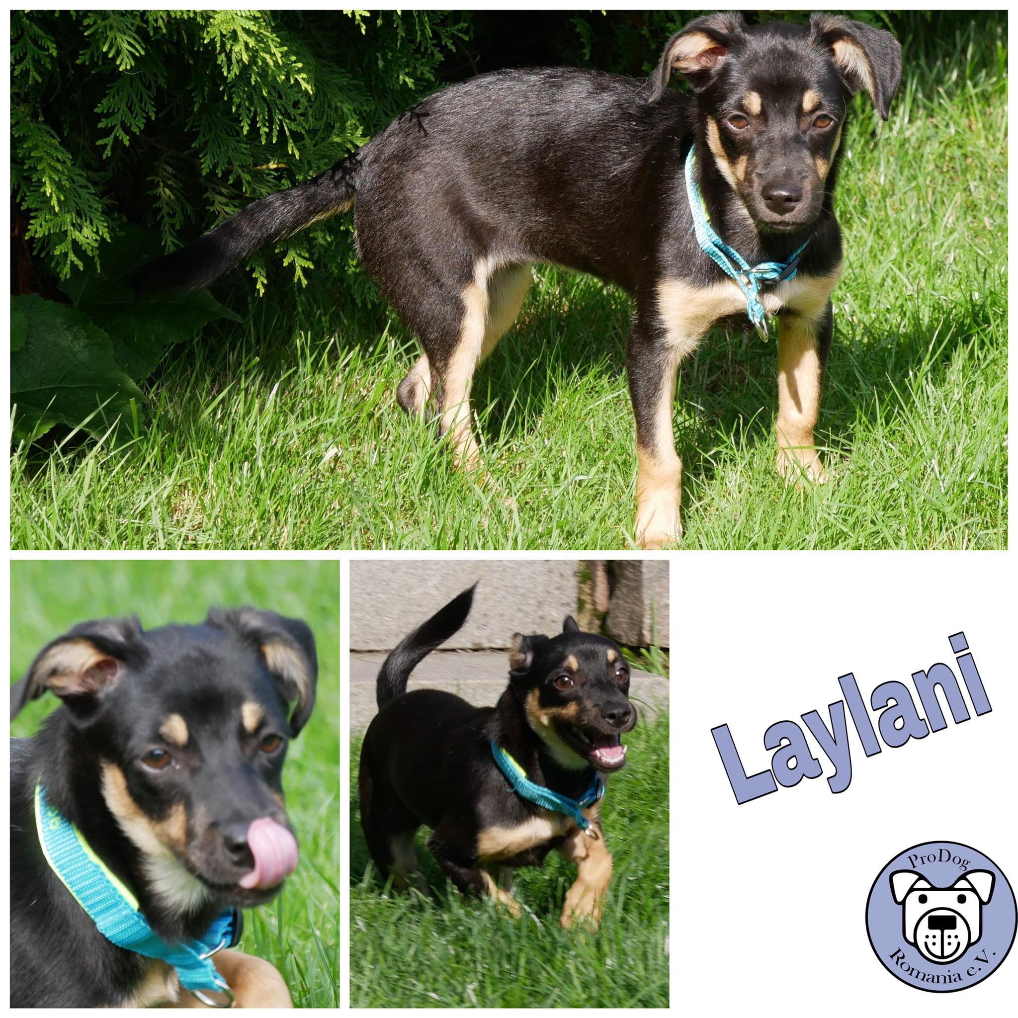 Wie ihre Kumpeline Jelly, hat auch Laylani möglicherweise dackelige Gene in sich. Dabei ist ihr Körper aber deutlich zarter als der von Jelly. Ein glattes, schwarz glänzendes Fell mit braunen Abzeichen und weißem Latz geben ihr Anmut und Schönheit. Die Ohren seitlich kippend und die Rute gerade und hoch erhoben, eilt sie mit winzigen Tippelschritten dem Pflegefrauchen überall hinterher.
