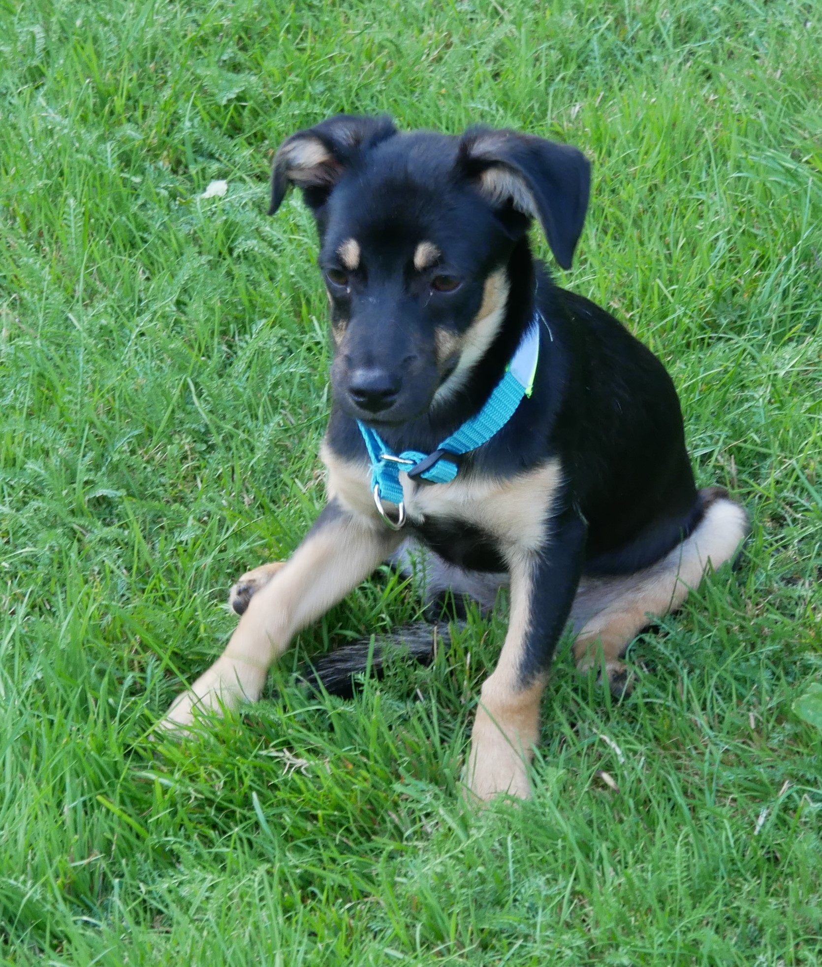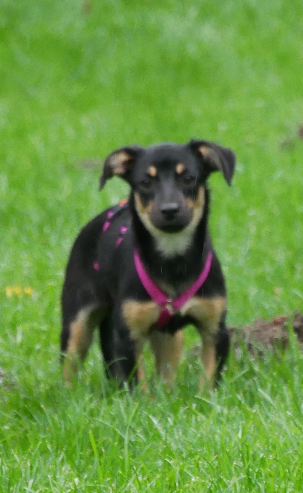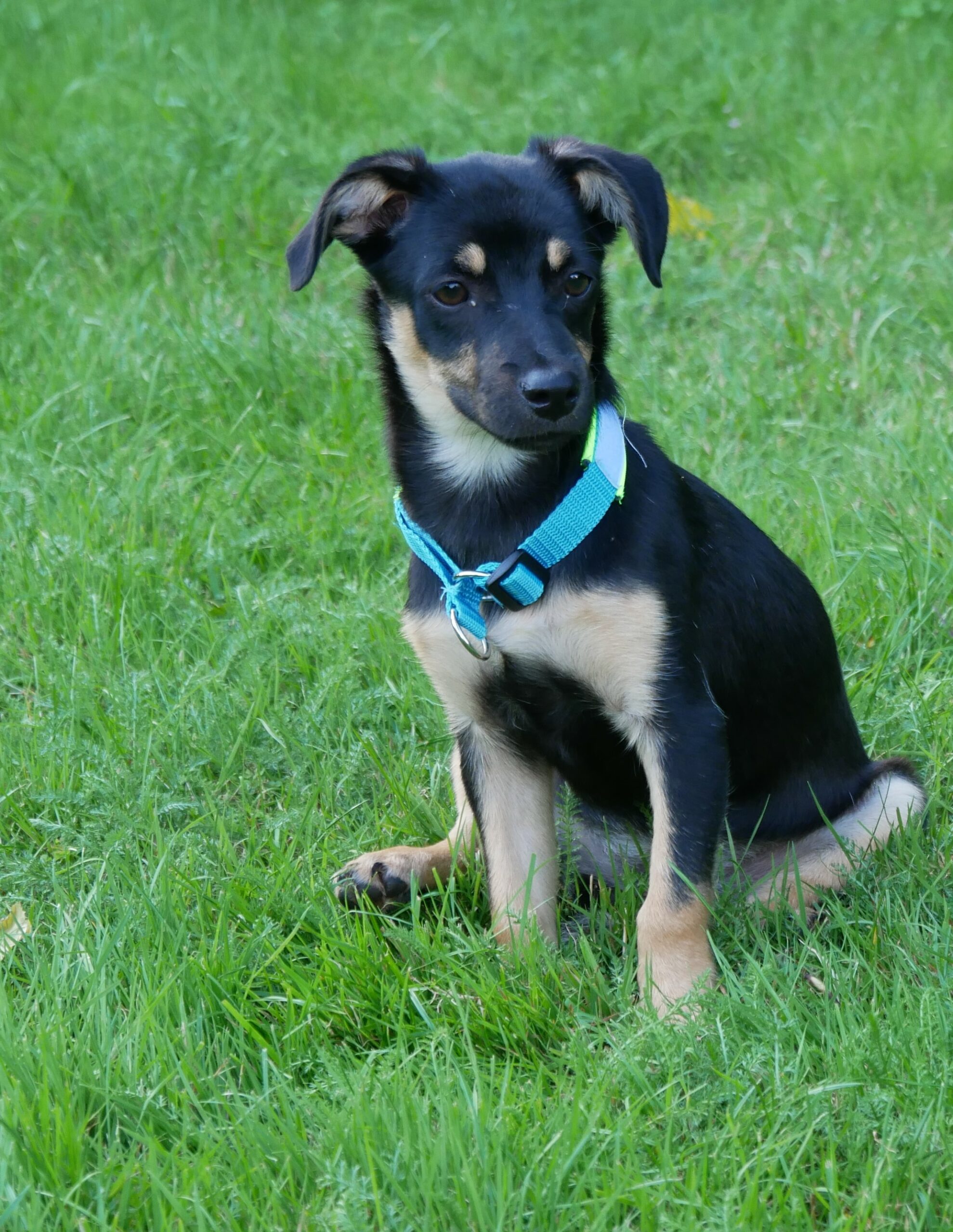 Wie ihre Kumpeline Jelly, hat auch Laylani möglicherweise dackelige Gene in sich. Dabei ist ihr Körper aber deutlich zarter als der von Jelly. Ein glattes, schwarz glänzendes Fell mit braunen Abzeichen und weißem Latz geben ihr Anmut und Schönheit. Die Ohren seitlich kippend und die Rute gerade und hoch erhoben, eilt sie mit winzigen Tippelschritten dem Pflegefrauchen überall hinterher.