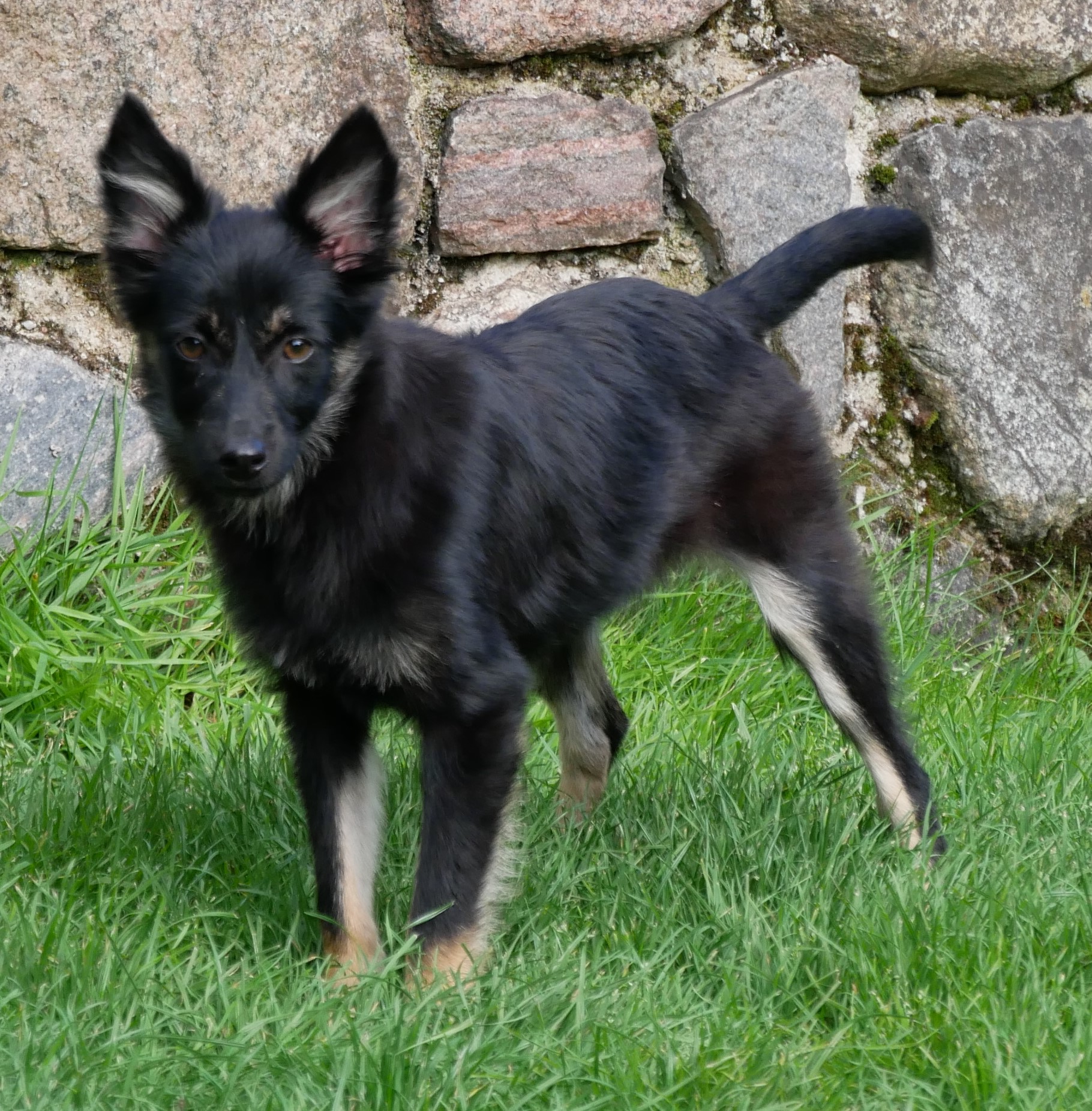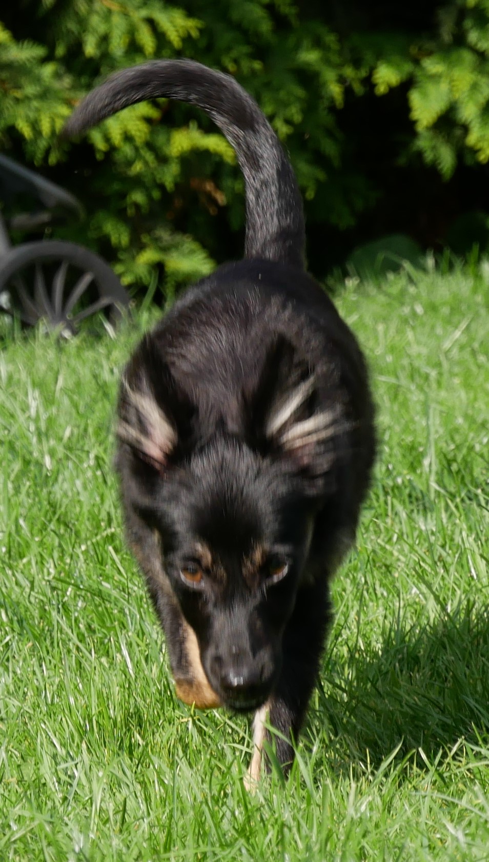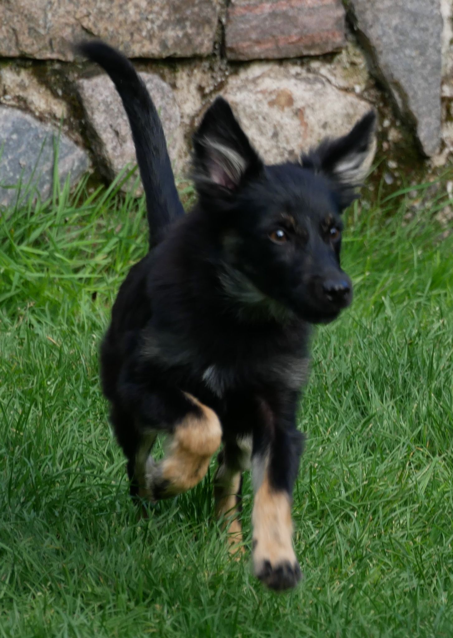 Schäferhund-MischlingWeiches längeres Fell, schwarz mit braun abgesetzt, Stehohren und langer Rute leicht gebogen