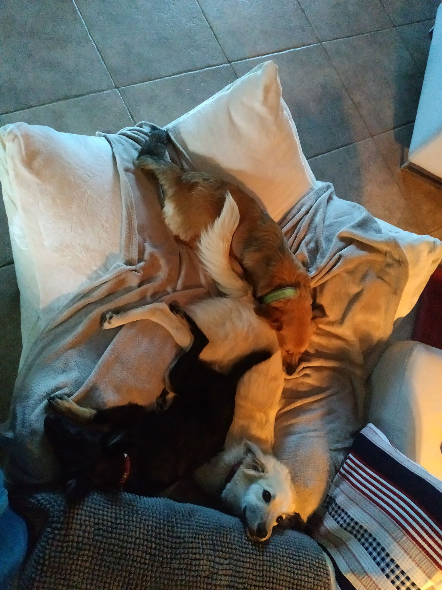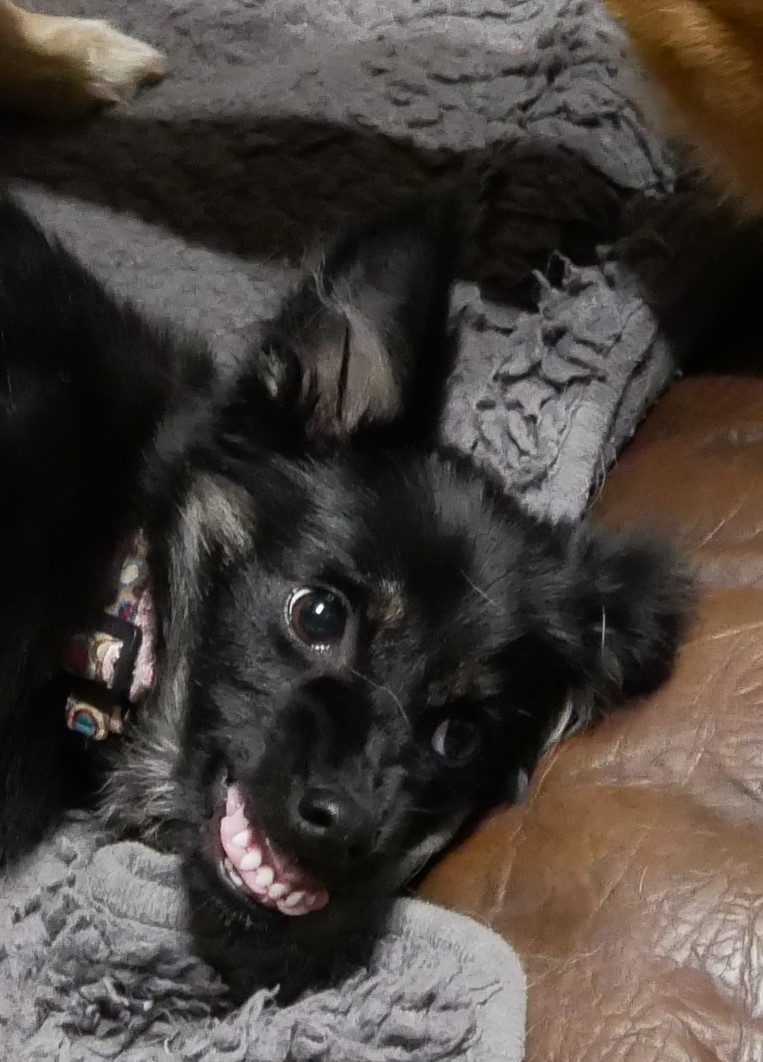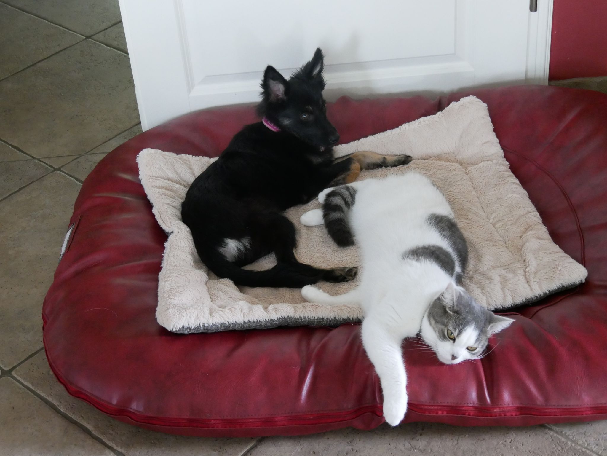Sie kommt hier mit allen Hunden und auch den Katzen gut klar. Ab und zu versucht sie noch, die anderen wegzudrängen, begreift aber auch, dass sie teilen muss. Morgens beim ersten Kaffee und abends beim fernsehen liegt sie nun friedlich mit den anderen zusammen beim Pflegefrauchen auf dem Kuschelstern und lässt sich das Bäuchlein kraulen.