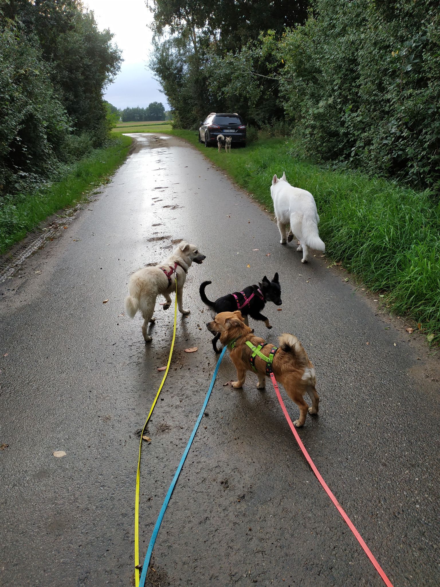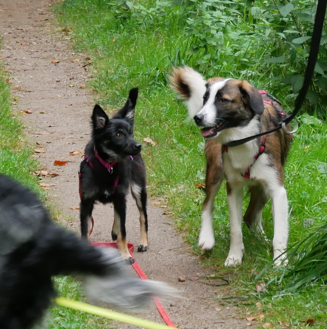 Autofahren klappt problemlos und sie ist gerne überall dabei. Das Gassigehen muss noch geübt werden; anfangs lässt sich die Prinzessin tragen, später läuft sie auch ein paar Schritte, das ist aber noch ausbaunötig. Sie mag das Geschirr und die Leine nicht, zuppelt immer dran rum. Wir arbeiten dran.