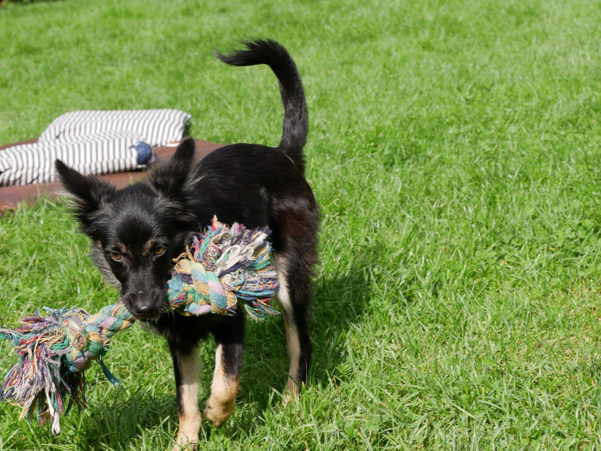 Sie mag Bällchen und fängt an zu apportieren. Ihr schlaues Köpfchen braucht Auslastung; sie wäre bestimmt eine perfekte Kandidatin für Rettungshundearbeit oder ManTrailing oder Agility.
