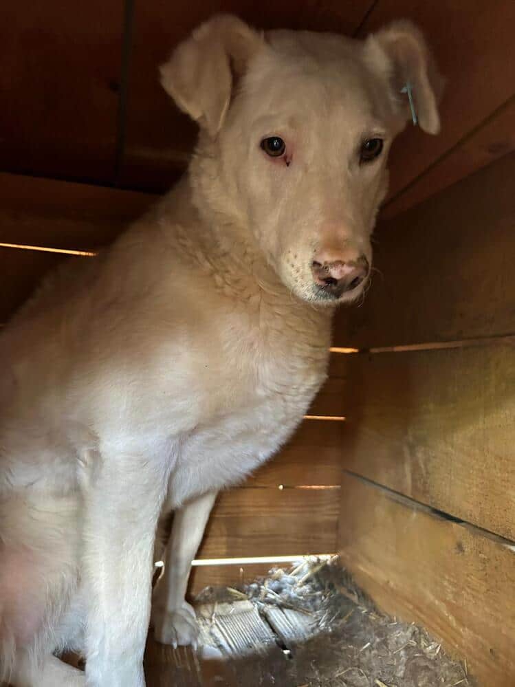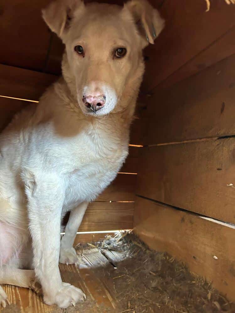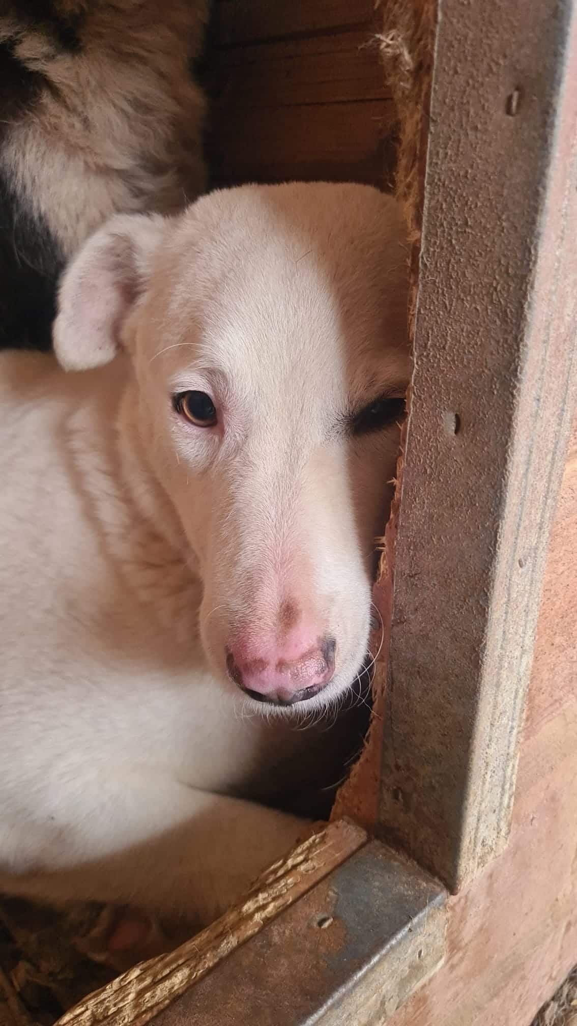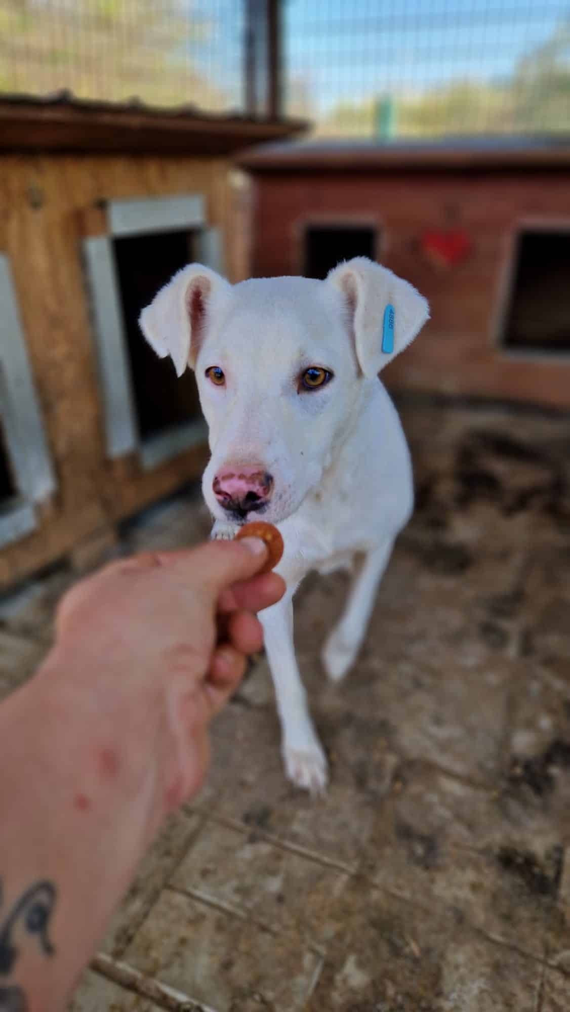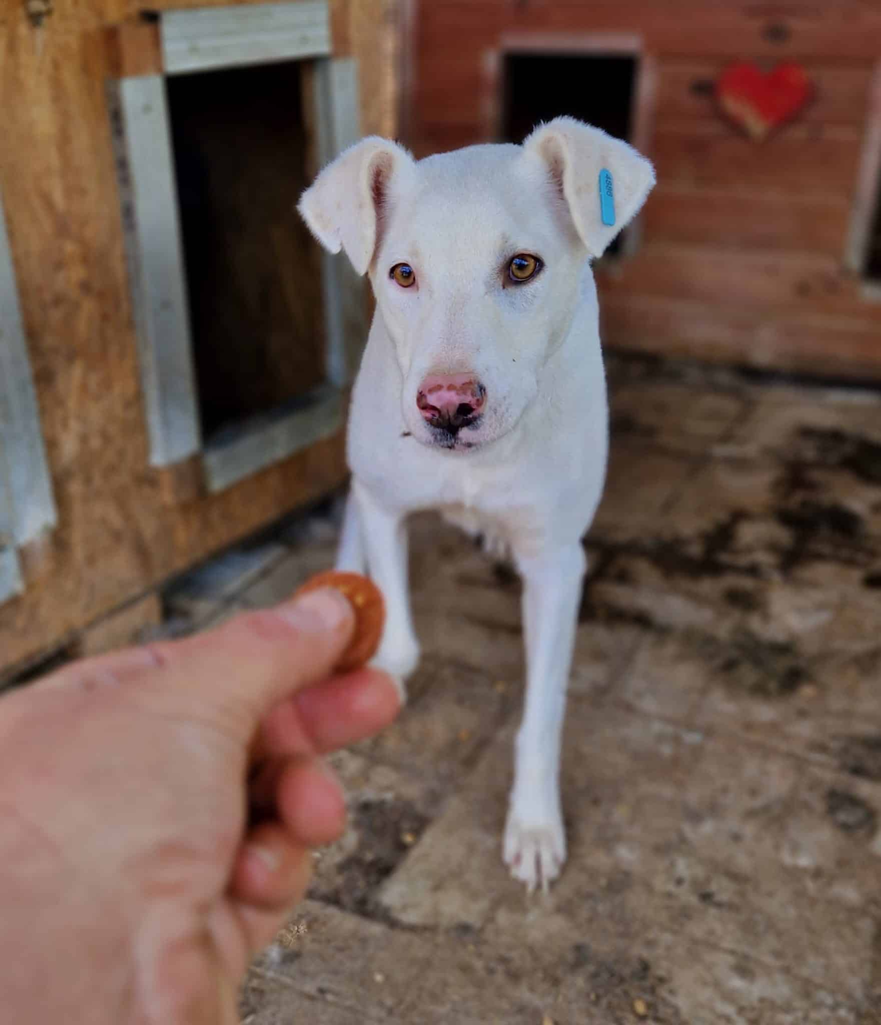 Die wunderhübsche LELO, deren Fell mittlerweile nicht mehr so strahlend weiß ist, hofft seit fast 4 unvorstellbar langen Jahren im riesigen Shelter auf ihre Chance. Sie war auch bei diesem Besuch die Mutigste in ihrem Kennel. Neugierig beobachtete sie uns zunächst, doch als wir auf sie zu gingen, suchte sie Schutz in der sicheren Hütte. Dort nahm LELO vorsichtig die mitgebrachten Leckerlie und ließ sich behutsam berühren. Diese intensive Nähe kennt sie einfach nicht, weshalb diese ungewohnt für sie ist. Nach Möglichkeit weicht LELO aus, doch wir sind uns sicher, dass sie in einer stressfreien Umgebung bei sehr erfahrenen und einfühlsamen Menschen weiter Fortschritte machen wird. Ihre grundlegend neugierige Art sowie ihre Vorliebe für Leckereien werden ihr dabei helfen, Stück für Stück Vertrauen zu fassen. Von einem netten Ersthund würde sie sicher profitieren. Wir wünschen LELO diese große Chance nach all der verlorenen Zeit sehr.