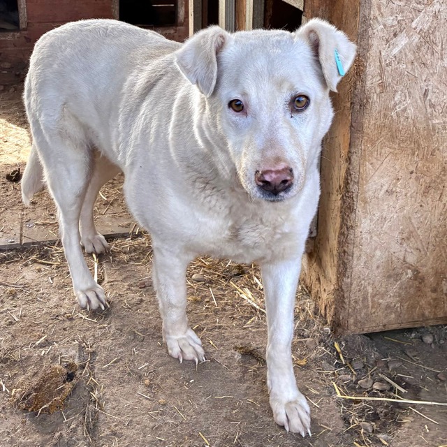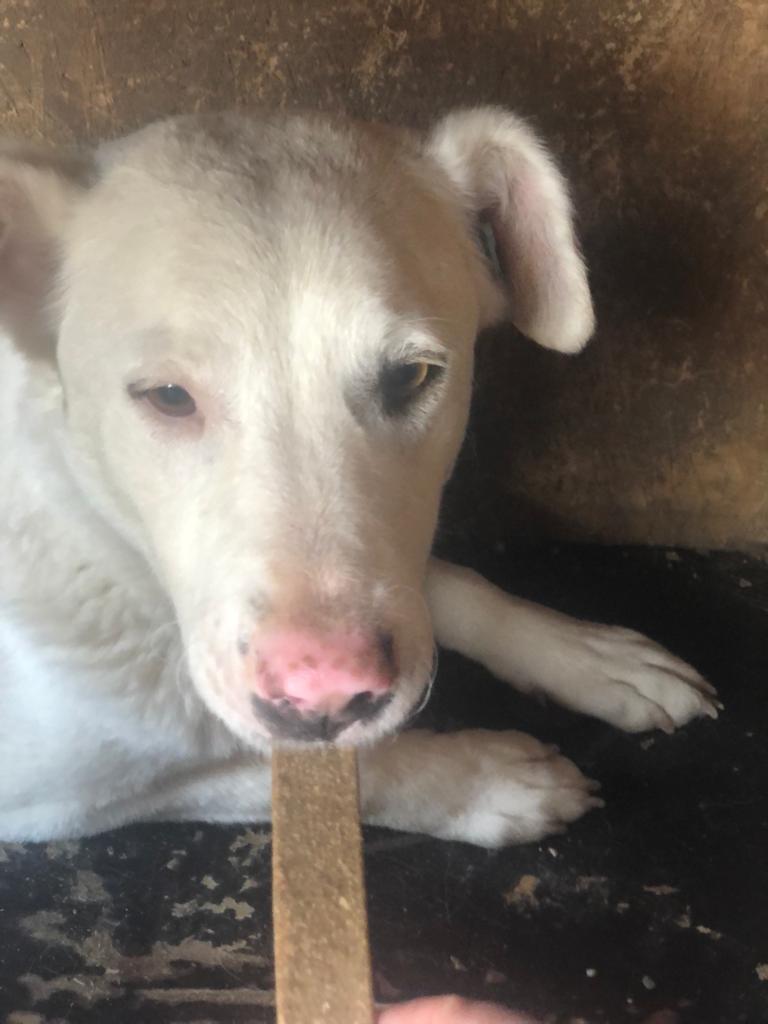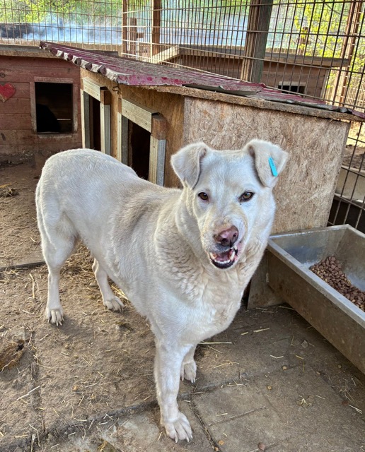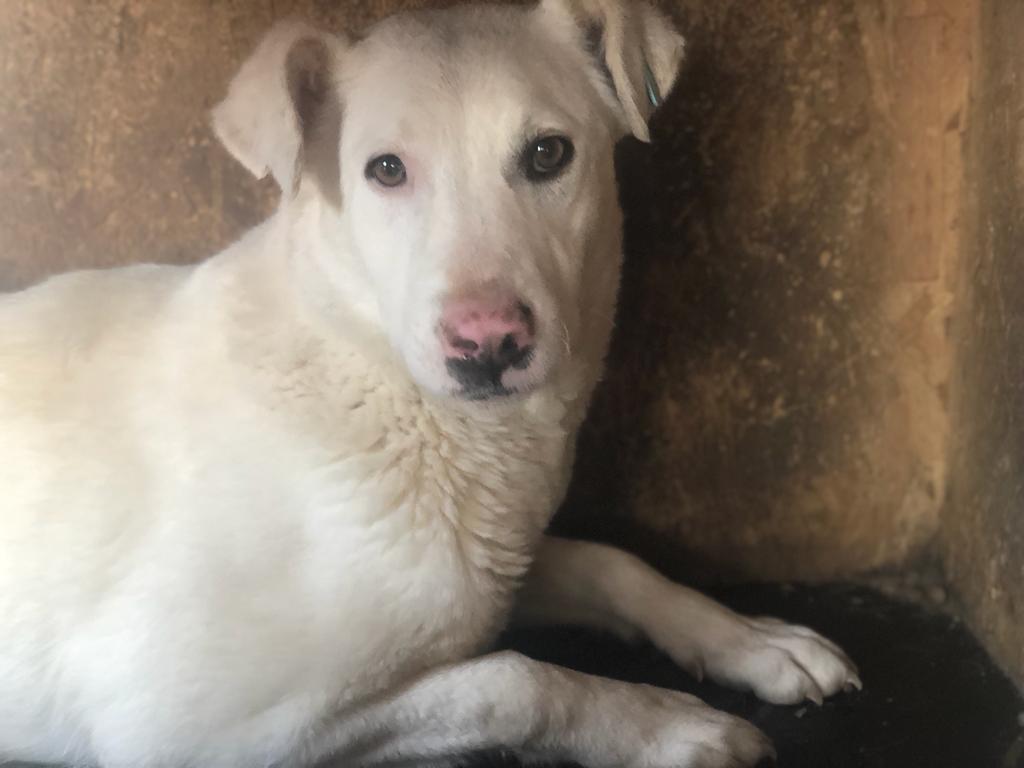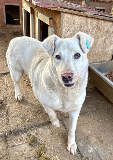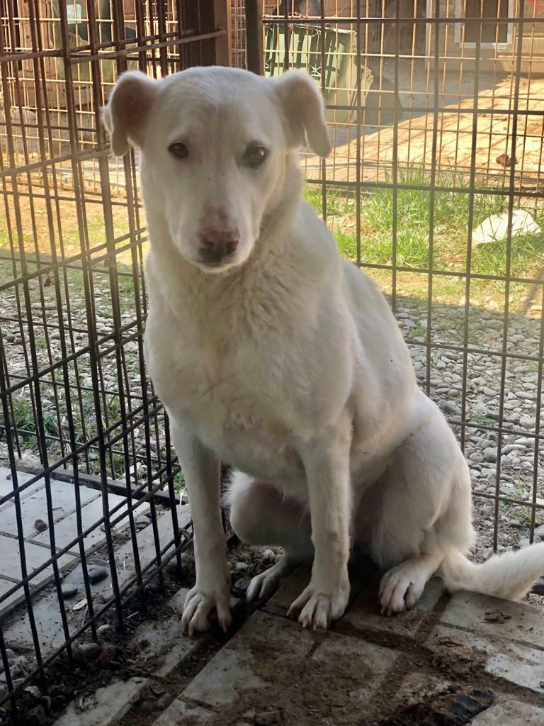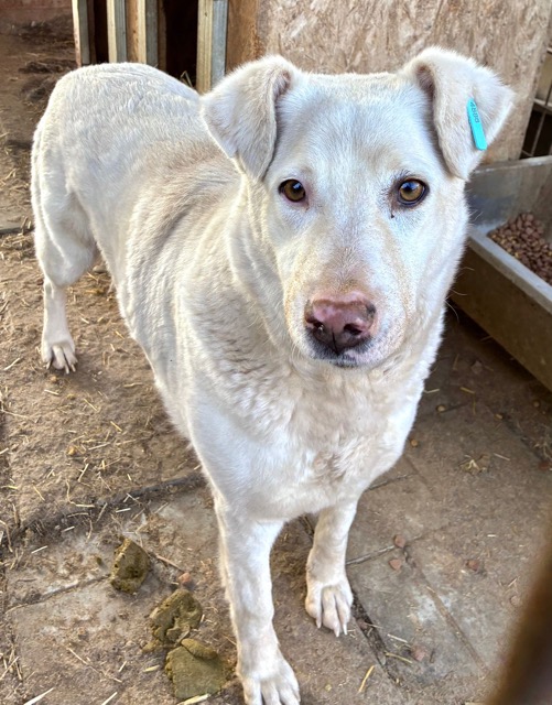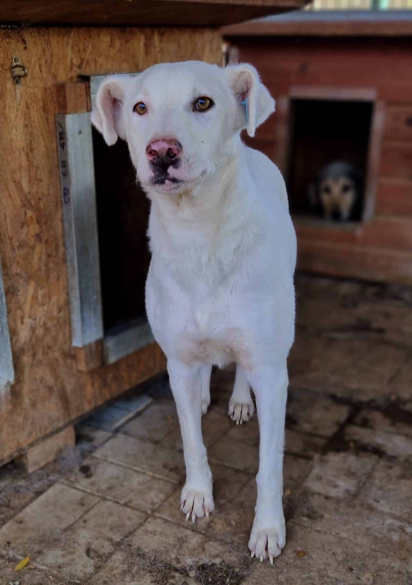 Die wunderhübsche LELO, deren Fell mittlerweile nicht mehr so strahlend weiß ist, hofft seit fast 4 unvorstellbar langen Jahren im riesigen Shelter auf ihre Chance. Sie war auch bei diesem Besuch die Mutigste in ihrem Kennel. Neugierig beobachtete sie uns zunächst, doch als wir auf sie zu gingen, suchte sie Schutz in der sicheren Hütte. Dort nahm LELO vorsichtig die mitgebrachten Leckerlie und ließ sich behutsam berühren. Diese intensive Nähe kennt sie einfach nicht, weshalb diese ungewohnt für sie ist. Nach Möglichkeit weicht LELO aus, doch wir sind uns sicher, dass sie in einer stressfreien Umgebung bei sehr erfahrenen und einfühlsamen Menschen weiter Fortschritte machen wird. Ihre grundlegend neugierige Art sowie ihre Vorliebe für Leckereien werden ihr dabei helfen, Stück für Stück Vertrauen zu fassen. Von einem netten Ersthund würde sie sicher profitieren. Wir wünschen LELO diese große Chance nach all der verlorenen Zeit sehr.