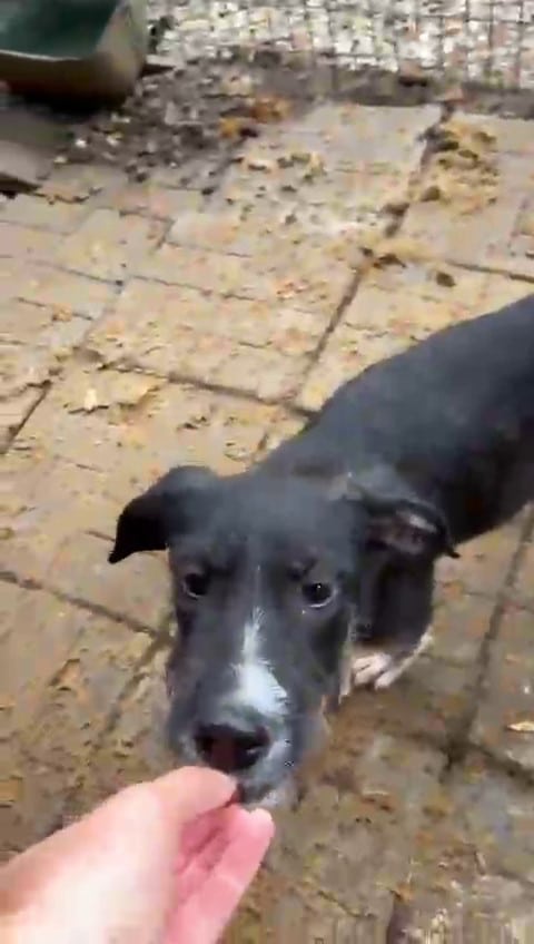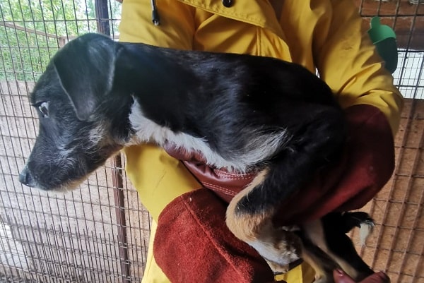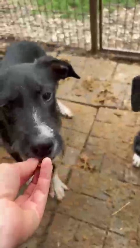 Als wir den Kennel betraten, hielt sich LENO zunächst im Hintergrund auf. Er wurde dann aber immer neugieriger und hat unsere mitgebrachten Leckerlis aus der Hand genommen. Dabei konnten wir ihn vorsichtig an der Schnauze anfassen. Zu mehr fehlte ihm noch der Mut
