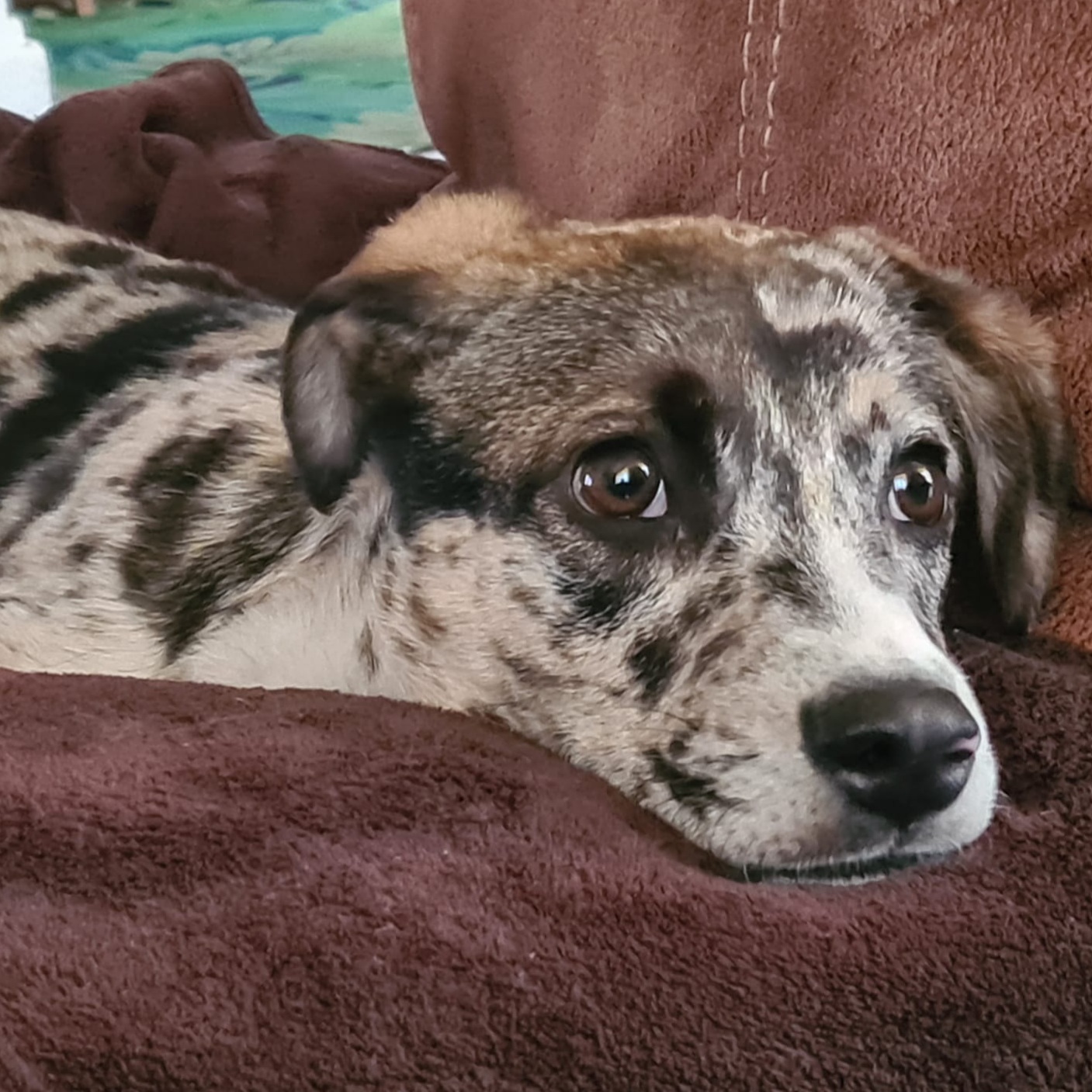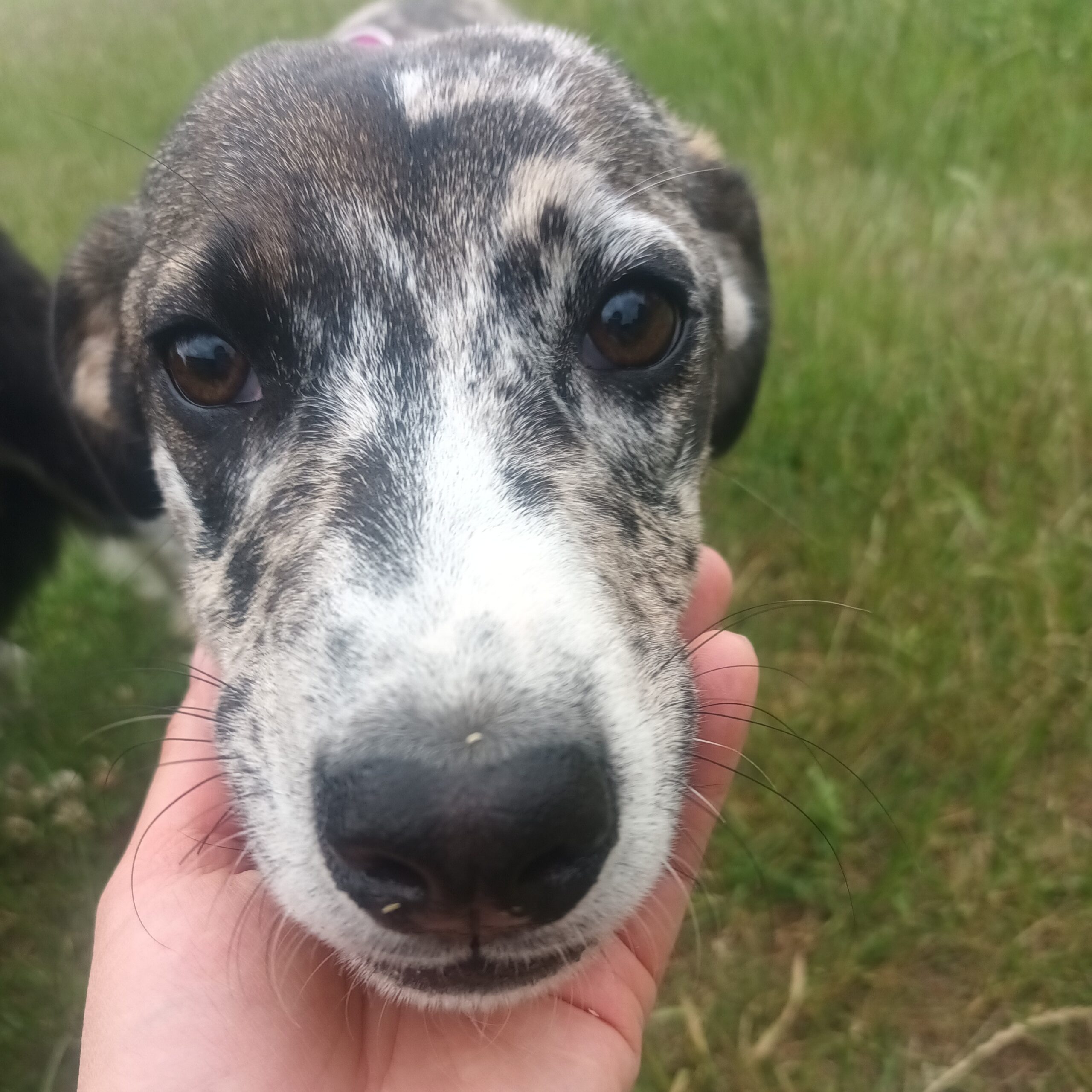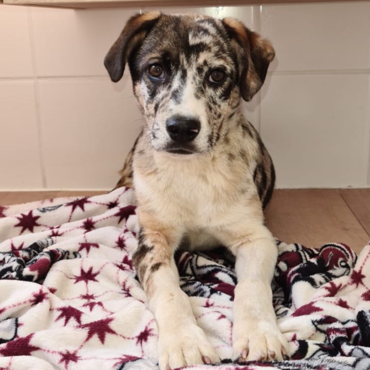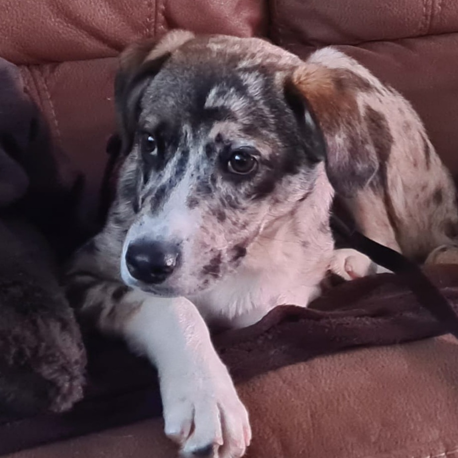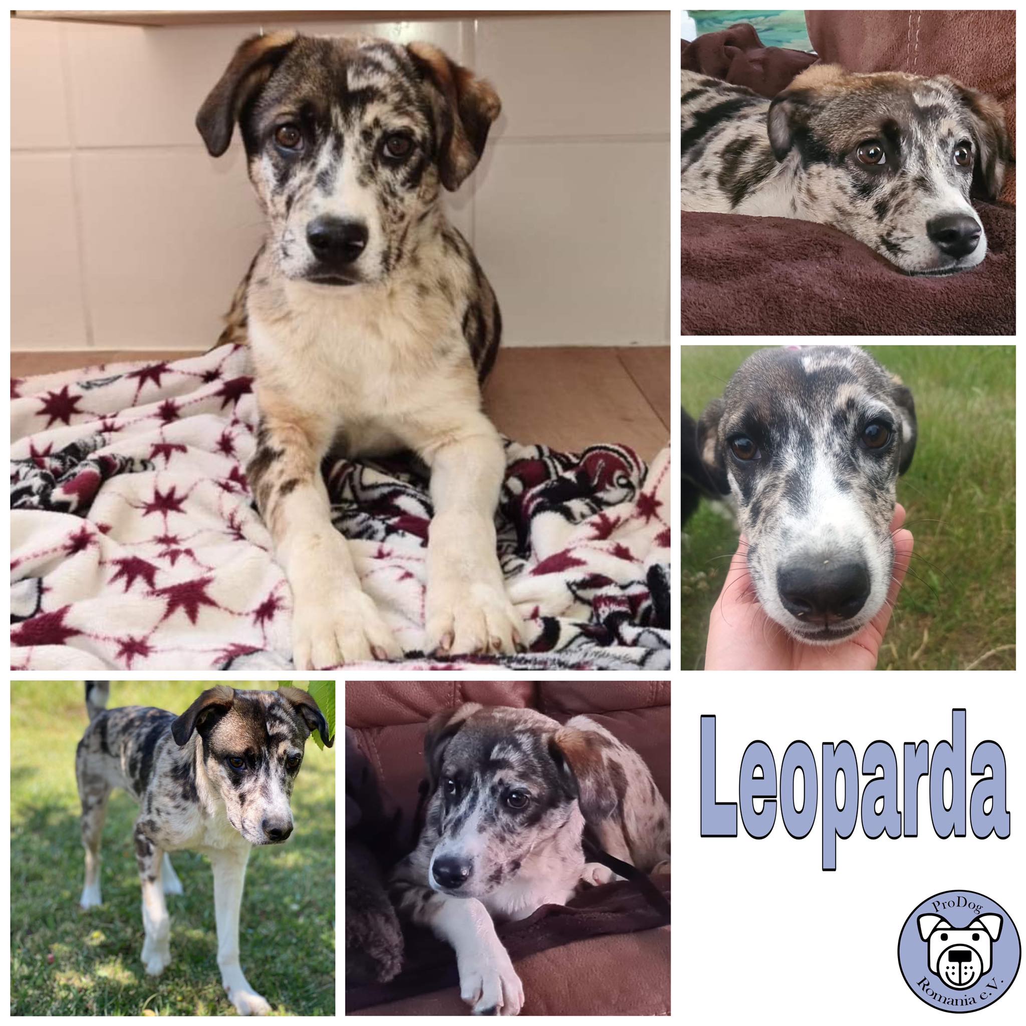 Leoparda kam Mitte Mai 2022 aus dem rumänischen Tierheim völlig unsicher und verängstigt auf die Pflegestelle. Hier wollte sie die ersten Wochen von niemanden angefasst werden und ist bei Kontaktaufnahme ausgewichen oder weggelaufen. Deswegen musste sie die ersten Wochen das Sicherheitsgeschirr und Hausleine anbehalten.