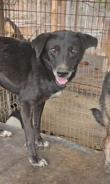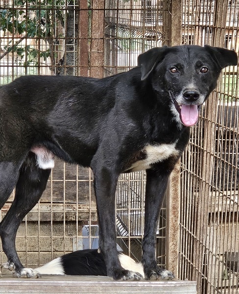 LESTER hat uns überrascht. Er freute sich sehr über unseren Besuch und überspielte seine Unsicherheit mit Spielaufforderungen und hüpfte dabei vor uns rum. Bei Temperaturen von über 35 Grad hätten wir damit sicher nicht gerechnet. Gerne nahm er unsere Leckerchen. Anfassen konnten wir ihn nicht. Nach über 5 Jahren Shelter wird er sicher Eingewöhnungszeit benötigen, bis er uns Menschen vertrauen kann. Seine neugierige Art und ein souveräner Ersthund werden ihm sicher dabei helfen.