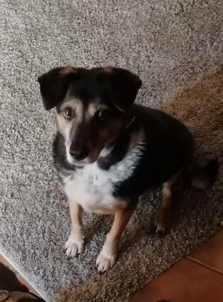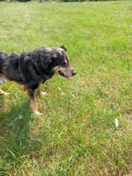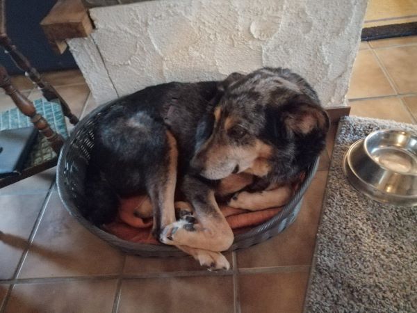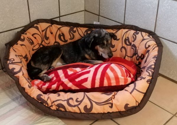 Das linke Hinterbein muss glatt durchgebrochen gewesen sein. Wahrscheinlich in seinem ersten Lebensjahr. Es ist stark verdreht, aber schmerzfrei und stabil zusammen gewachsen. Dadurch ist das Bein jetzt ca. 5cm kürzer als das andere und er humpelt.