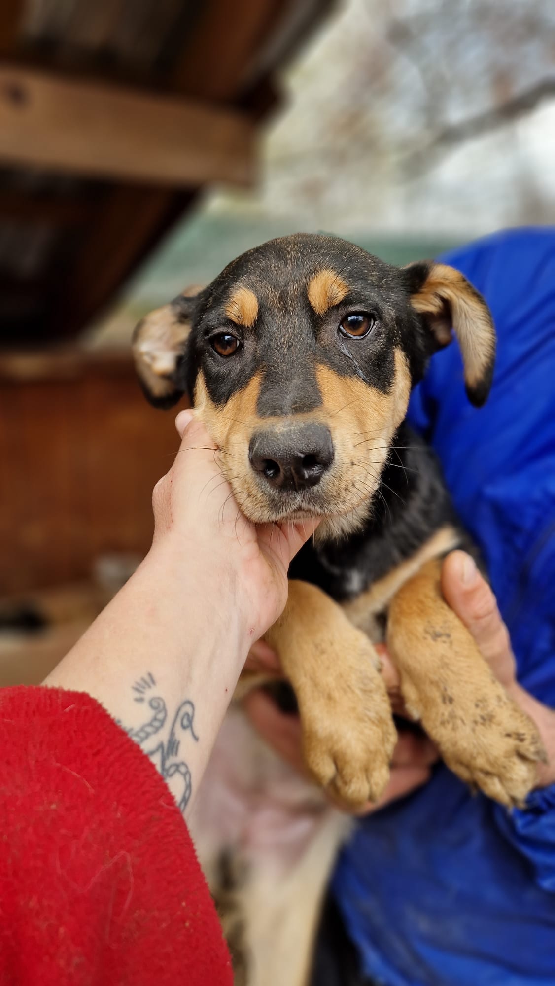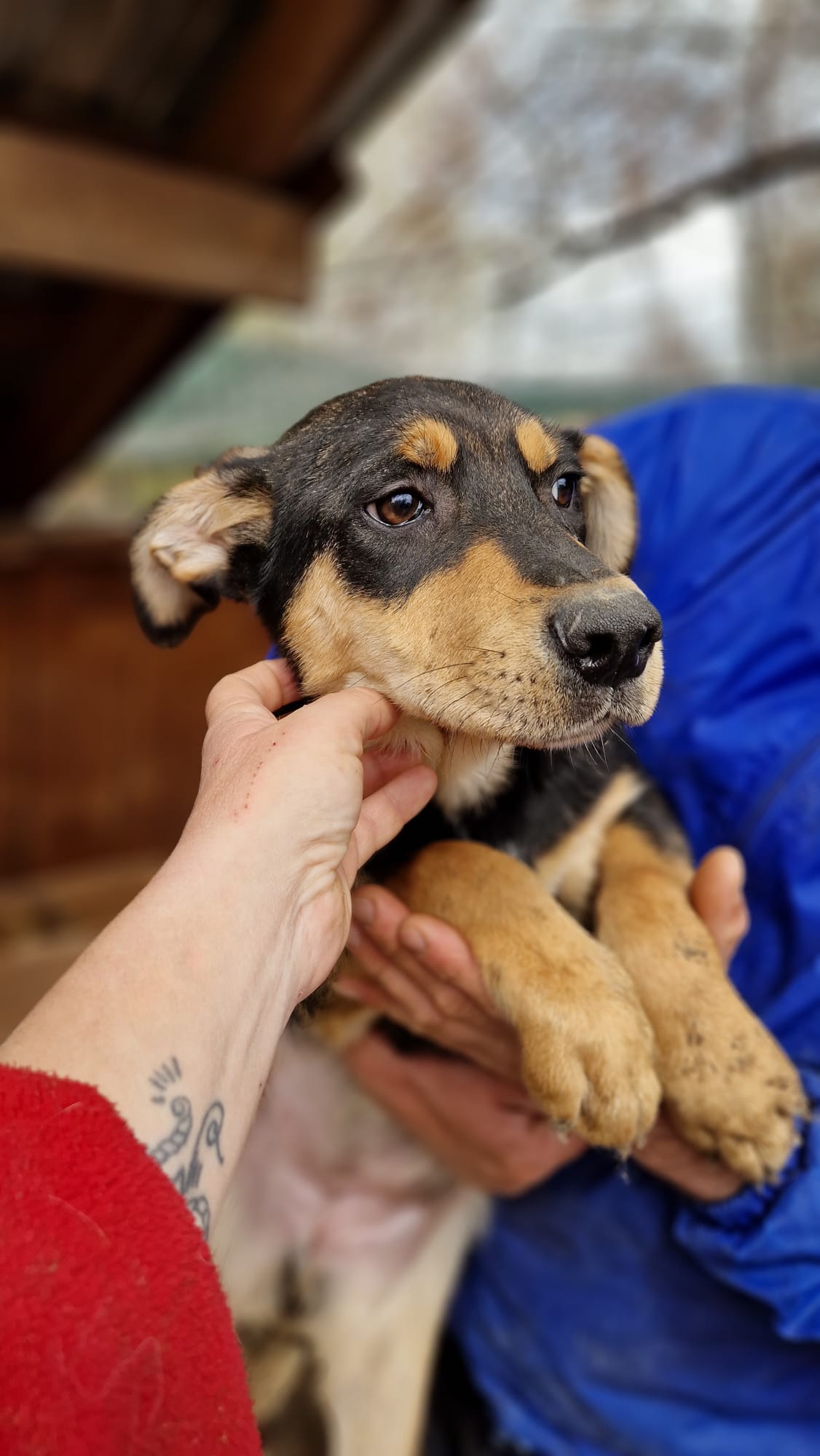Sie ist bereits recht ängstlich und saß zitternd in ihrer Hütte. Sie lässt sich noch auf den Arm nehmen, kennt aber keine Streicheleinheiten und hatte Angst. Sie braucht dringend Anschluss an Menschen, gute Erfahrungen, einen Zweithund, sonst wird ihre Angst sich verfestigen und ihr Schicksal als ängstlicher Hund im Tierheim wäre für immer besiegelt.