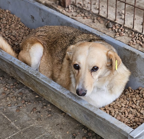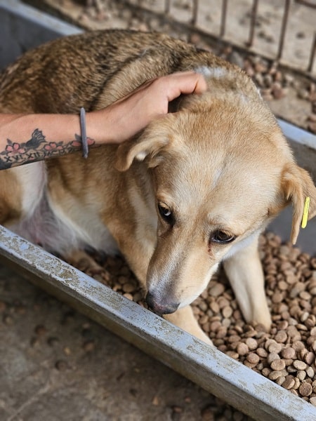 Als wir den Kennel betraten, lag LINETT im Futtertrog und beobachtete uns neugierig, was wir machten. Als wir uns ihr zuwandten, nahm sie unsere Leckerchen und wir konnten sie auch zaghaft streicheln. Man merkt ihr aber an, dass sie Streicheleinheiten noch nicht kennt. Hier fehlt der letzte Schritt um das noch fehlende Vertrauen aufzubauen.