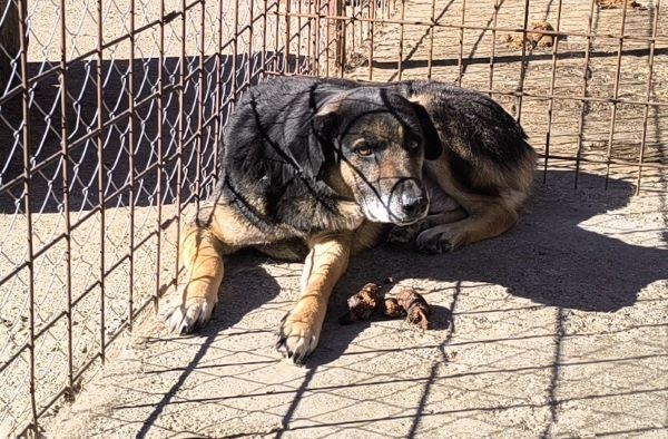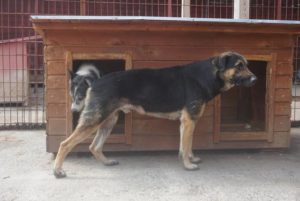 LINOX beobachtete uns, während wir uns mit den anderen Hunden beschäftigten. Als wir uns ihm aktiv näherten, stand er auf und verzog sich in eine Hütte. Hier konnten wir ihn gut streicheln. Da er es nicht gewohnt ist, schien es ihm sehr suspekt zu sein, aber er ließ es geduldig über sich ergehen. Er zeigte dabei weder Abwehr- noch Fluchtverhalten.
