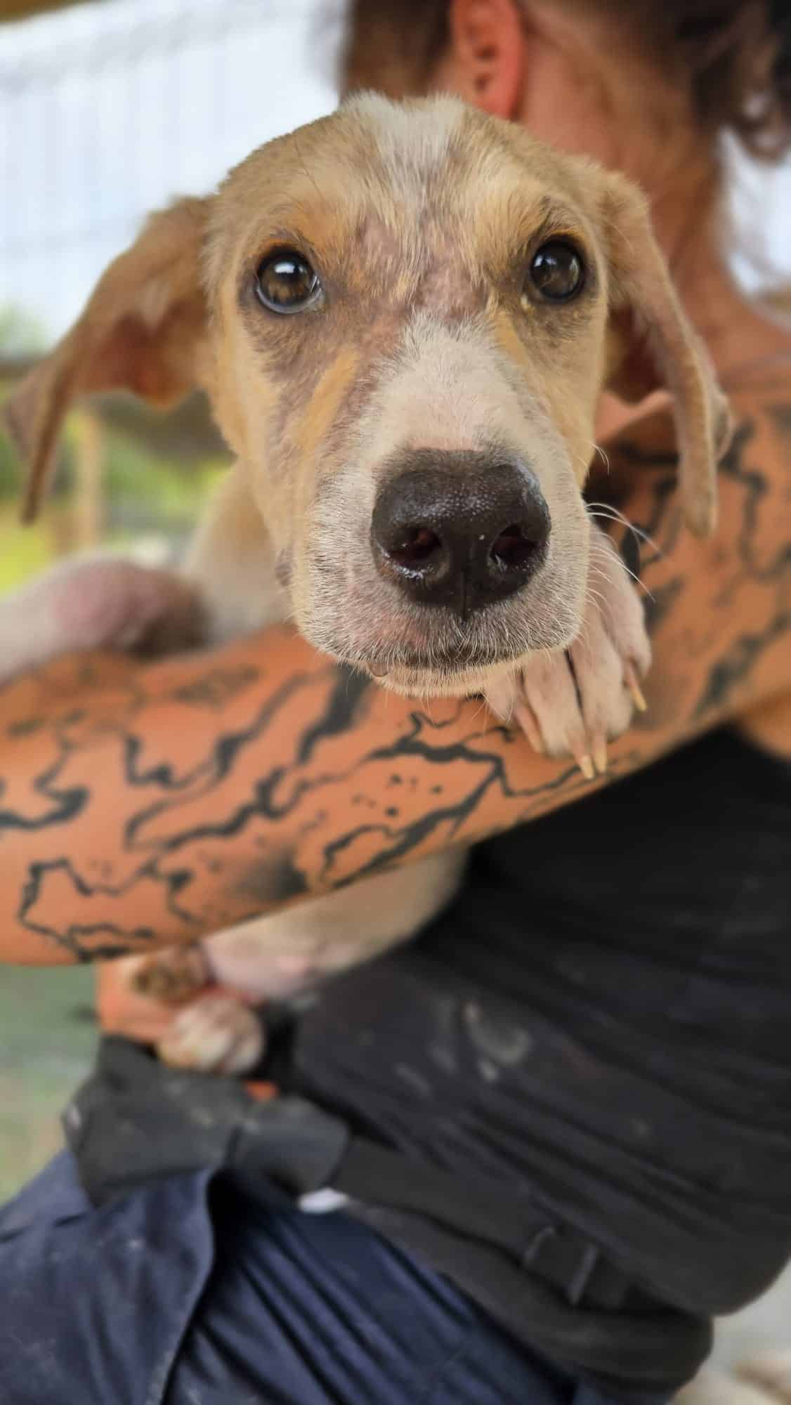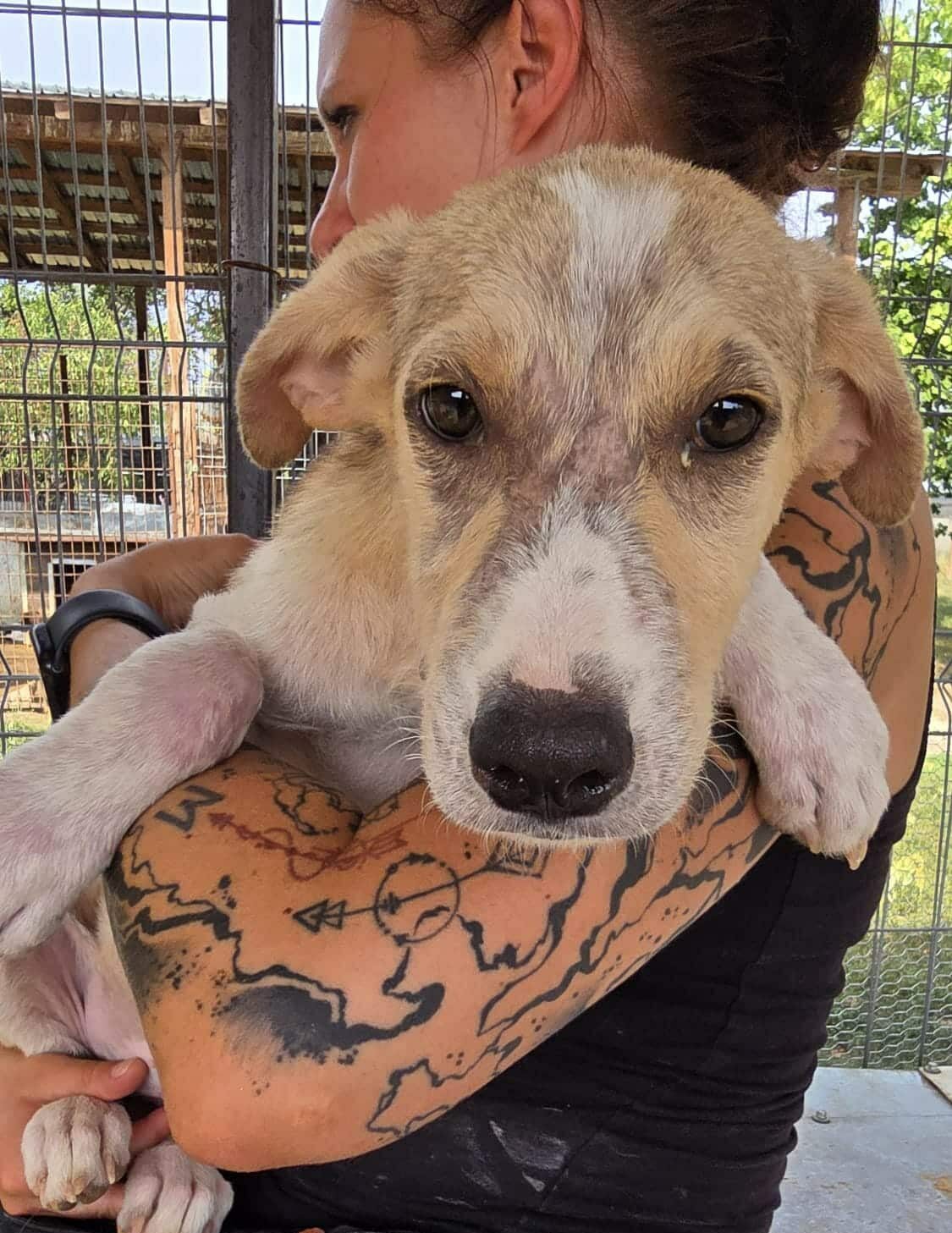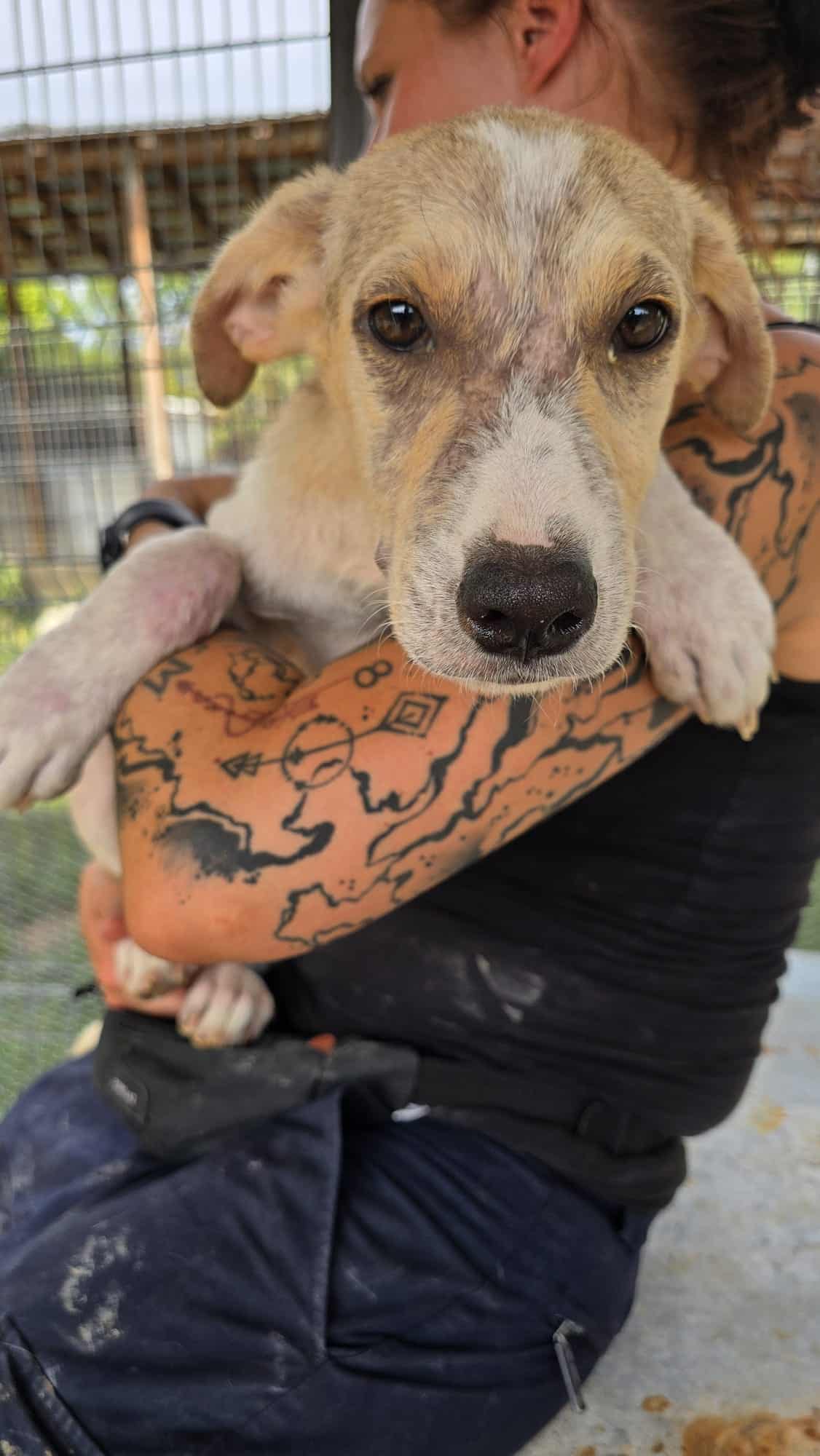 Das hübsche, aber leider bei unserem Besuch von Hautproblemen geplagte Welpenmädchen LIPA lag anfangs nur in einer Hütte, als wir im Kennel waren. Sie wirkte sehr fertig, aber grundsätzlich interressiert an Menschen, und nahm gerne unsere Leckerlis. Sie kam allerding nicht von alleine auf uns zu, sonderen suchte in ihrer Hütte Schutz vor der Hitze, die hier im August herrscht. LIPA ließ sich problemlos auf den Arm nehmen und streicheln, auch wenn sie das sicher so nicht kennt. Sie scheint eine sehr nette Maus zu sein, leicht zurückhaltend, die aktuell aufgrund der Hautprobleme und den fehlenden Pfunden noch mehr unter den Umständen im Shelter leidet. Sie sollte zeitnah in eine saubere Umgebung, damit ihr Körper sich erholen kann.