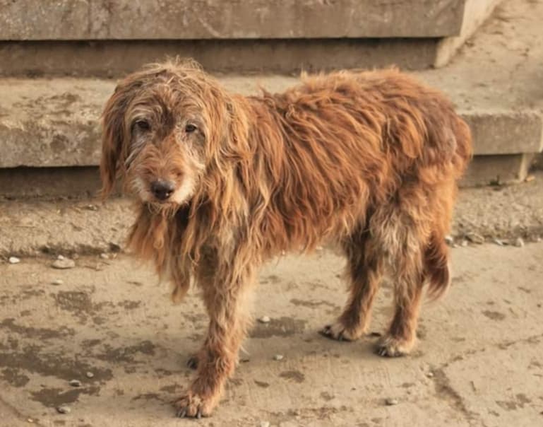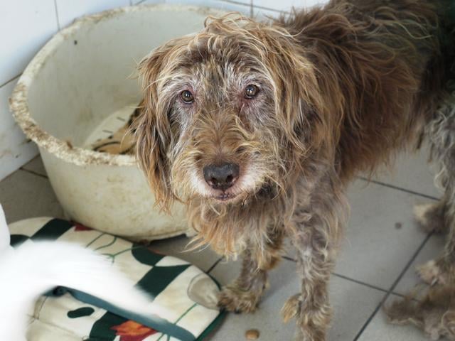 Sein Fell ist sehr verfilzt. Er ließ sich geduldig die Platten aus dem Fell schneiden.