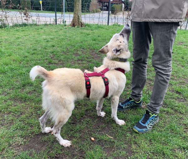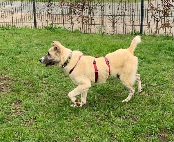 Die Leinenführigkeit muss noch geübt werden, aber da der hübsche Schatz immer gefallen möchte, sollte dies kein Problem sein.
