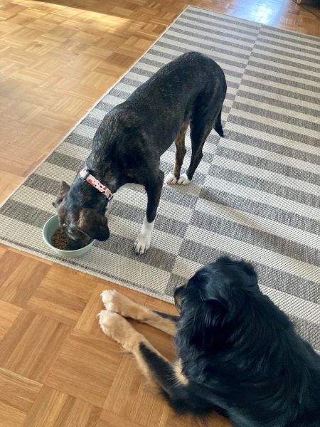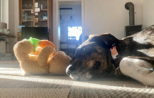 Im Moment sieht es danach aus, als ob er mega schnell flitzen kann und ihm das auch riesig Spaß macht (an der Schlepp im Garten). Auf Spaziergängen geht er teils noch zu sehr in die Leine, wird aber nach den ersten aufregenden Minuten besser, dann wird geschnüffelt und geguckt. Geräusche, Autos, Busse, Radfahrer, Motorräder, die Müllabfuhr: Alles gesehen, alles beobachtet, ist okay, abgehakt. Fremde am Gartenzaun oder die Türklingel: kein Gebell. Mit halbwegs fixen Zeiten im Garten inzwischen fast stubenrein, nachts wird durchgeschlafen (schnarchend). War mittlerweile auch schon einmal drei Stunden alleine, kein Problem. Spielt gerne, kommt aber auch super wieder zur Ruhe und pennt dann weg. Erziehung ist hier allerdings noch angesagt, ab und zu kommt auch ein kleiner Sturkopf durch. Mit einer freundlichen Ansage erledigt sich dies aber (meistens).