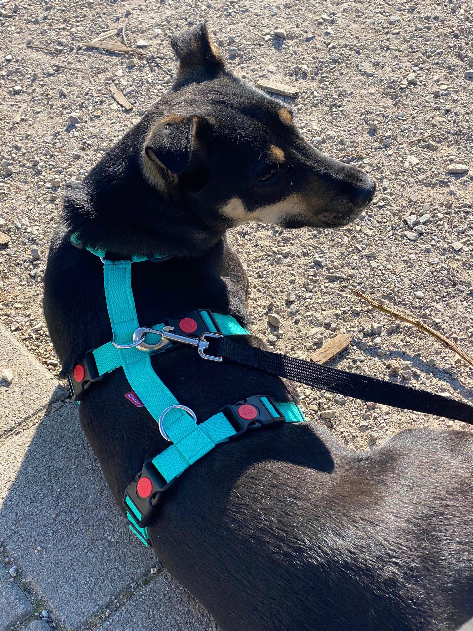 Beim Gassi dreht sie etwas auf und zeigt ihre Lebensfreude – sie nutzt den Radius der Schleppleine voll aus und freut sich, dass sie Schnüffeln und Rennen kann. Wenn wir anderen Hunden begegnen, werden zuerst die Frauchen/Herrchen angeschwänzelt, bevor die Hunde beschnüffelt werden. Sie mag fast alle Hunde und fordert sie zum Spielen auf. Nur laute und forsche Hunde sind ihr nicht so geheuer, da macht sie einen Bogen drum.