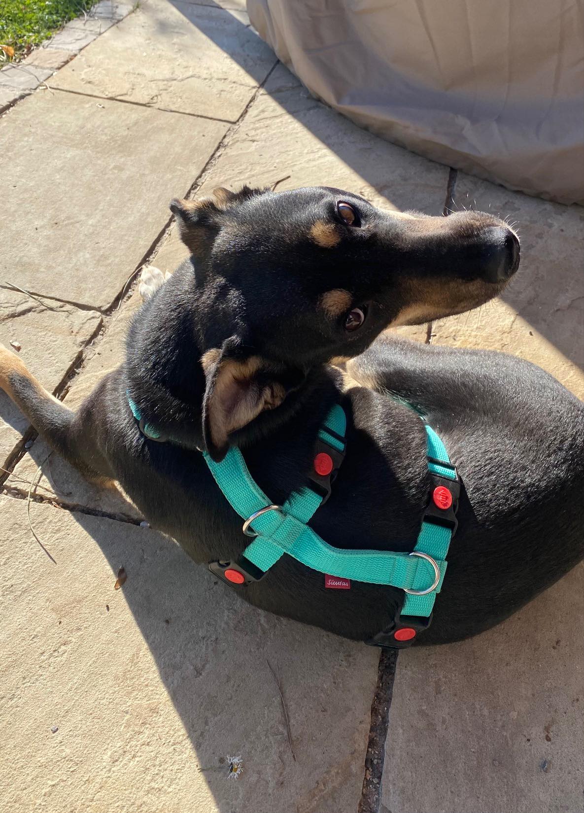 Wenn ich beim Gassi anhalte, um mich zu unterhalten, legt sie sich entspannt ab oder räkelt sich im Gras (sofern vorhanden). Auch im Garten liegt sie gerne in der Sonne.