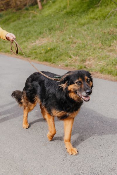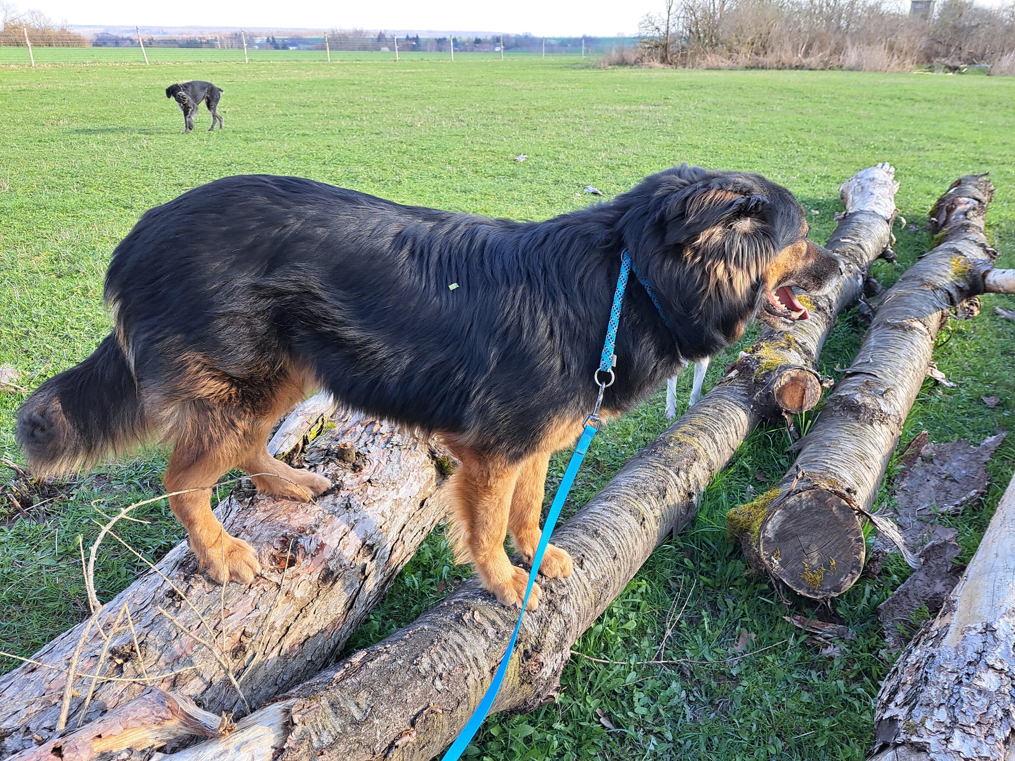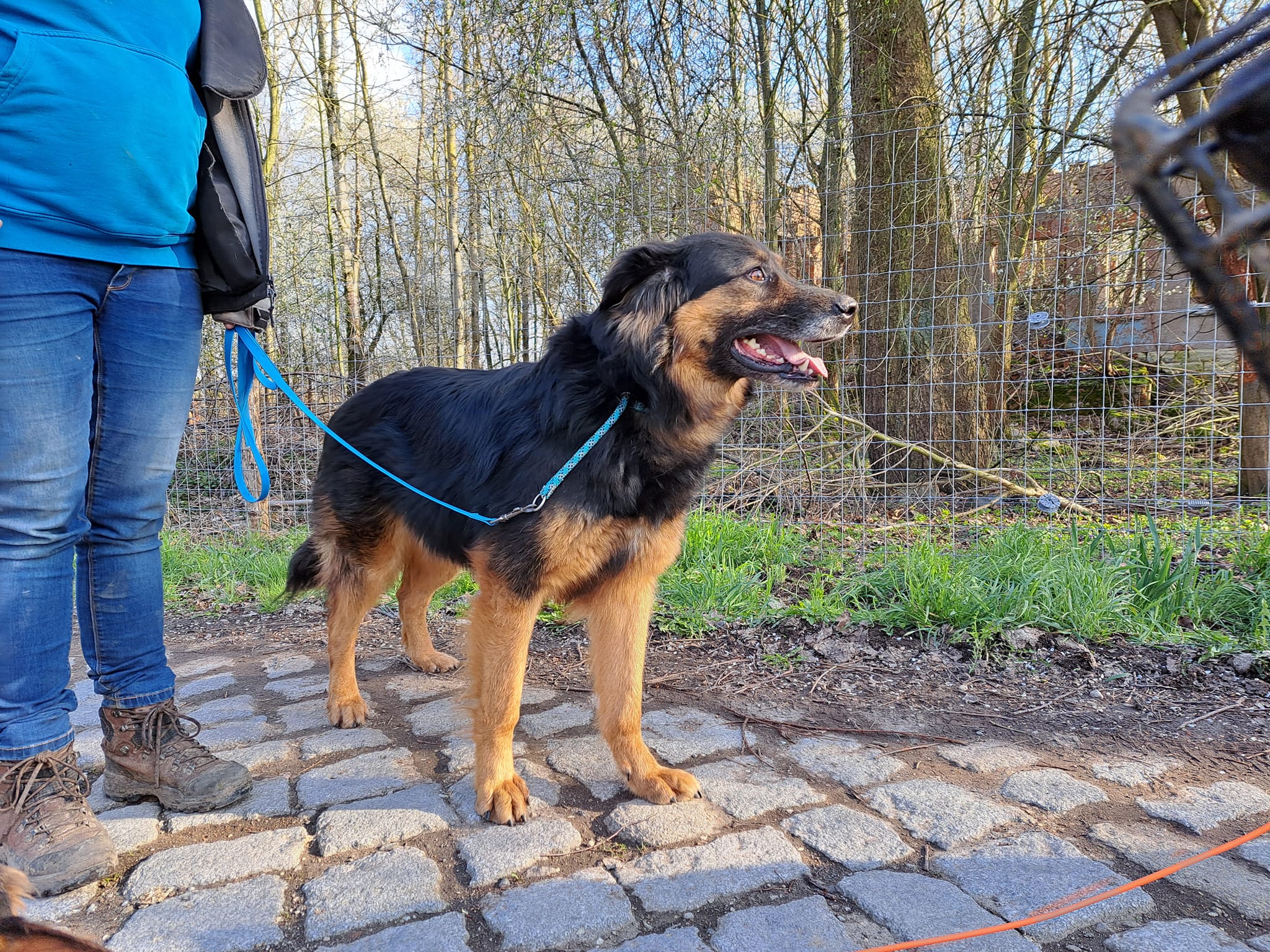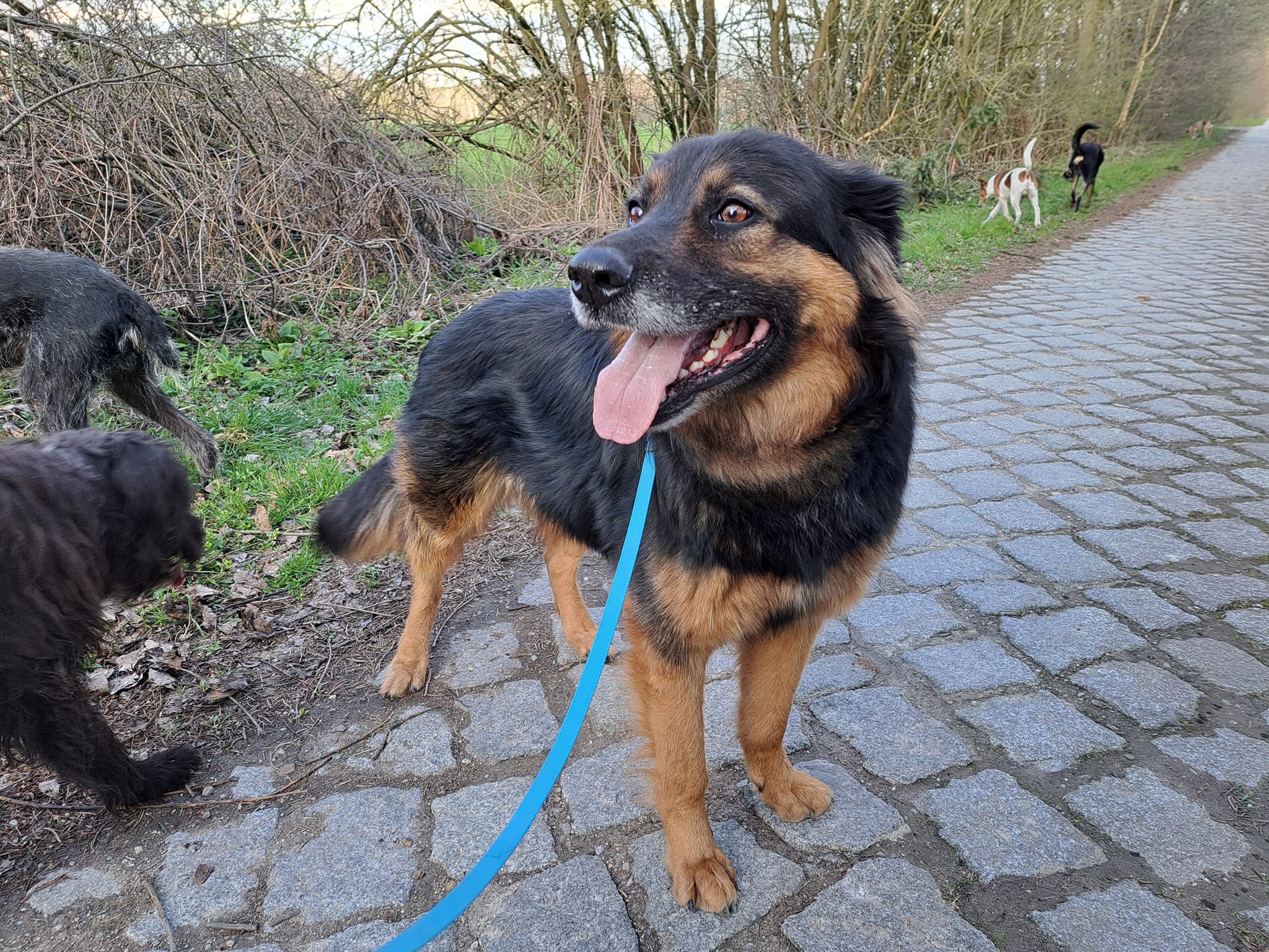 Gesundheitlich zeigt er sich sehr fit: er tobt mit den anderen herum, klettert gern auch mal und auf Spaziergängen kann er mit Elan ziehen. Sein Herzwurmbefall ist behandelt und der aktuelle Bluttest lässt uns positiv in die Zukunft blicken – hier gibt es nur noch einen unsicheren Wert, den wir im Auge behalten.