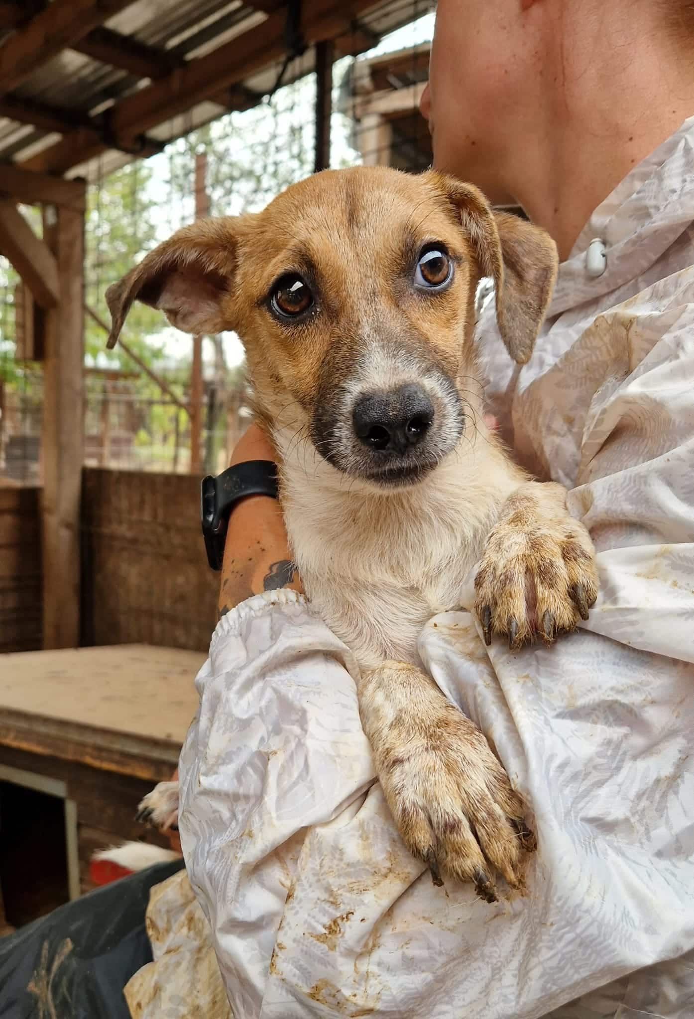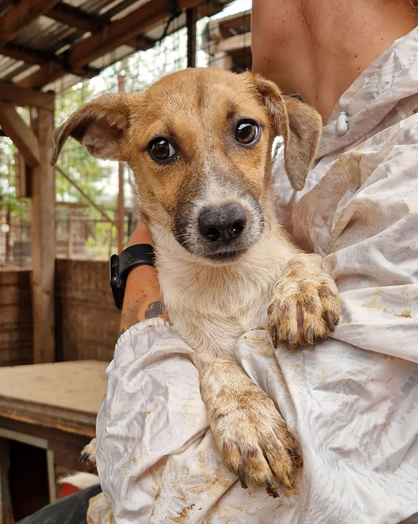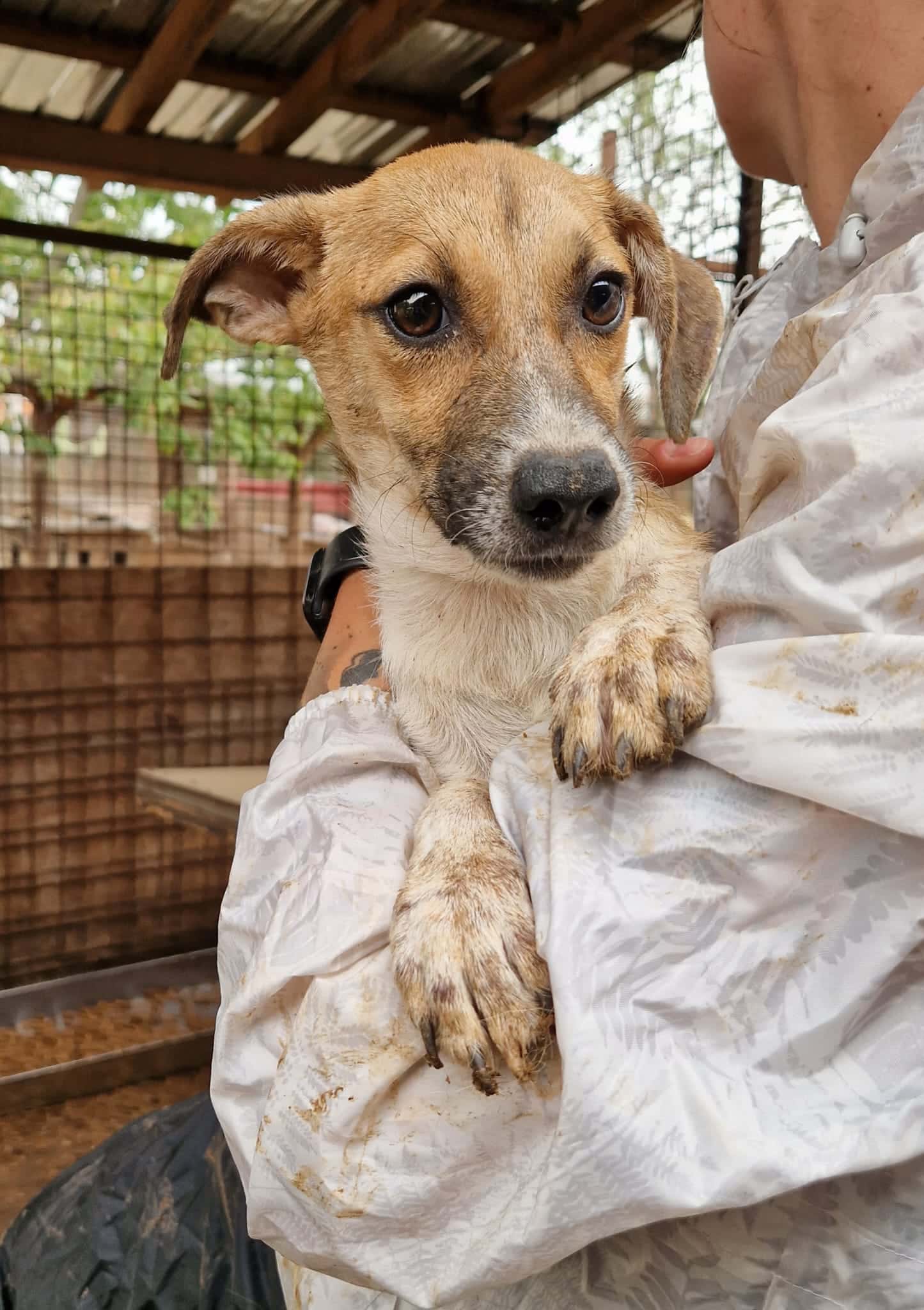 Die kleine LULU mussten wir hinter einer Hütte vorholen, wo sie sich anfangs vor uns versteckte. Sie ist schon etwas unsicher, wahrscheinlich fehlt ihr die Erfahrung mit guten Menschen. Sie ließ sich trotz der beängstigenden Situation problemlos hervorholen, ohne auch nur den Ansatz einer Abwehrreaktion zu zeigen, aber man merkte natürlich dass sie dadurch verunsichert war. LULU konnte sich aber gut auf unserem Arm beruhigen, sodass wir sicher sind, dass sie noch gut auftrauen würde, wenn sie endlich Sicherheit und Geborgenheit erfährt.