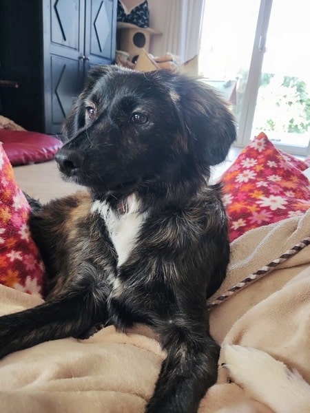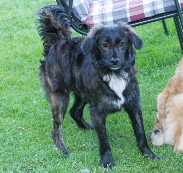 - längeres weiches Fell in schwarz gestromt mit wunderschönen rötlichen Akzenten, weißer Latz, Hängeöhrchen und eine gerade getragene fedrige Rute