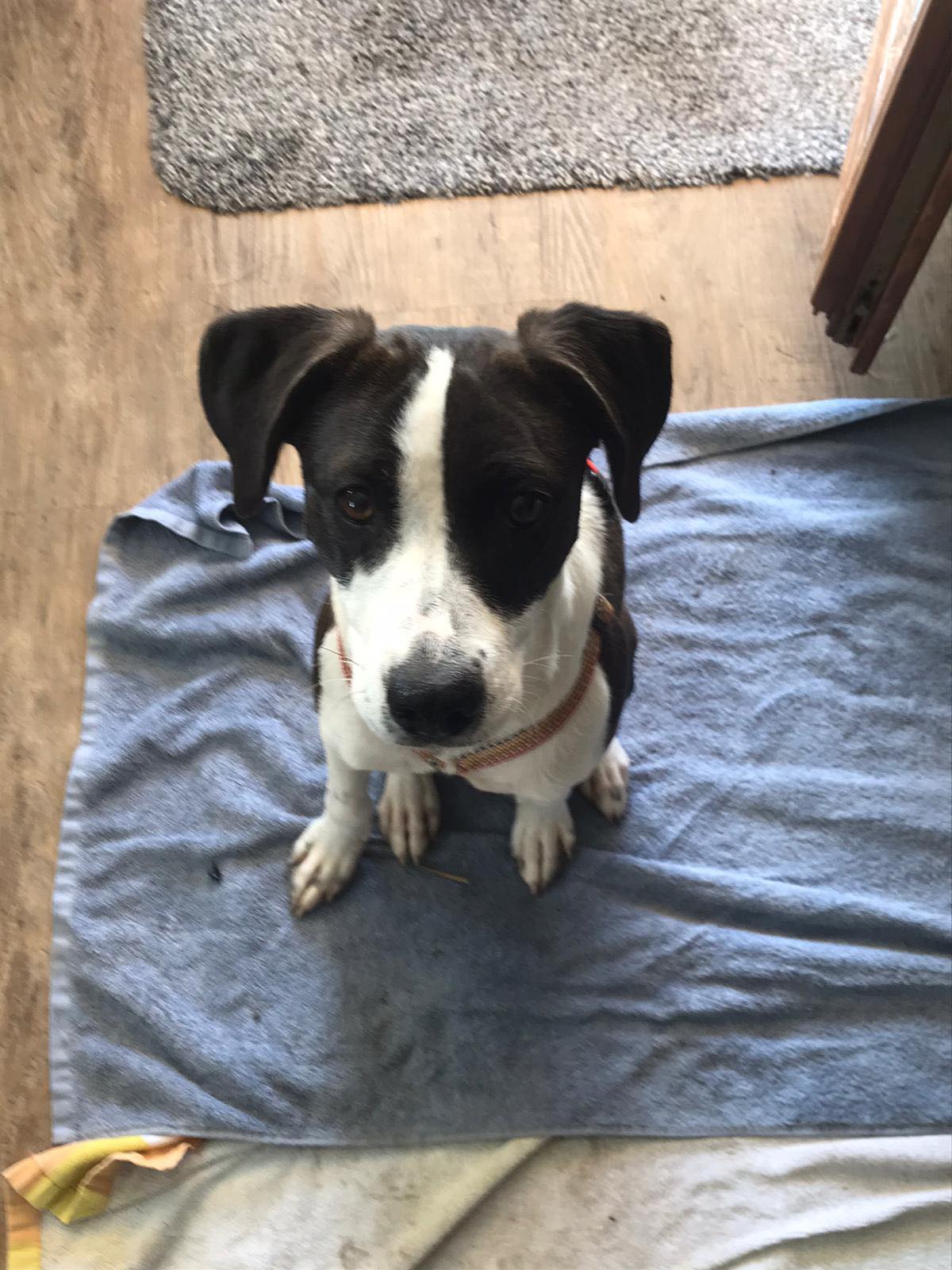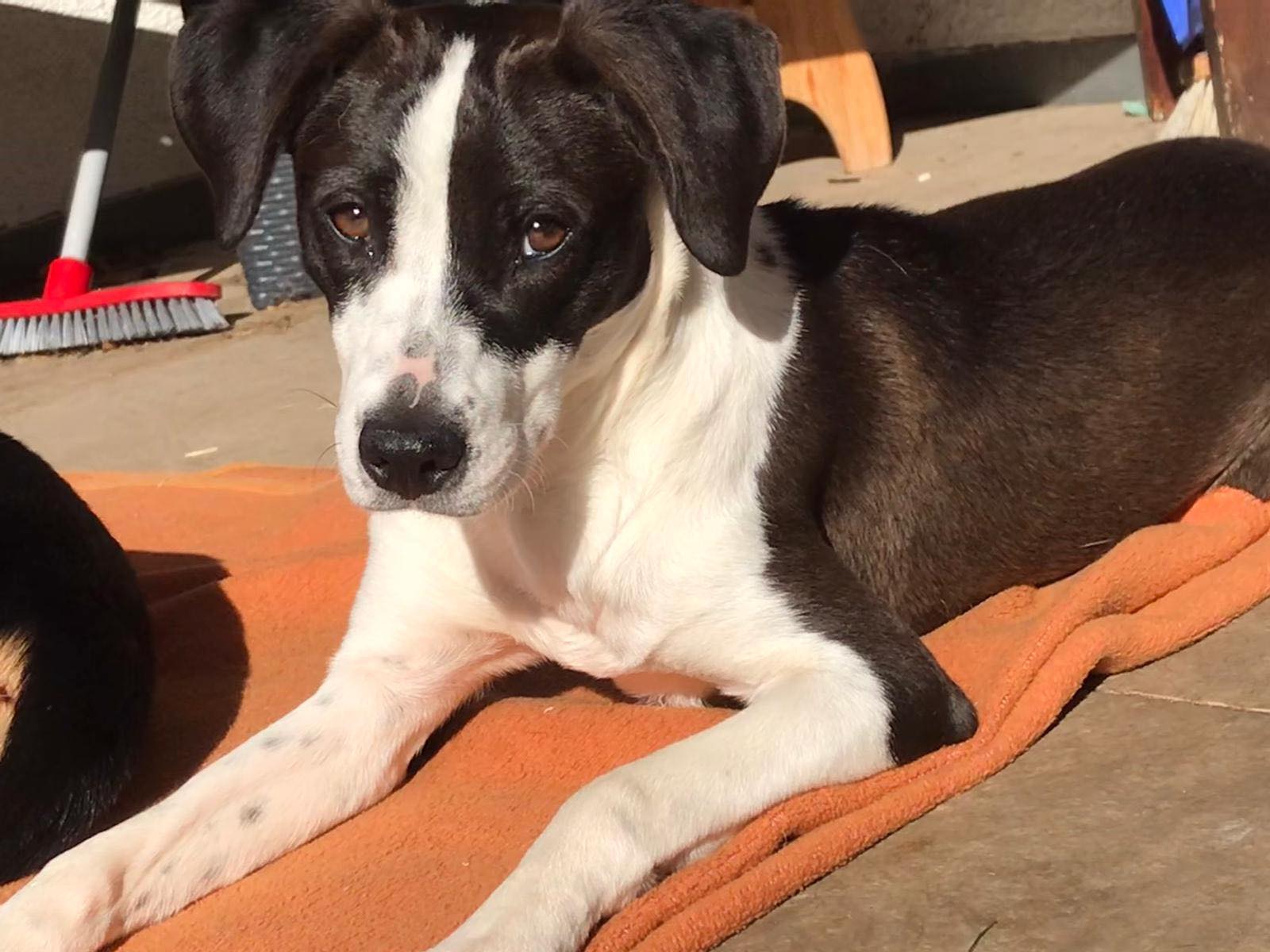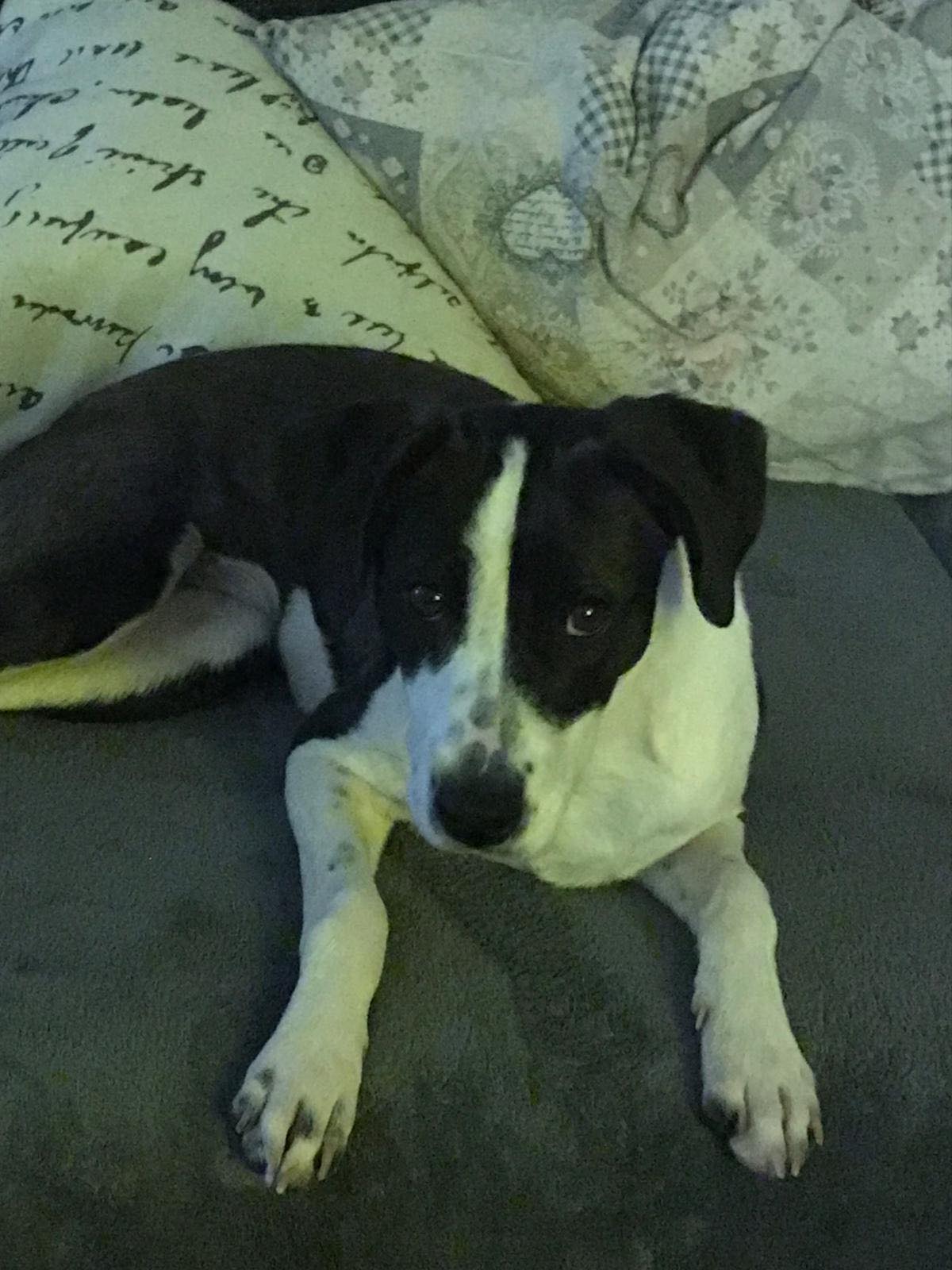 Lydie ist eine aufgeschlossene, neugierige ganz liebe Kuschelmaus ohne Rute. Die fehlende Rute beeinträchtig die junge Hündin nicht.