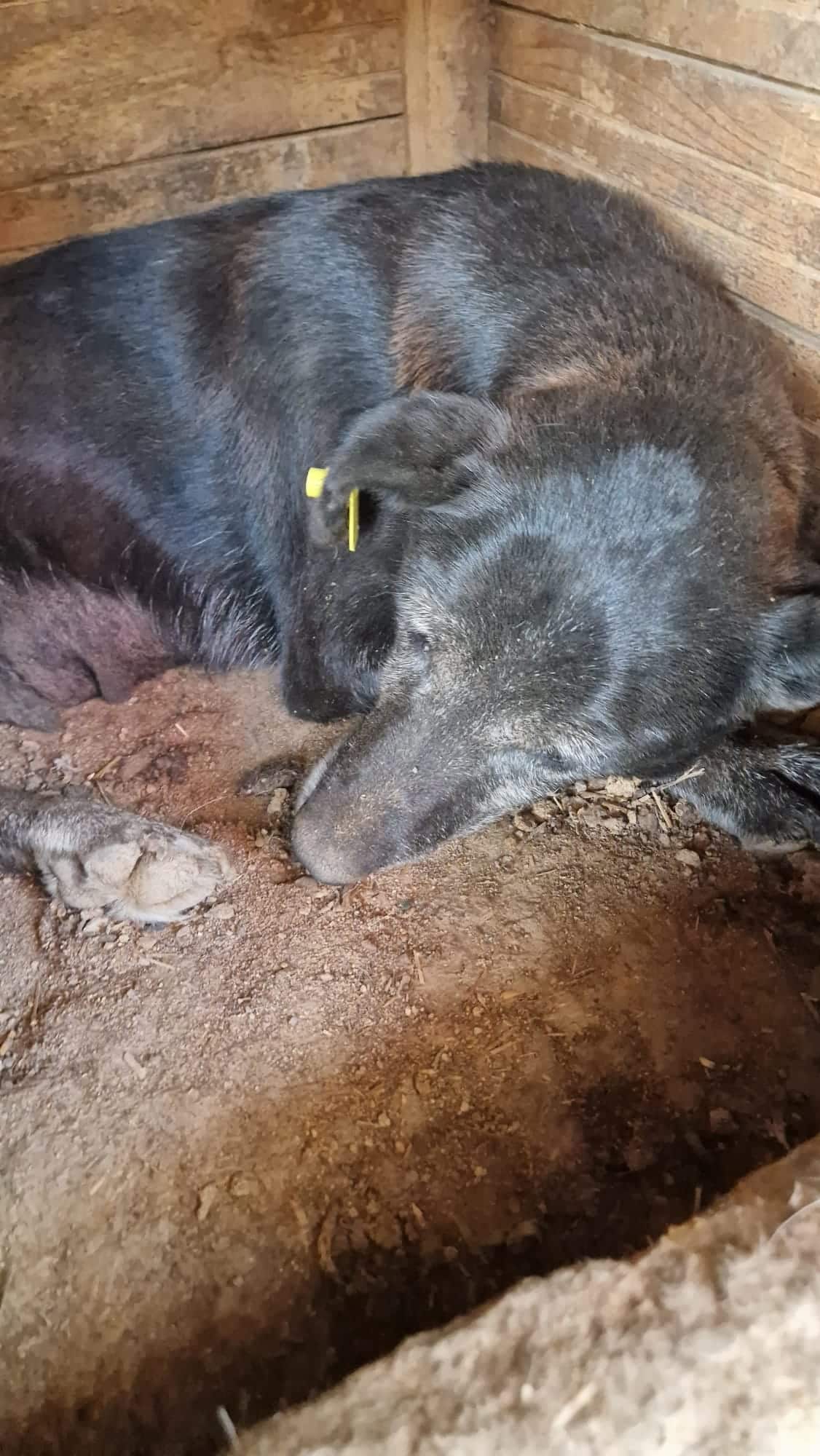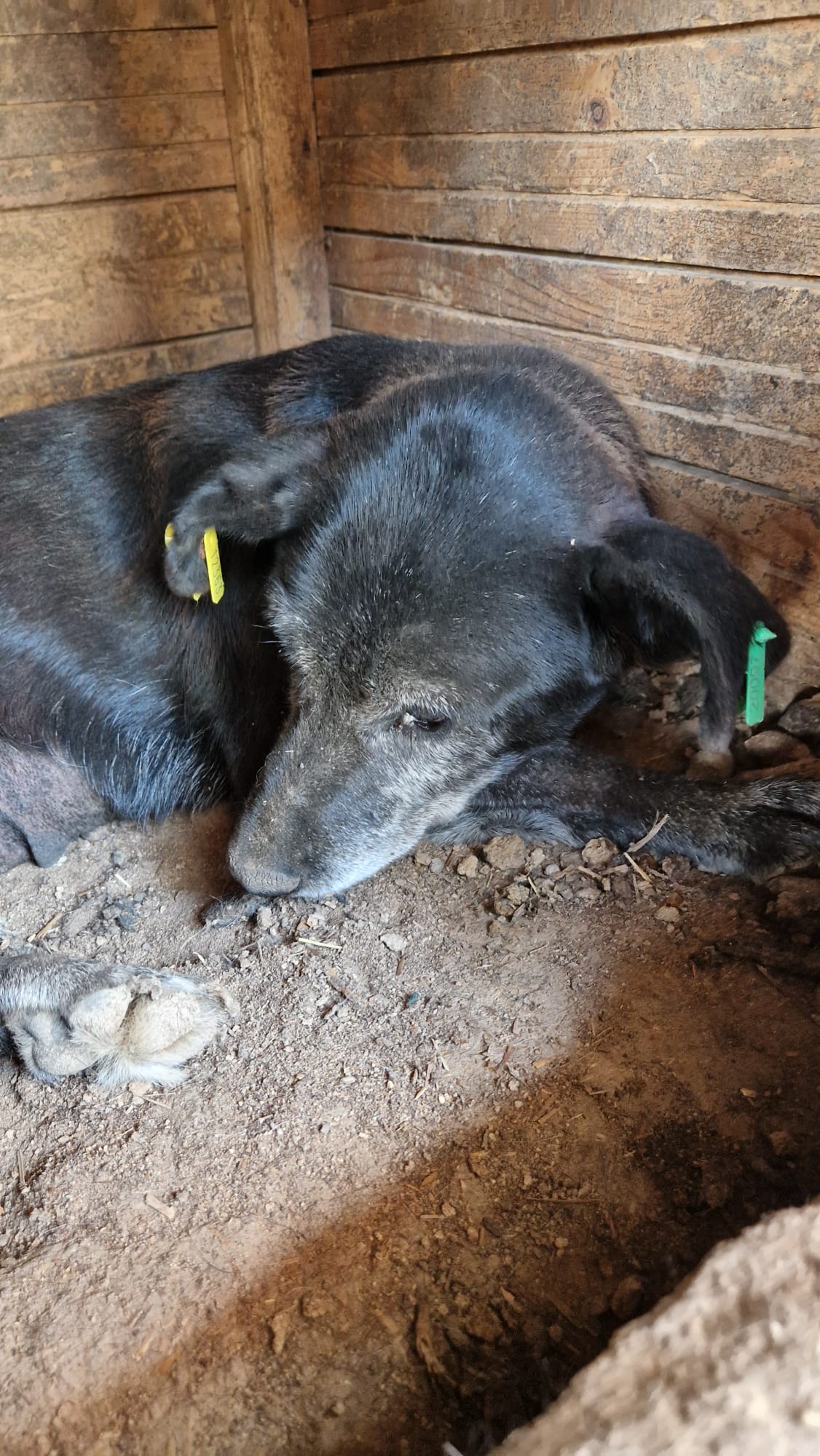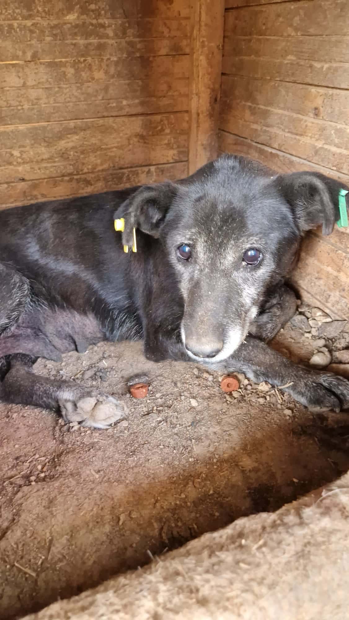 Die alte MABIA sitzt mit ihren 3 Junghunden in einem winzigen Kennel. Sie lag ausschließlich in der Hütte und wollte auch unsere Leckerlis nicht aus der Hand nehmen oder überhaupt fressen. Sie wirkte fast teilnahmslos, ist aber auch zurückhaltend. Unseren Blicken wich sie aus, und hätte sie die Kraft gehabt, wäre sie vermutlich geflüchtet. MABIA ließ sich anfassen und streicheln, zeigte dabei aber keine große Regung. Abwehrtendenzen zeigte sie ebenfalls keine und ließ es einfach geschehen. Ihre Kinder, alle 3 mittlerweile nun Junghunde, nehmen leider keine Rücksicht auf sie und kletterten teilweise auf sie rauf. Auch da regierte sie kaum, hechelte nur stärker vor Stress und der Hitze.