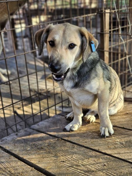 Die süße Mable ist eine kleine Hündin geblieben. Sie zeigte sich offen und nett. Auf den Arm nehmen ist gar kein Problem. Mit ihren Hundekumpels im Kennel versteht sie sich sehr gut.