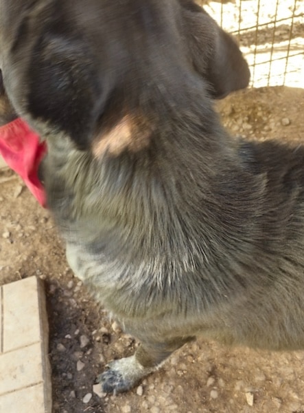 MACIS hat zwischenzeitlich leider stärkere Hautprobleme entwickelt, sodass er kahle Stellen am Hals, Brust und Rücken aufweist. Diese scheinen ihn aktuell auch stark zu schmerzen. Er ist vor allem an der Brust berührungsempfindlicher, schnappte auch kurz ab, als wir dort berührten.