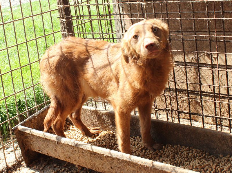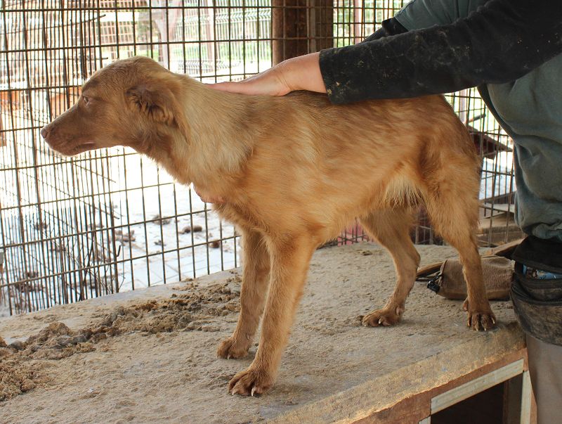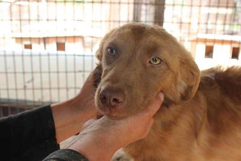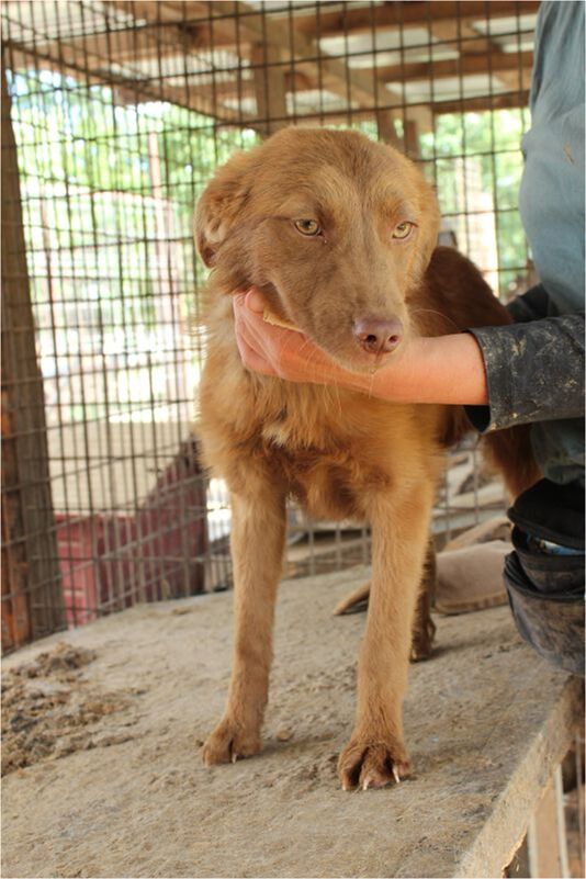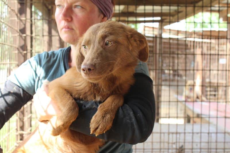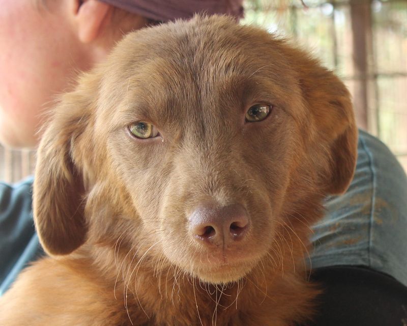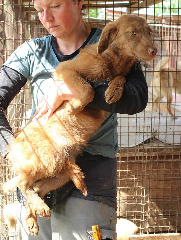 Die wunderschöne schokobraune und zarte Hündin hat ein ruhiges und zartes Wesen. Daher zieht sie sich in ihrem Zwinger sehr oft in eine der Hütten zurück. Sie teilt sich den wenigen Raum mit vielen größeren Junghunden, die stärker und aktiver sind und sie mittlerweile sehr stressen. Dennoch ließ Sana sich sehr schnell von uns aus der Hütte heben und war sichtlich erleichtert, dass sie für einen kurzen Moment aus dem Gewusel herauskam und die seltene Nähe zum Menschen erlebte. Sie entspannte sich zunehmend und genoss die Streicheleinheiten. Es ist eine liebenswerte Hündin, die möglichst schnell aus ihrem derzeitigen Zwinger raus soll, um nicht noch mehr gestresst zu werden. Sie hat die Gabe mit ihren besonderen Augen einem ganz tief in die Seele zu schauen. Deshalb sucht sie Menschen, die ihr die nötige Gelassenheit, Verständnis und Zeit zum Ankommen geben und ihr dann zeigen, wieviel Spannendes da draußen zu entdecken ist.