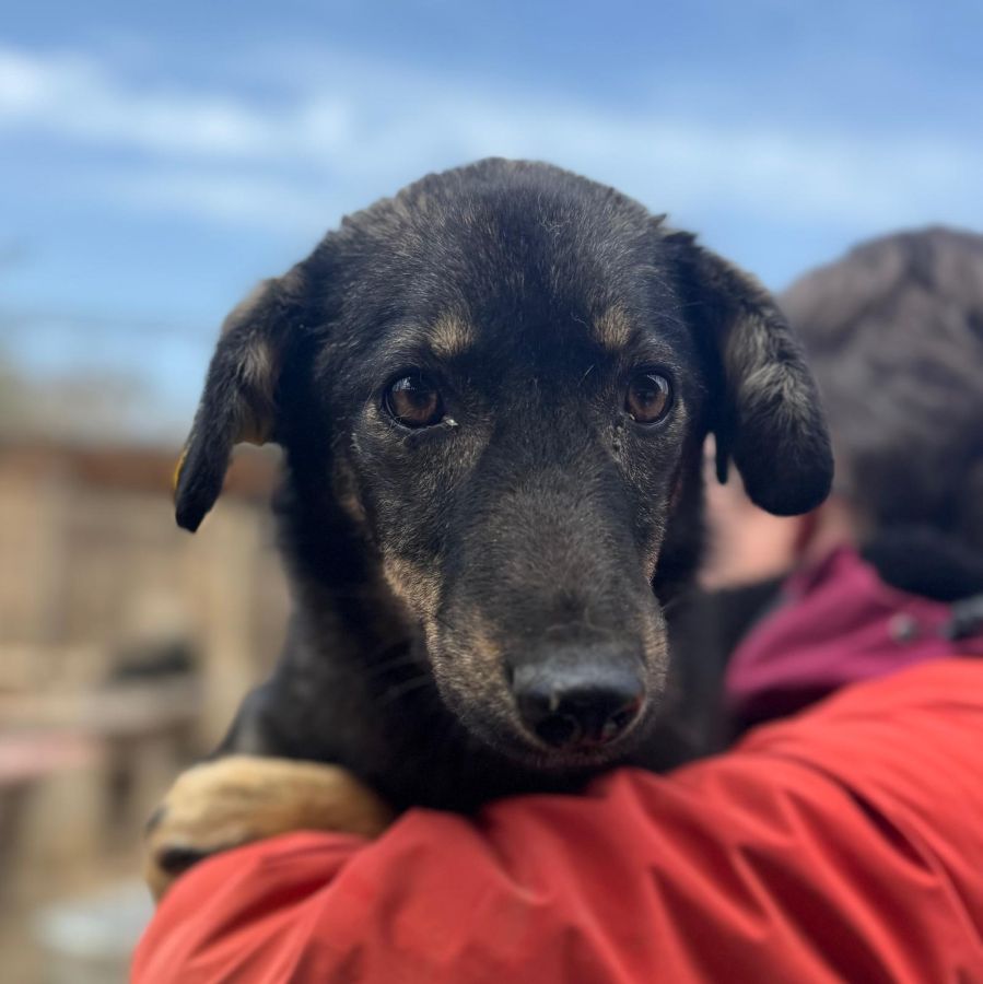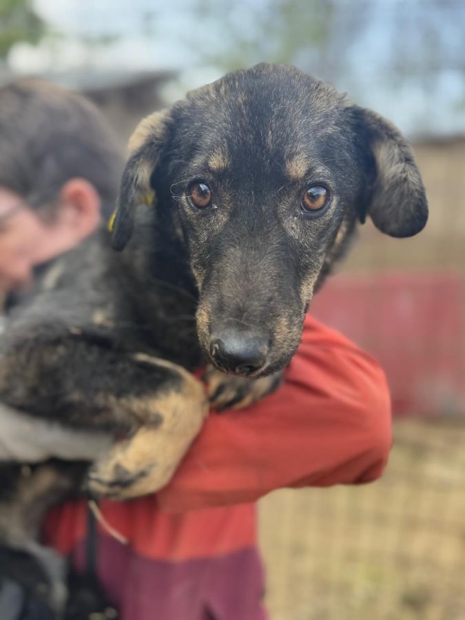 Die hübsche MAGALIE ist erst vor Kurzem im Shelter angekommen. Sie ist noch unsicher, reagiert vorsichtig auf uns und bleibt lieber im Schutz der Hütte. Wir konnten sie jedoch aus der Hütte herausholen und auf den Arm nehmen. Das gefiel ihr allerdings so gar nicht, und sie zeigte halbherziges Abschnappverhalten. Bei hundeerfahrenen Menschen und mit Ruhe und Geduld wird sie sich sicher schnell an menschliche Nähe gewöhnen.