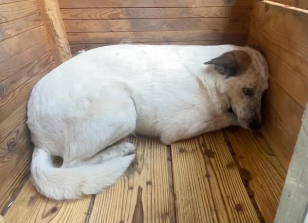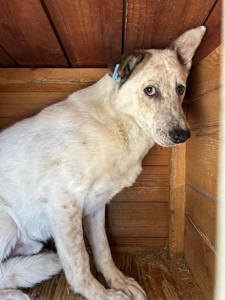 Magnus hielt sich die ganze Zeit in der Hütte auf. Unter leichter Bedrängung konnten wir ihn dort gut streicheln. Genießen konnte er es nicht, aber er kennt es auch nicht. Ein ganz lieber Rüde! Wir denken, dass er in anderer Umgebung mit Eingewöhnungszeit auftauen würde.