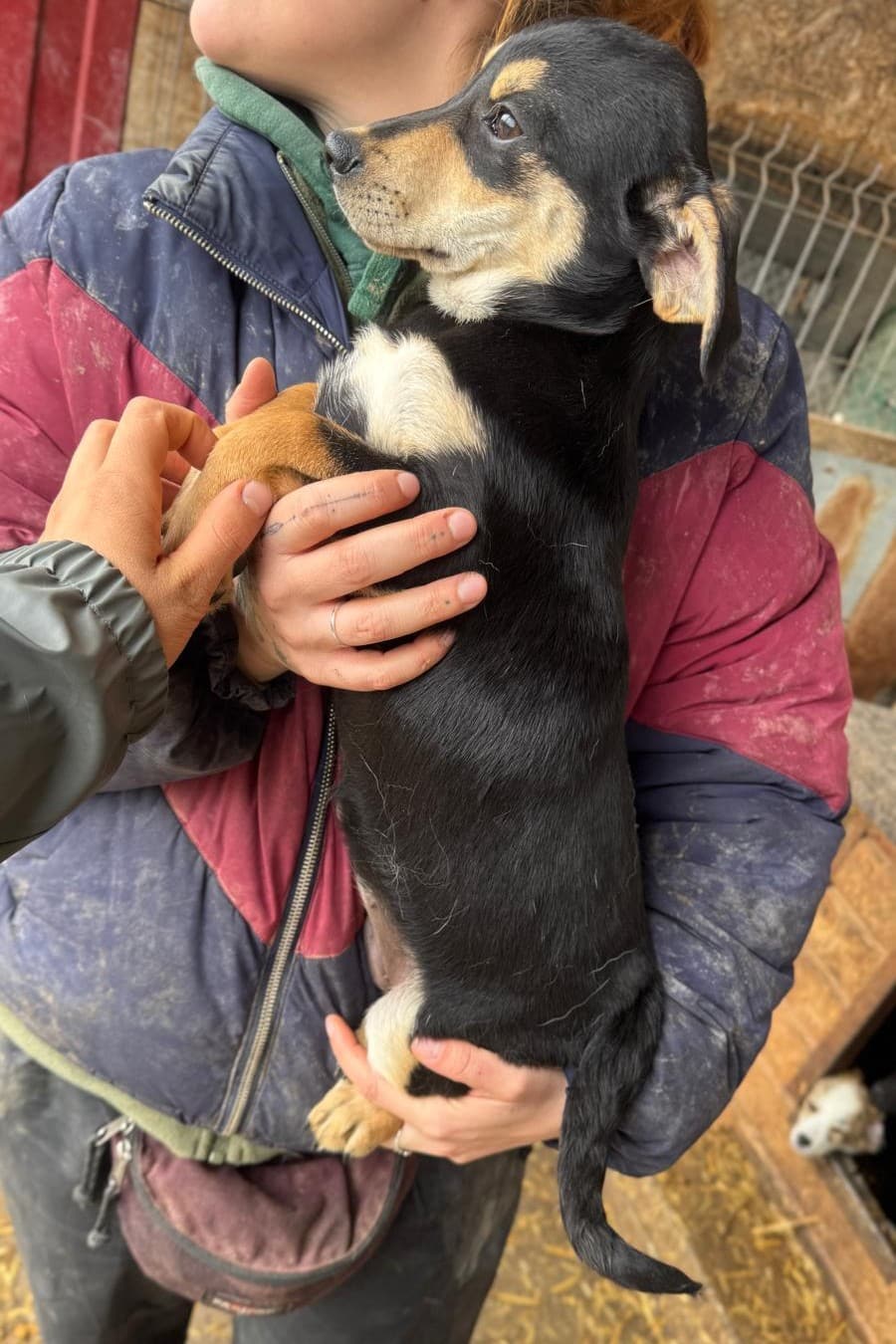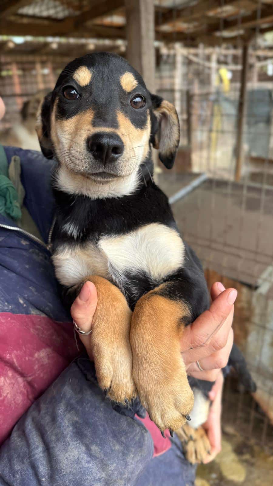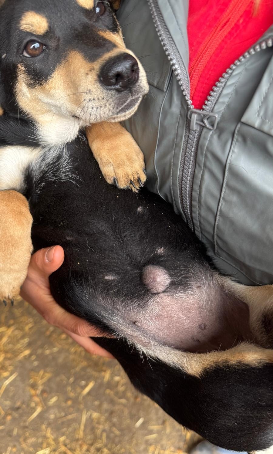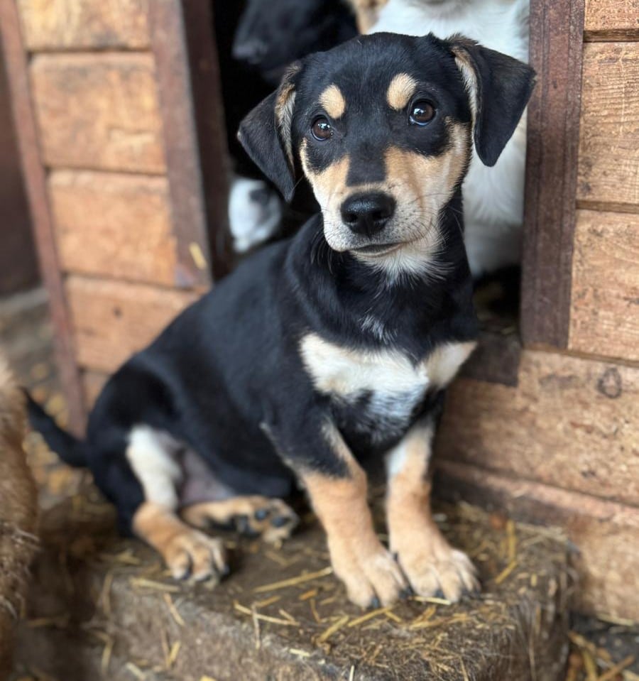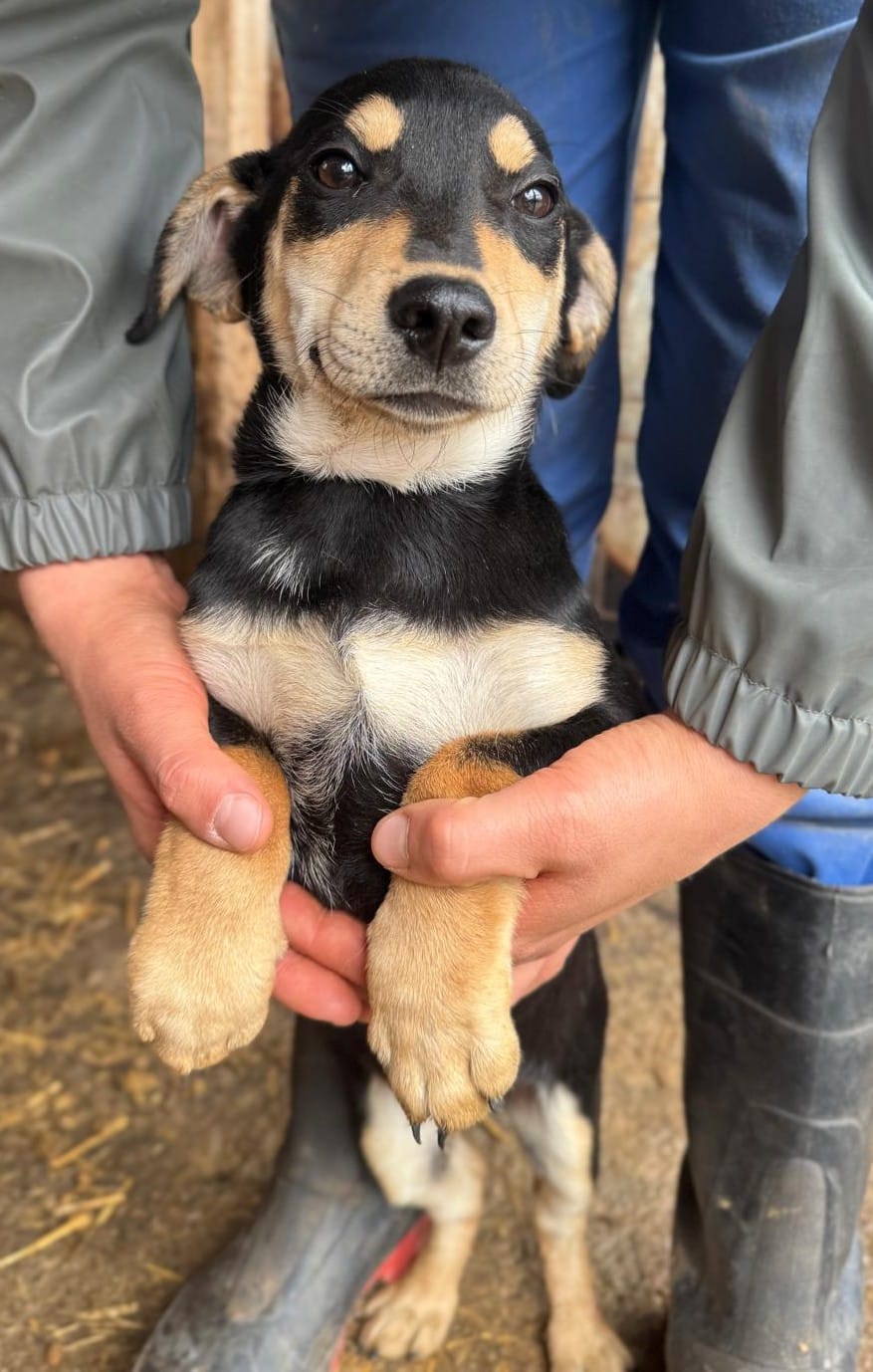 MAILY ist ein zuckersüßes, kleines Welpenmädchen. Sie sitzt mit acht weiteren Welpen und einer fremden Welpenmama in einem kleinen Kennel. Altersentsprechend ist MAILY neugierig, zutraulich, verschmust, welpentypisch und aufgeweckt. Wir konnten sie gut hochheben und überall anfassen und mit den Welpen in ihrem Kennel ist MAILY verträglich und verspielt. Sie hat einen Knubbel am Bauch, wahrscheinlich ein Nabelbruch. Wir haben es der zuständigen Tierärztin gemeldet. MAILY hat kurze Beinchen wie ein Dackel und wird wahrscheinlich nicht allzu groß werden.