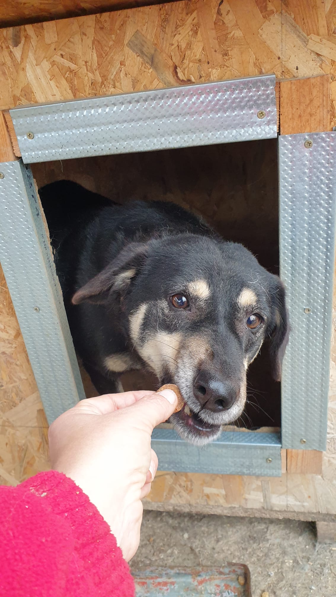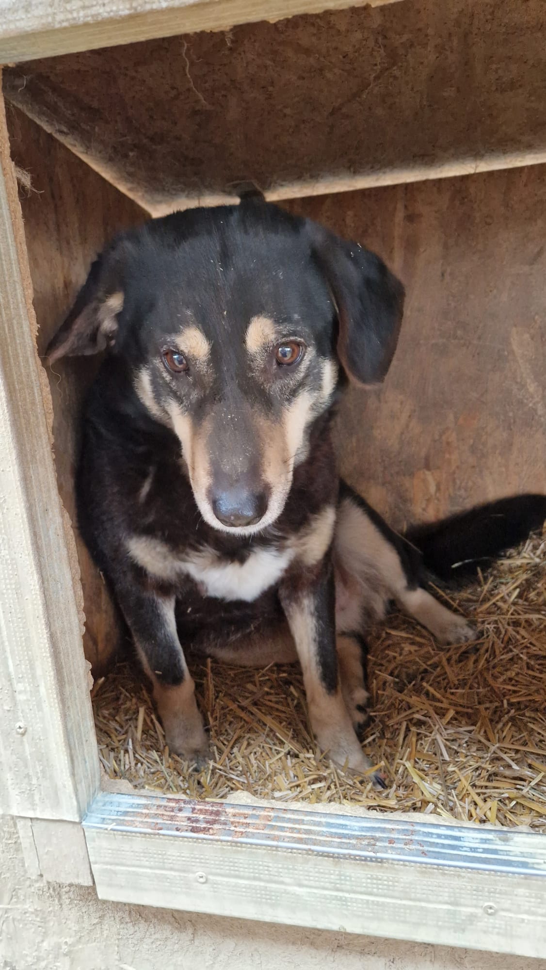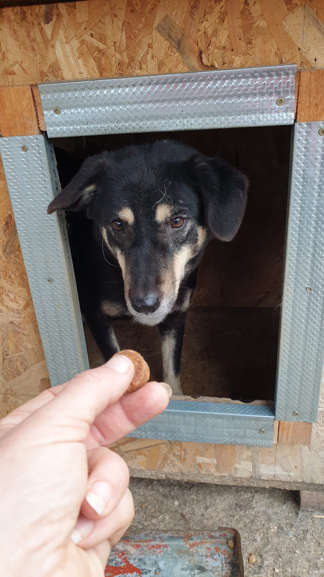 MANISHA ist aufgetaut und zeigt sich deutlich interessierter an Menschen. Neugierig schaute sie aus ihrer Hütte und beobachtete, was wir so machen. Sie war kurz davor, rauszukommen, aber dazu fehlte ihr dann doch der Mut. Sie nimmt Futter aus der Hand, aber streicheln konnten wir sie noch nicht.