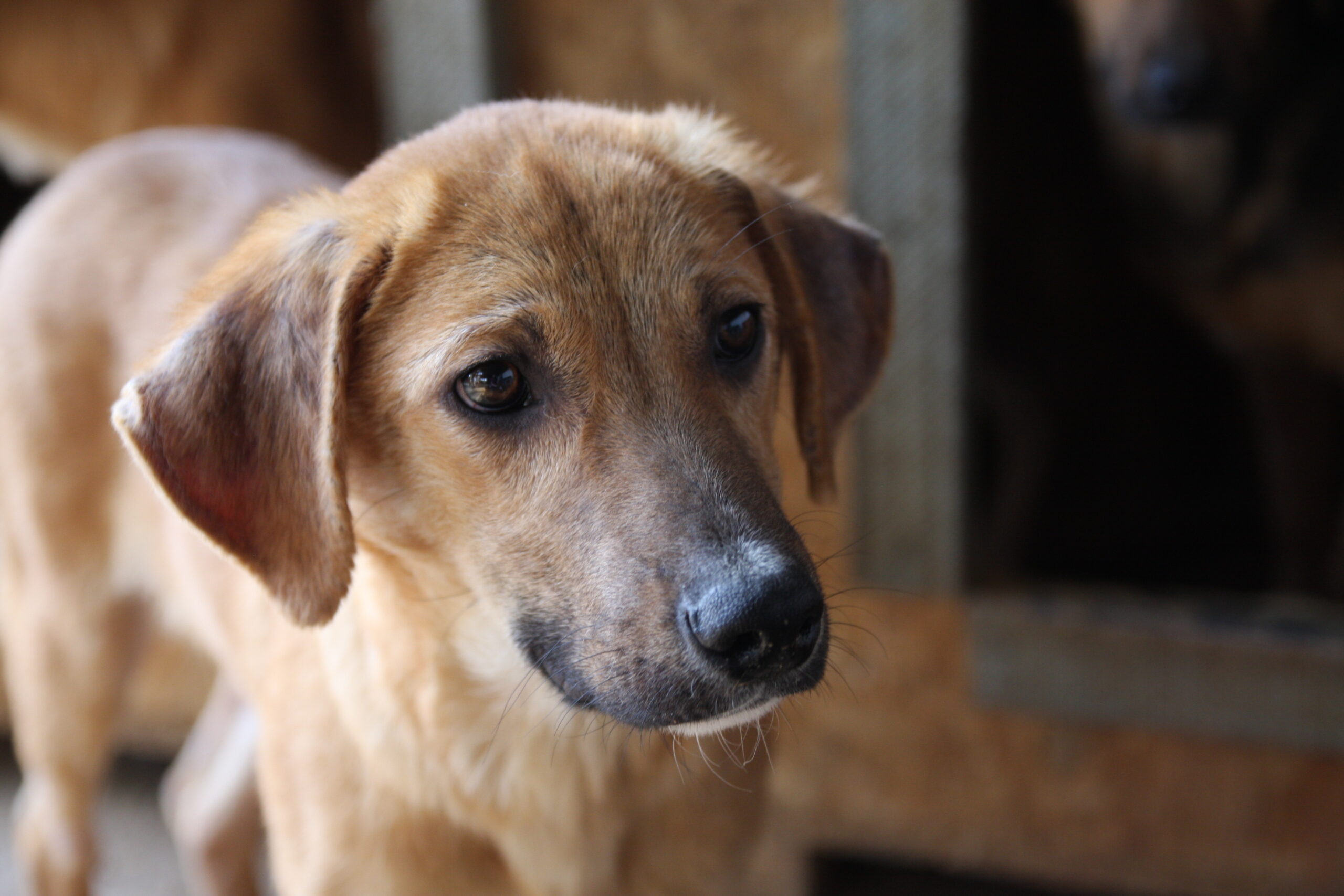 Ganz zaghaft und ein kleines bisschen freudig kam MANNO auch zu uns, als wir in seinem Kennel waren. Er traute sich das Leckerchen zu nehmen, auch wenn seine beiden Kumpels oft schneller waren. Aber er hat auch abgekommen. Seine dunklen Augen lassen einen nicht mehr los; sein fragender Blick birgt ein wenig Hoffnung; vielleicht auf einen Ausweg aus dem Shelter, auf ein Leben in Stille und Sicherheit? Wir wünschen es ihm sehr.