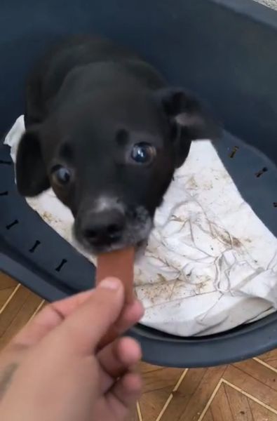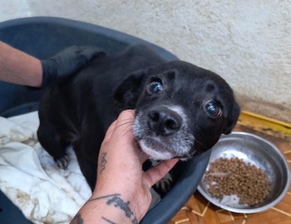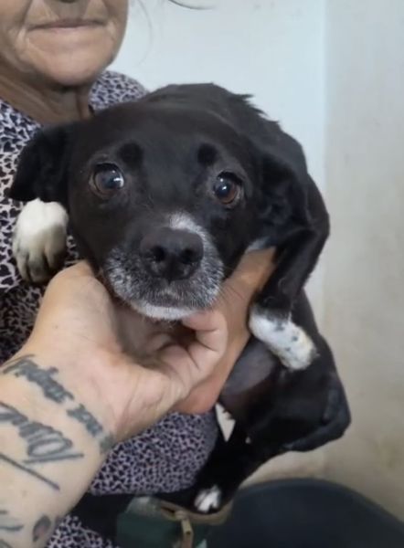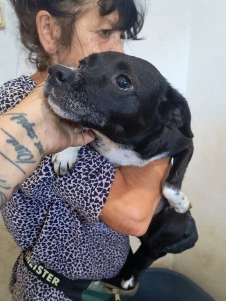 Diese nette Hündin ist anfangs etwas schüchtern. Wenn die Leckerlis schmecken, taut sie dann aber ganz schnell auf. Sie lässt sich überall anfassen und auch auf den Arm nehmen.