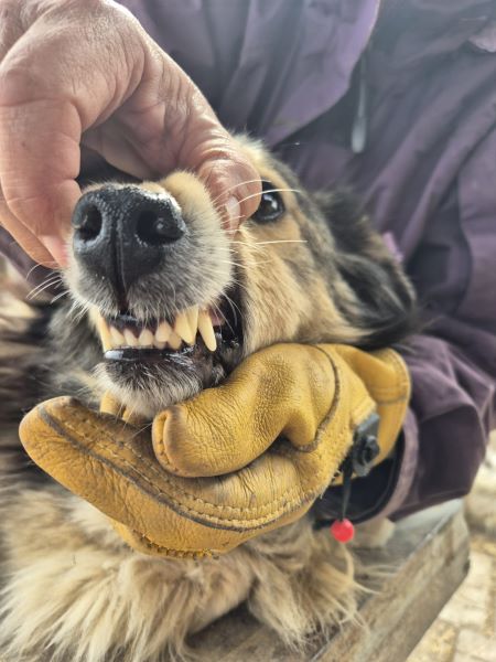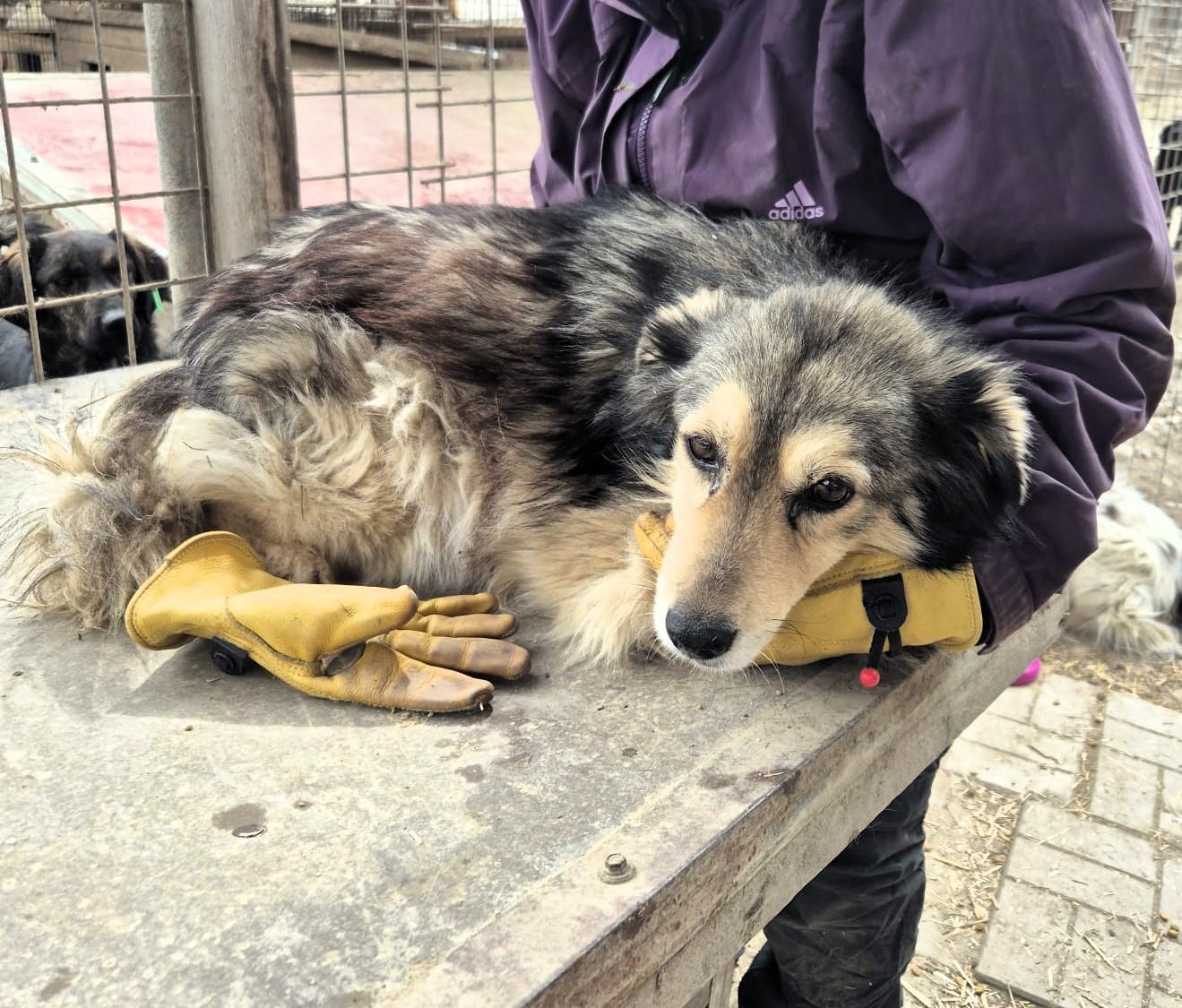 MANOU ist eine hübsche, wuschelige Hündin. Sie war zwar durchaus an uns interessiert, anfassen lassen wollte sie sich aber zunächst nicht. Erst als wir sie in der Hütte bedrängten, konnten wir sie gut streicheln. MANOU blieb dabei stets defensiv. Wir hatten den Eindruck, dass ihr Berührungen nicht fremd sind.