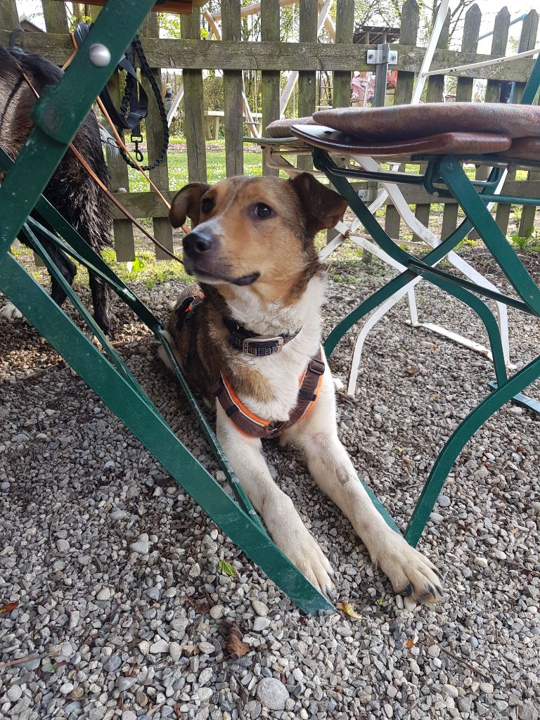 Pferde und Katzen haben wir schon getroffen, das war gar kein Problem. Auch ihre Biergartenqualitäten konnten wir schon testen: sehr tauglich. Maray saß gleich unter dem Tisch und beobachtete zuerst interessiert das Geschehen, danach hat sie einfach in bayerischer Gemütlichkeit mit ihren Hundekumpels geschlafen. Bei Begegnungen mit fremden Menschen ist Maray sofort freundlich, aber nie stürmisch. Sie lässt sich dabei auch anfassen.