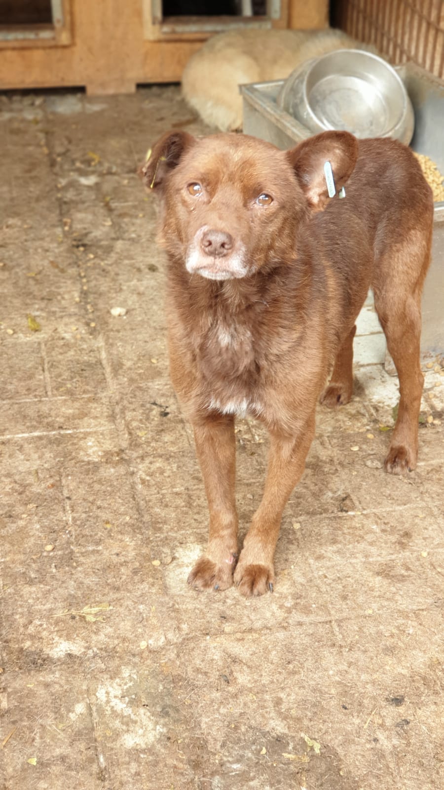 MARCELLINO saß anfangs nur in seiner Hütte, als wir in seinem Kennel waren. Als wir uns ihm zuwandten, machte er zunächst einen zurückhaltenden Eindruck, da er nicht aus ihrer Hütte wollte. Er ist noch recht neu in Bucov und scheint in seinem Kennel, der an sich schon stressig ist, das unterste Glied zu sein. Als Tierärztin Catalina diesen Kennel betrat, kam er sofort raus und wollte zu ihr. In diesem Moment sind die anderen Hunde sofort auf ihn losgegangen.