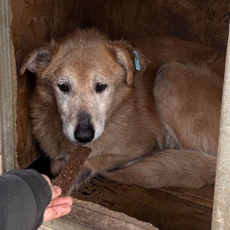 Die nette MARIA beobachtete uns neugierig, als wir den Kennel betraten, aber wollte eigentlich nichts mit uns zu tun haben. Leckerchen nahm sie aus der Hand – anfassen konnten wir sie nicht. Als wir sie in der Hundehütte bedrängten und mit der falschen Hand berührten, zeigte sie zunächst halbherziges Abschnappverhalten. Nur zwei Minuten später konnten wir sie bereits mit der Hand anfassen und streicheln. Genießen konnte sie dies jedoch noch nicht. Bei geduldigen und verständigen Menschen würde sie sich sicher schnell einleben können. Sie lebt in einem gemischten Rudel und scheint dort verträglich zu sein.