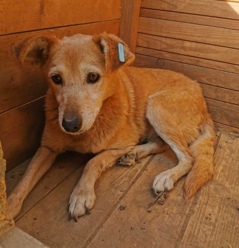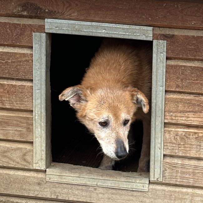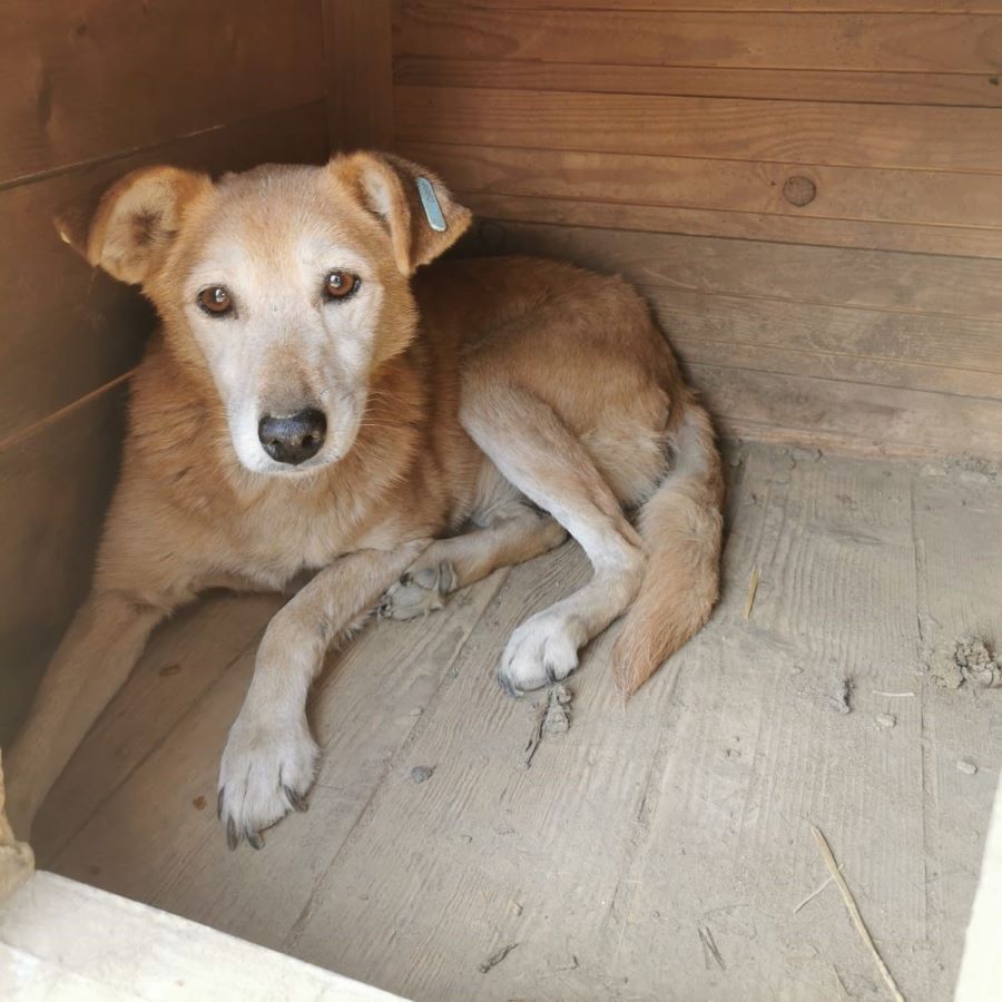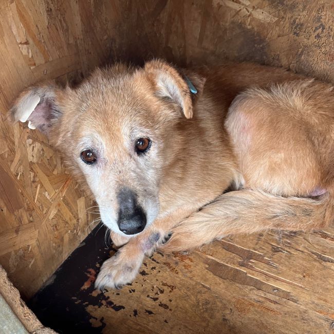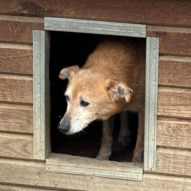 Diese ältere, schon etwas gebrechliche Hündin fanden wir zusammengekauert in ihrer Hütte vor. Viel zu dünn, geplagt von Hautproblemen und der Körper übersäht von alten Wunden scheint der Shelterstress ihr sehr zuzusetzen. Von unserem Besuch hielt MARIA nicht viel und so wich sie jeder Kontaktaufnahme aus und wechselte bei Bedrängung einfach in die nächste Hütte. Um MARIA nicht zusätzlich zu stressen, bedrängten wir sie nicht weiter.