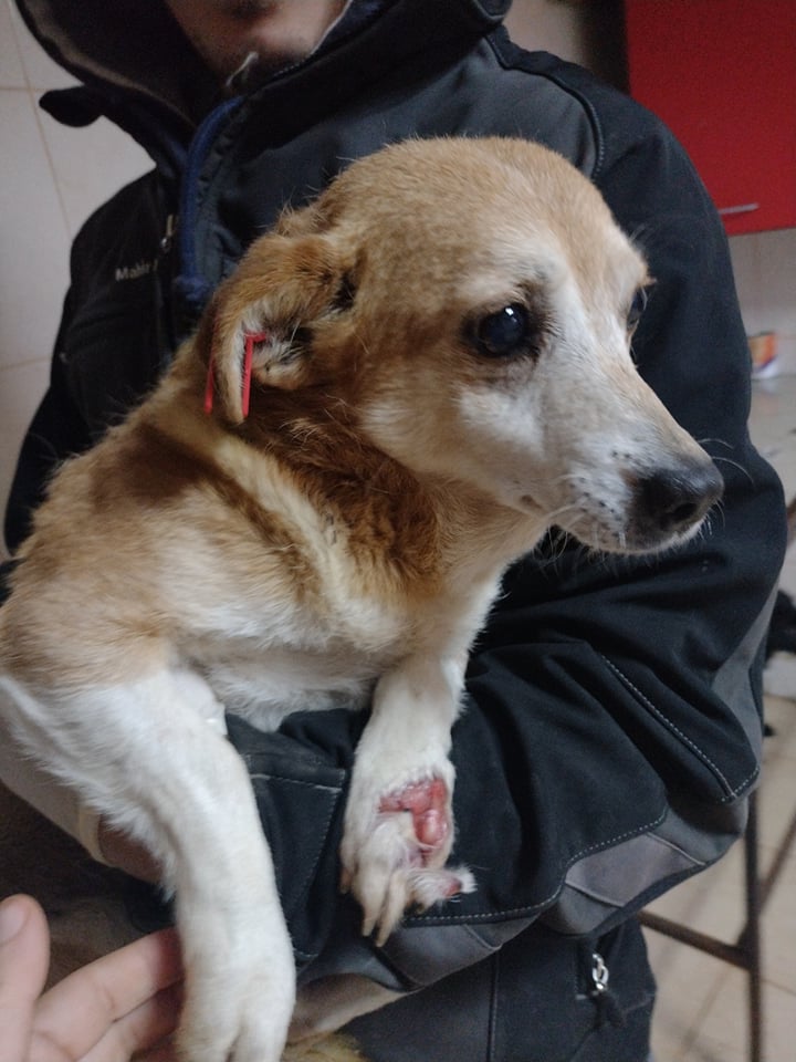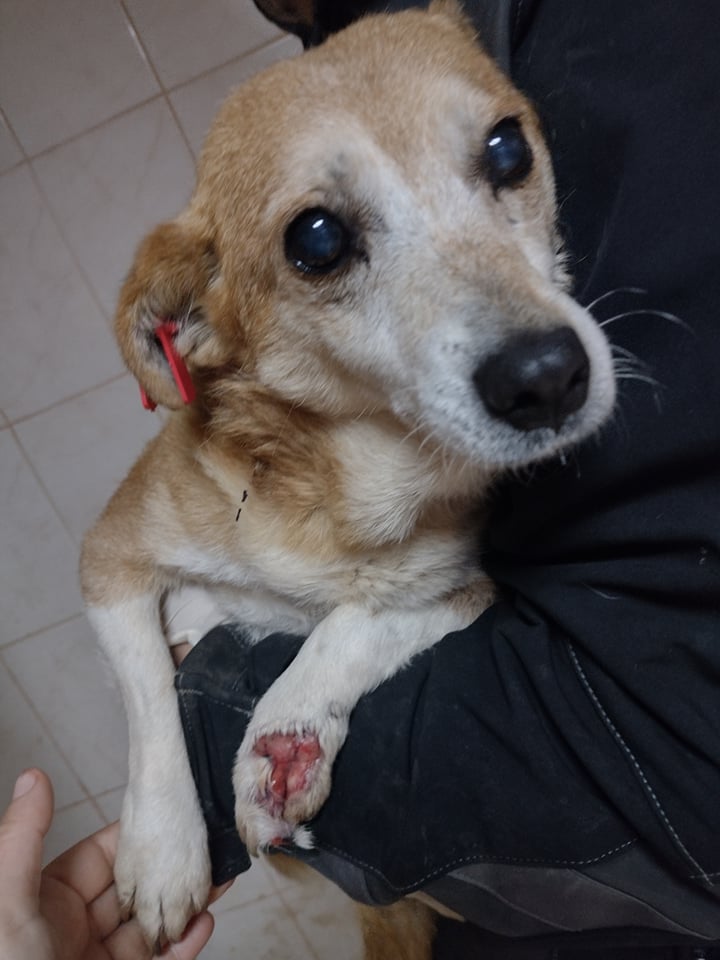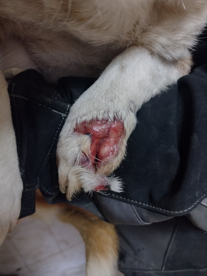 • wurde durch das Kennelgitter von anderen Hunden am Bein erwischt und verletzt