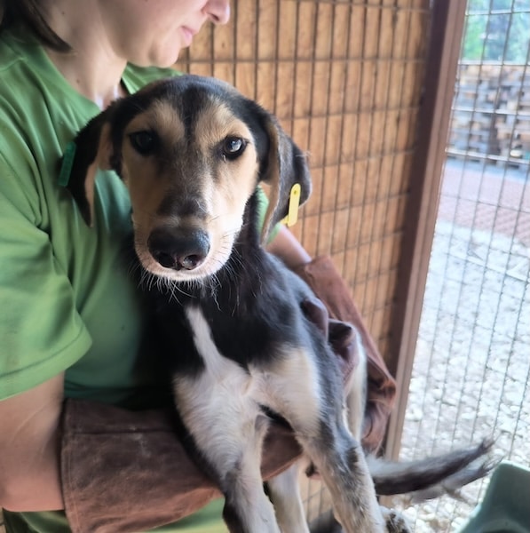 MARIJANA lebt zusammen mit Rüden und Hündinnen in einem Kennel. Dort scheint sie verträglich zu sein. Sie war etwas neugierig, versteckte sich allerdings in der Hütte vor uns. Dort konnten wir MARIJANA unter Bedrängung problemlos herausheben. Anfassbar war sie überall problemlos, geheuer war es ihr allerdings noch nicht. MARIJANA hielt die Berührungen sehr gut aus, war sich aber noch unsicher, wie sie die Situation einschätzen soll, sodass sie sich im Anschluss wieder in ihre Hütte zurückzog.